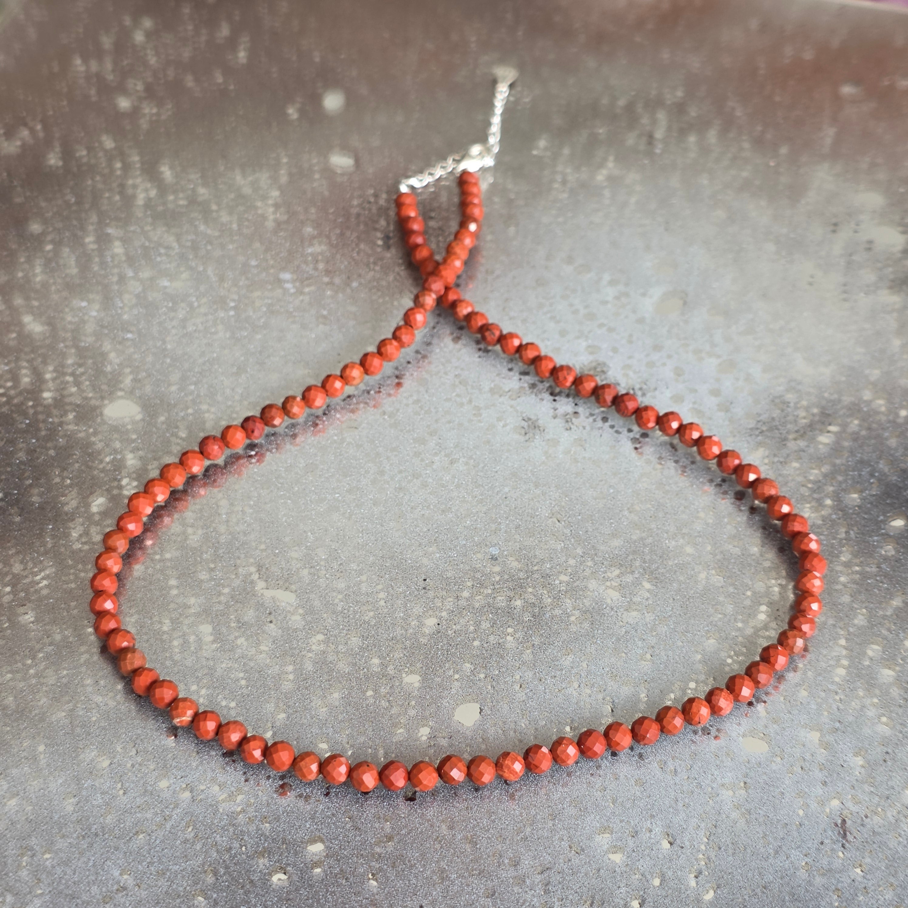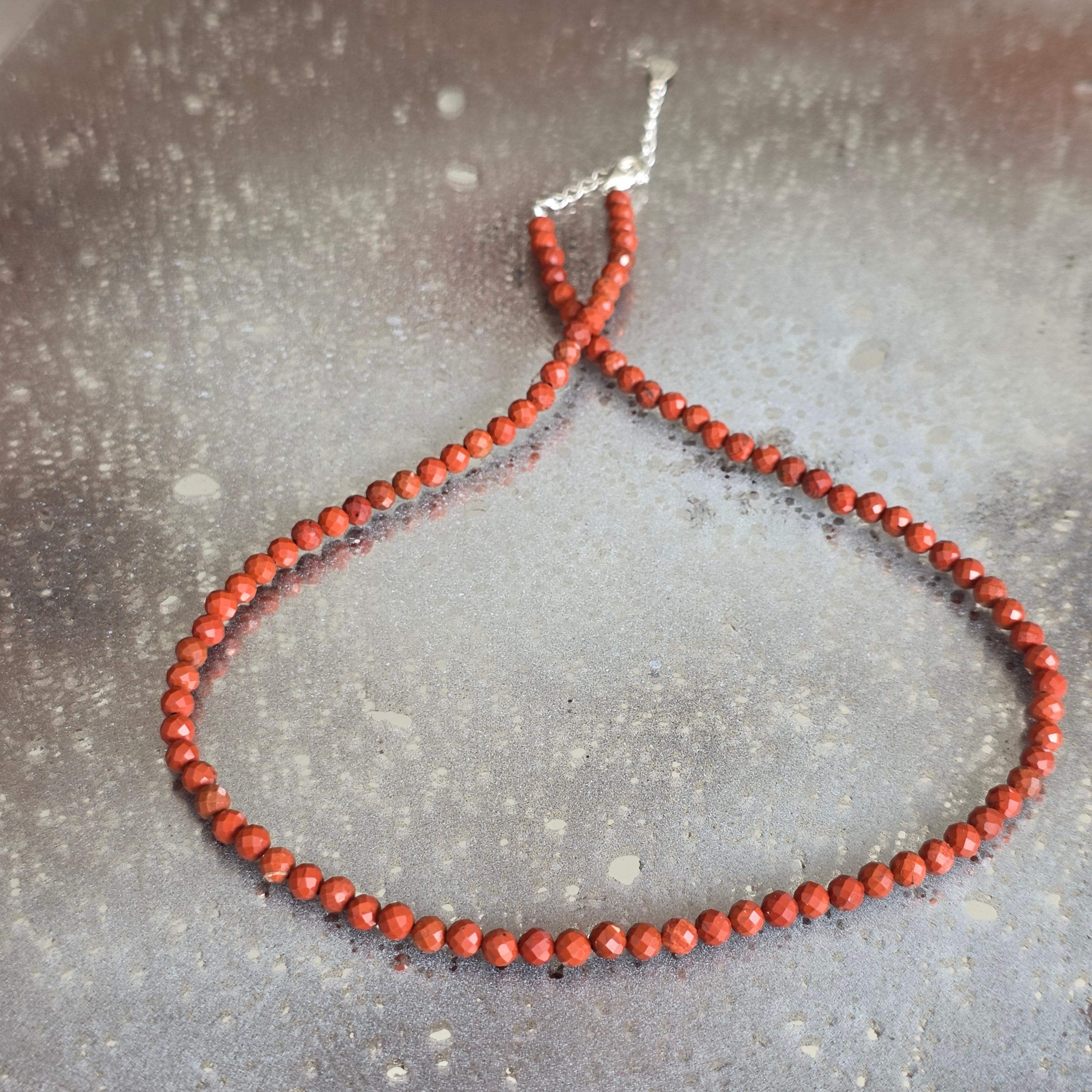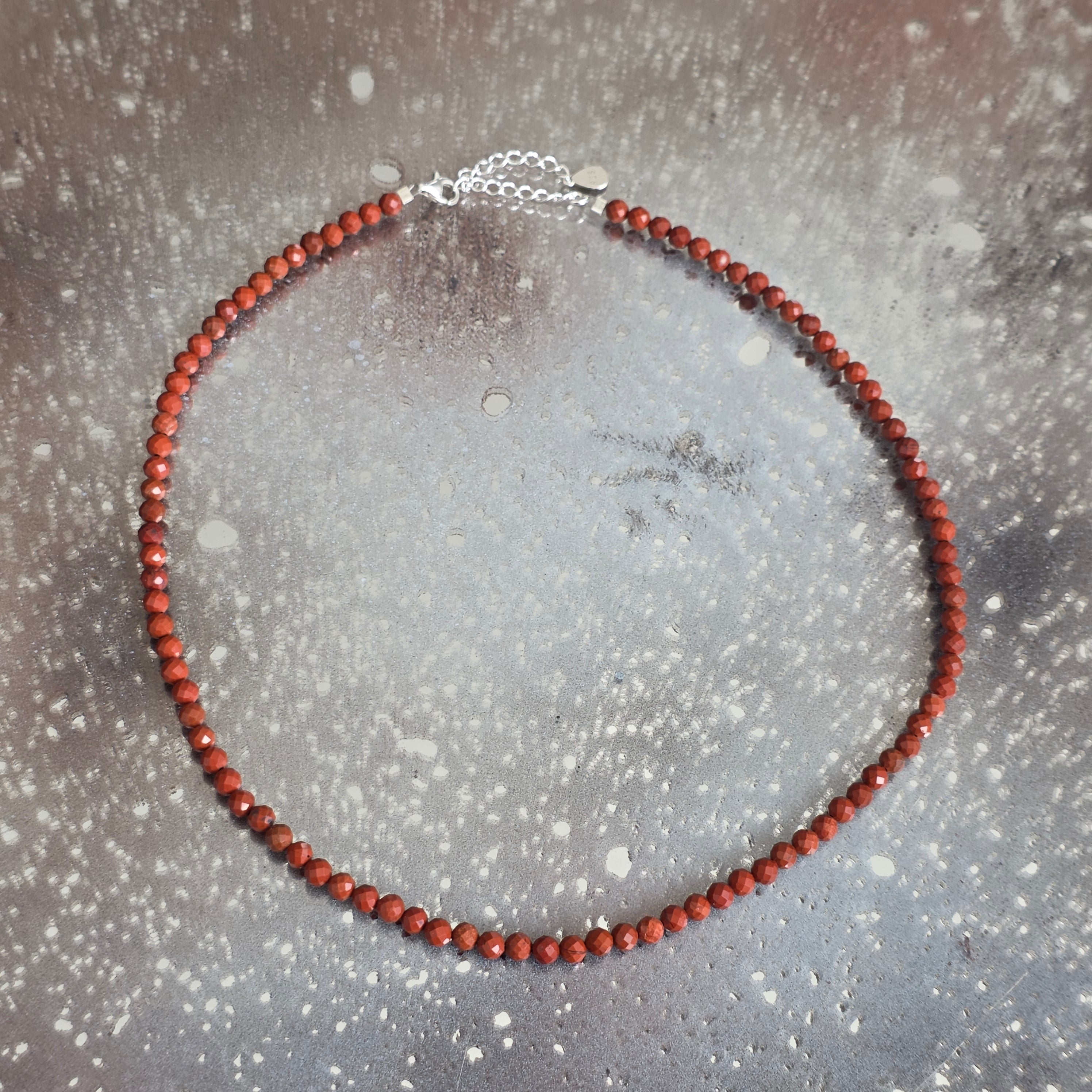Un collier qui porte en lui le feu de la vie et la passion de la terre. Le jaspe rouge, connu comme la pierre de vitalité et de courage, brille dans des nuances vives, et les facettes délicates des sphères de 4 mm laissent la lumière danser sur leur surface, amplifiant l'intensité de la couleur.