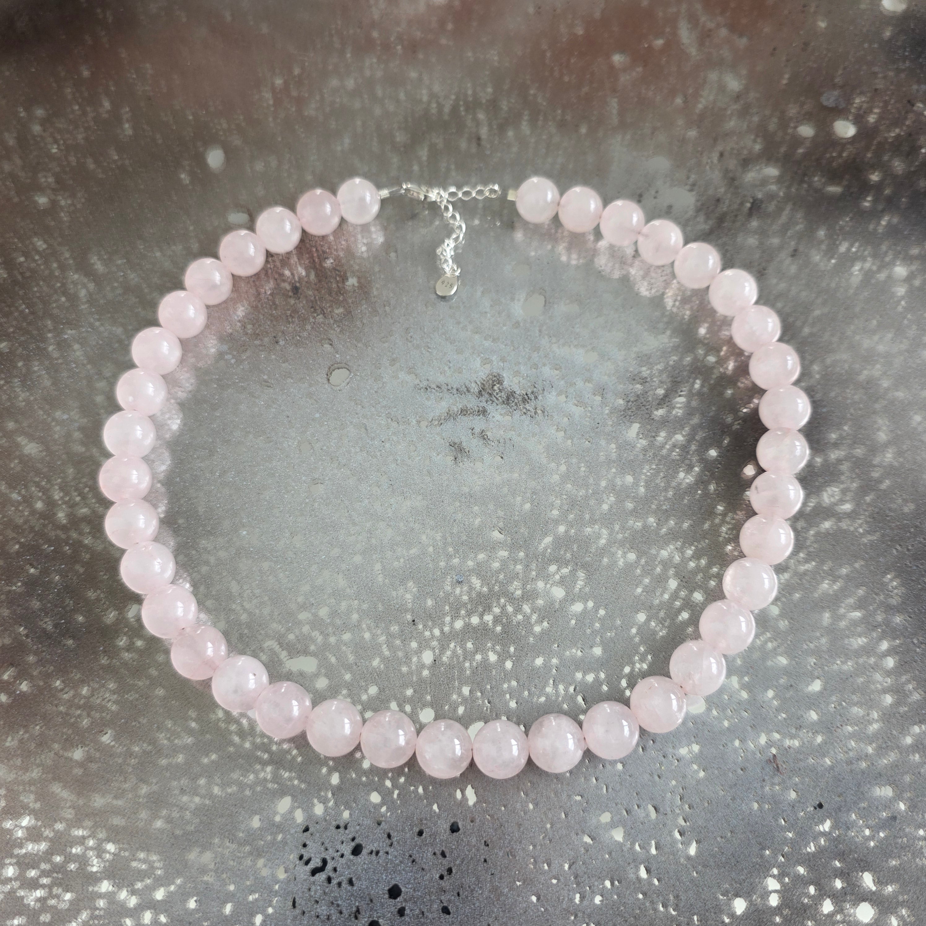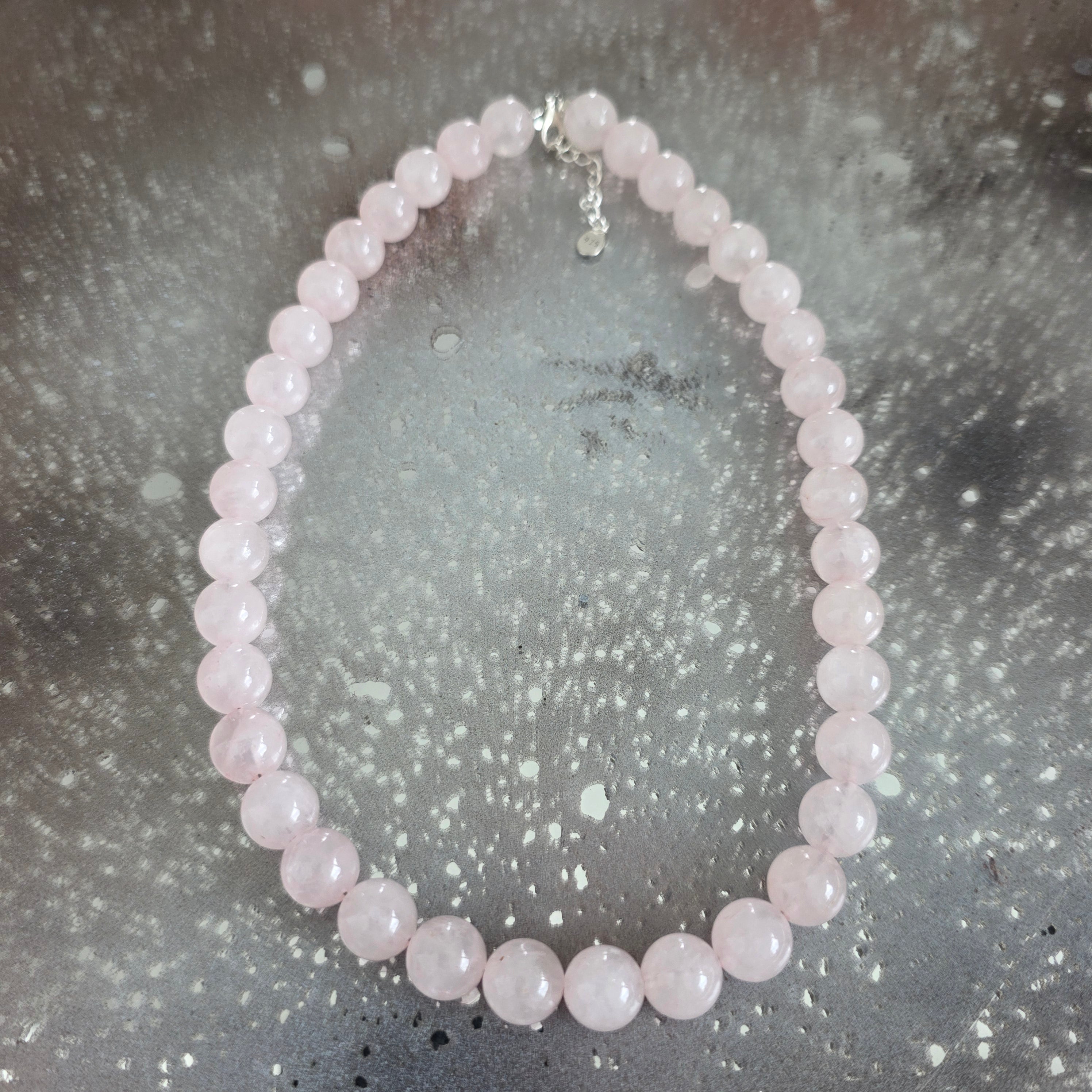 Matériaux : quartz rose naturel poli (perles de 10 mm), fermeture en argent