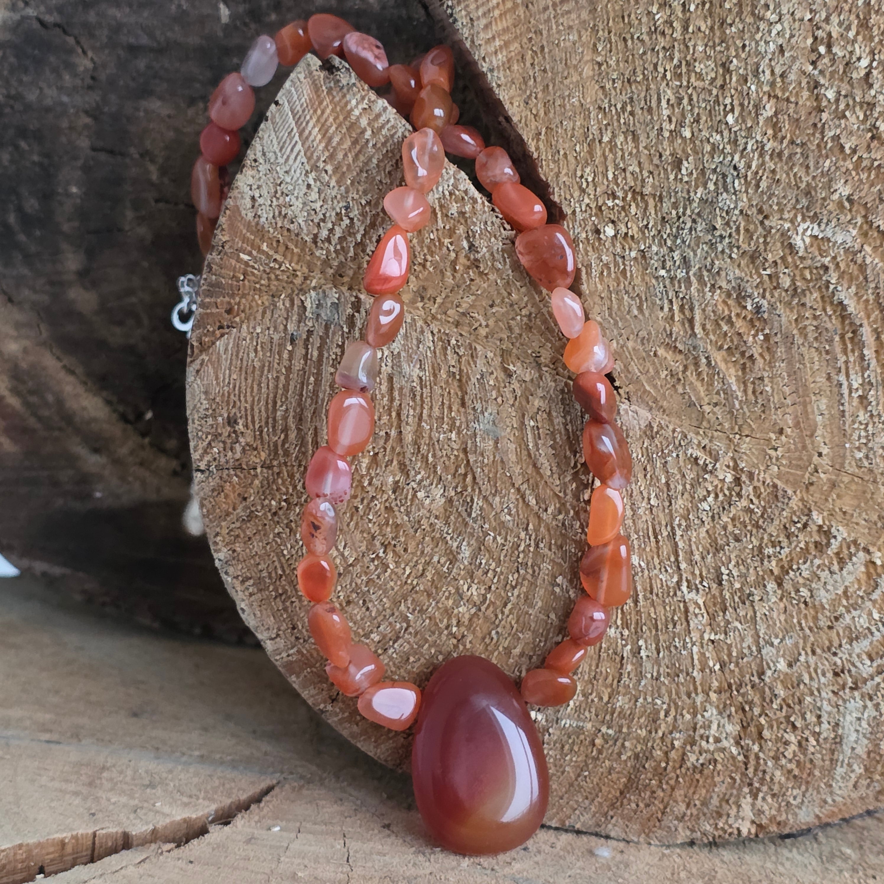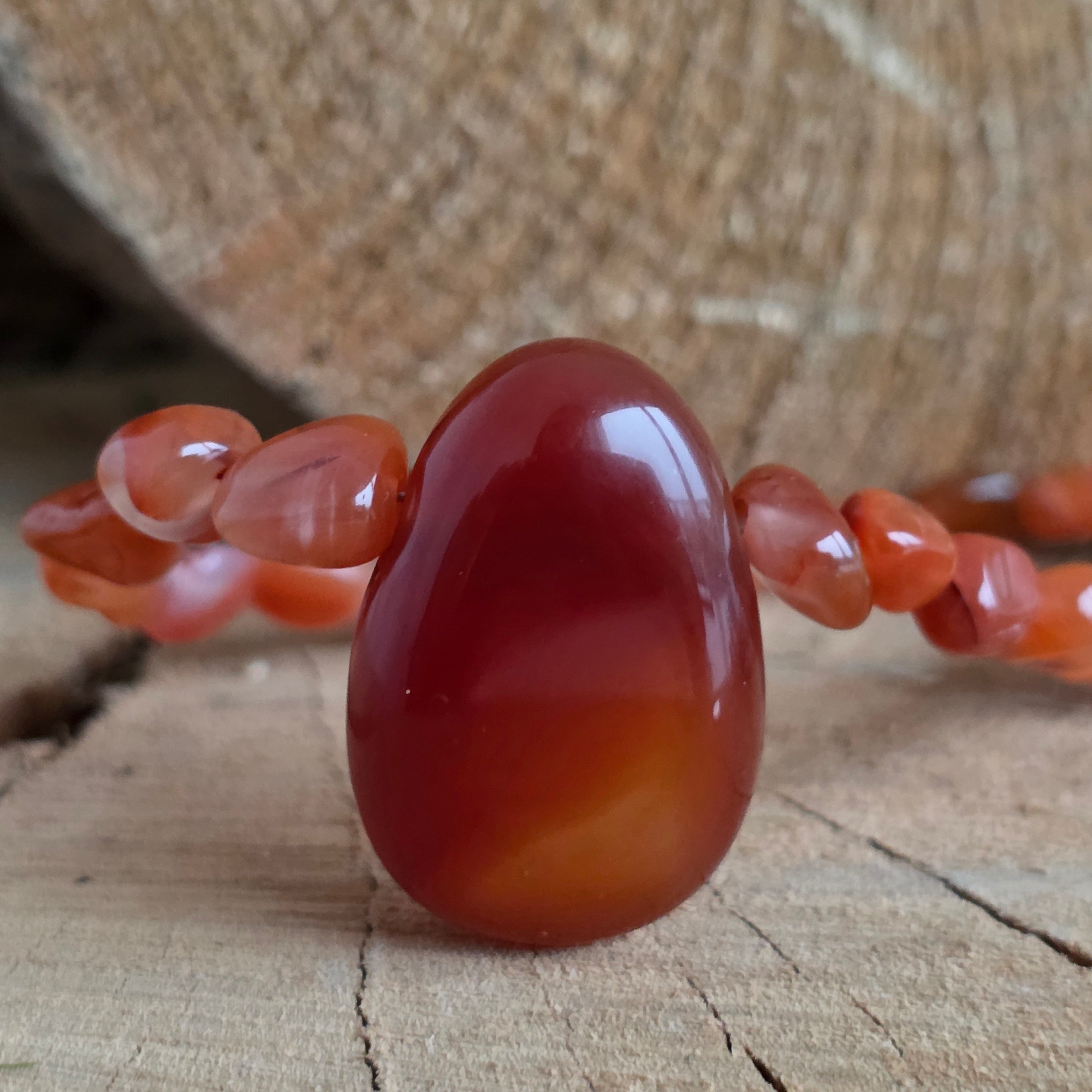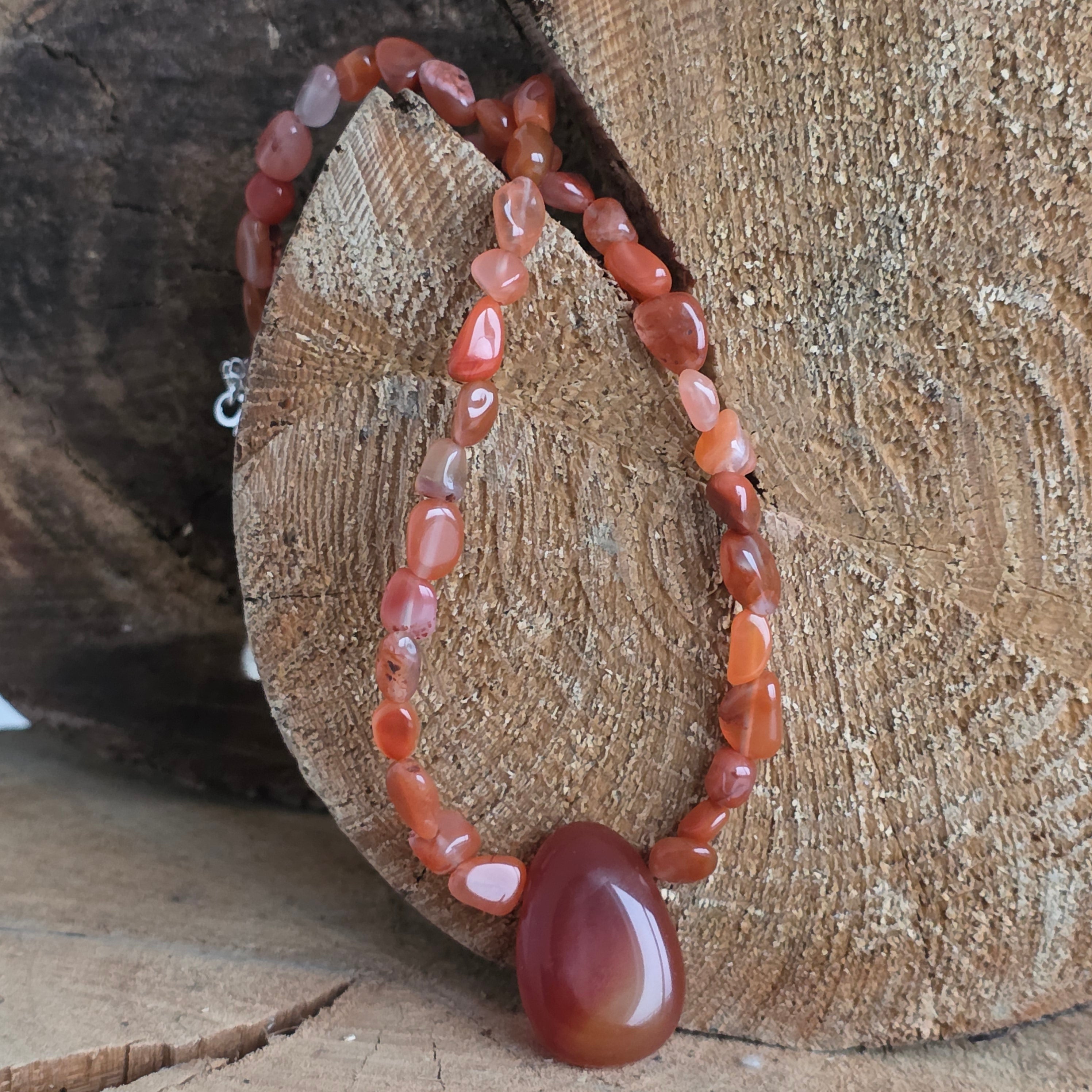 Au centre du bijou, un pendentif en forme de goutte d'environ 3 cm en cornaline apporte un accent fort et centré – comme une étincelle minérale qui touche votre peau exactement là où le courage prend racine.