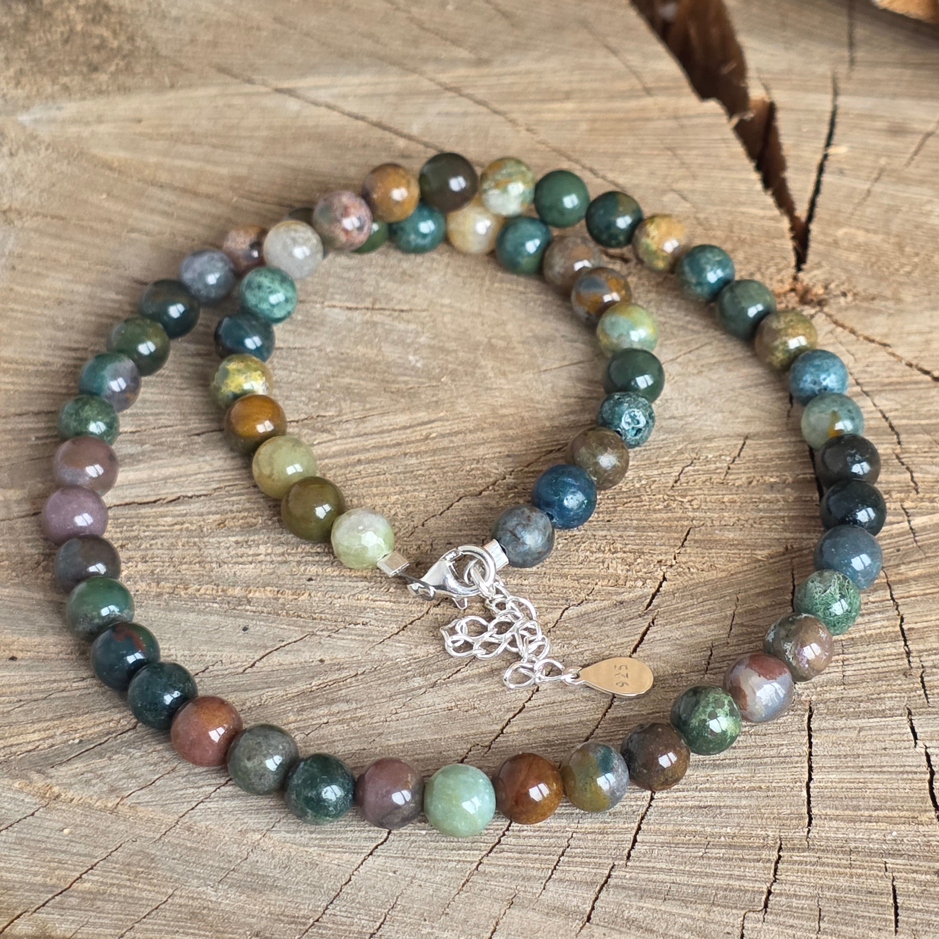 Un collier qui semble rassembler en lui les couleurs de la terre – le vert tranquille, le marron chaud, les accents subtils de rouge et de crème – comme un paysage intérieur en constante transformation. Réalisé en agate indienne naturelle, avec des perles de 6 mm, cette pièce a une présence plus ample, mais reste équilibrée et harmonieuse.