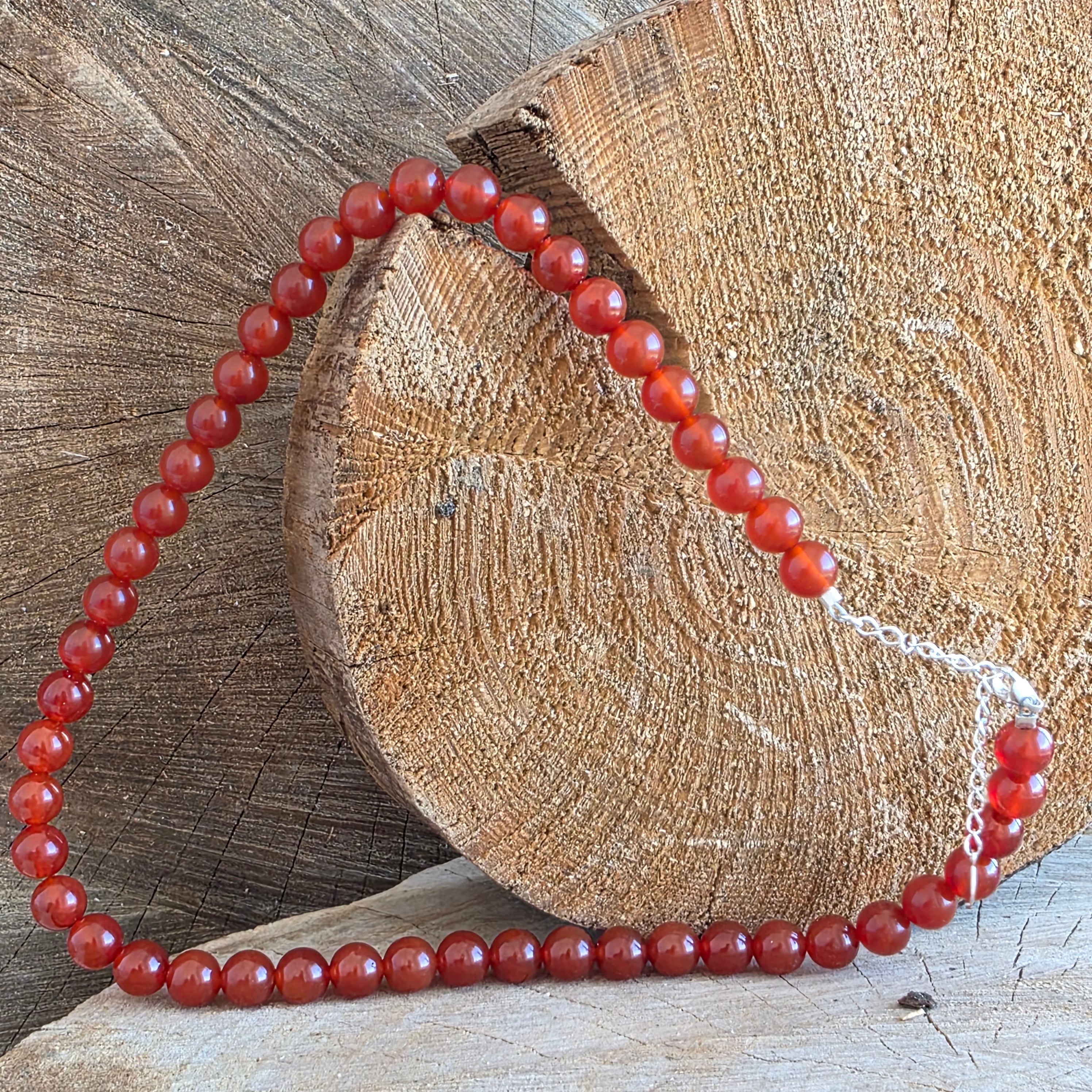 Un collier à la présence chaleureuse et vibrante, réalisé avec des perles de cornaline de 6 mm, qui s'harmonisent autour du cou, formant une ligne ronde et équilibrée. Les nuances riches d'orange et de rouge brûlé, parfois teintées de variations translucides, mettent en valeur le caractère vivant de la pierre, tandis que la forme sphérique accentue la sensation de continuité et de fluidité visuelle. Le design est épuré et intemporel, laissant la couleur et la texture naturelles de la cornaline être au premier plan.
