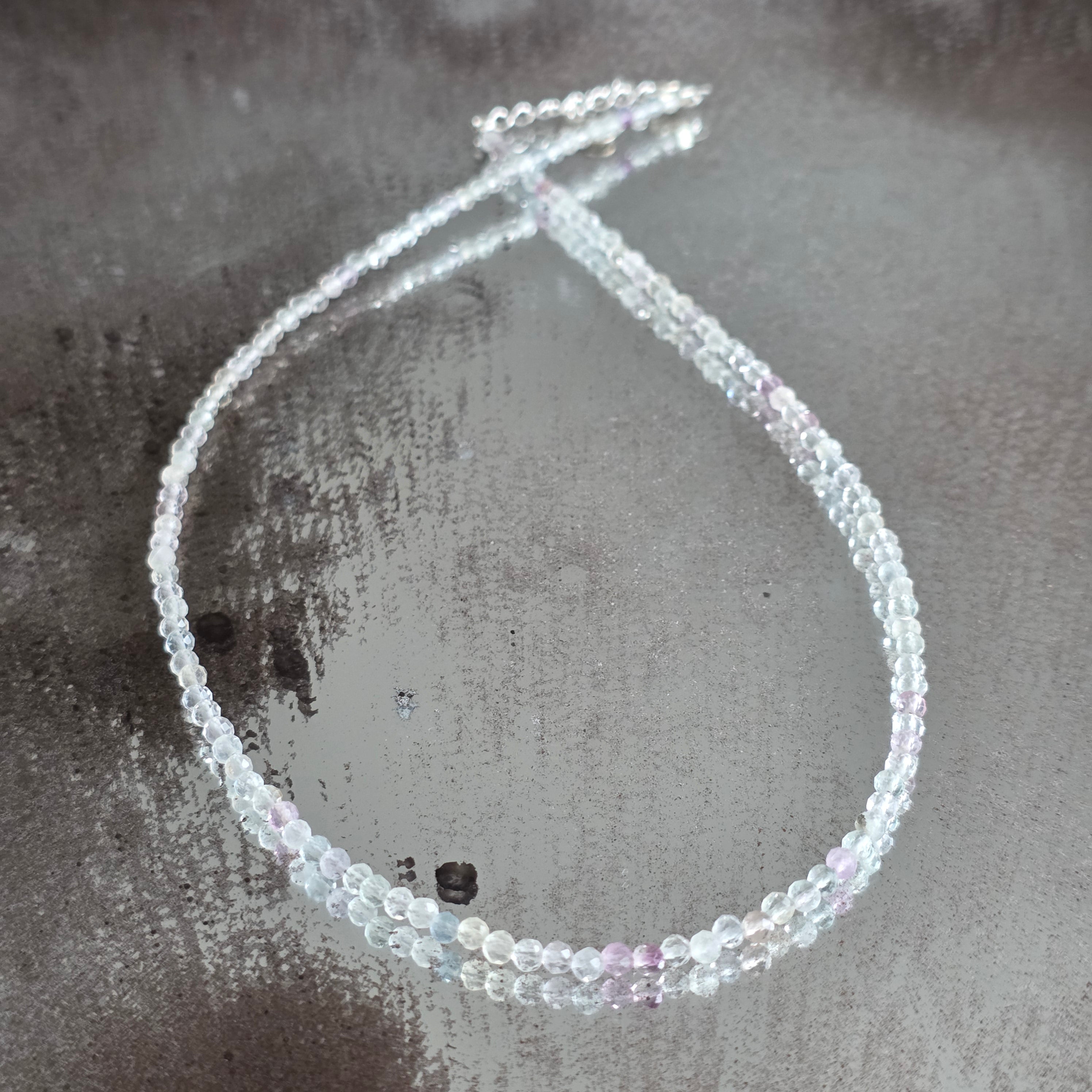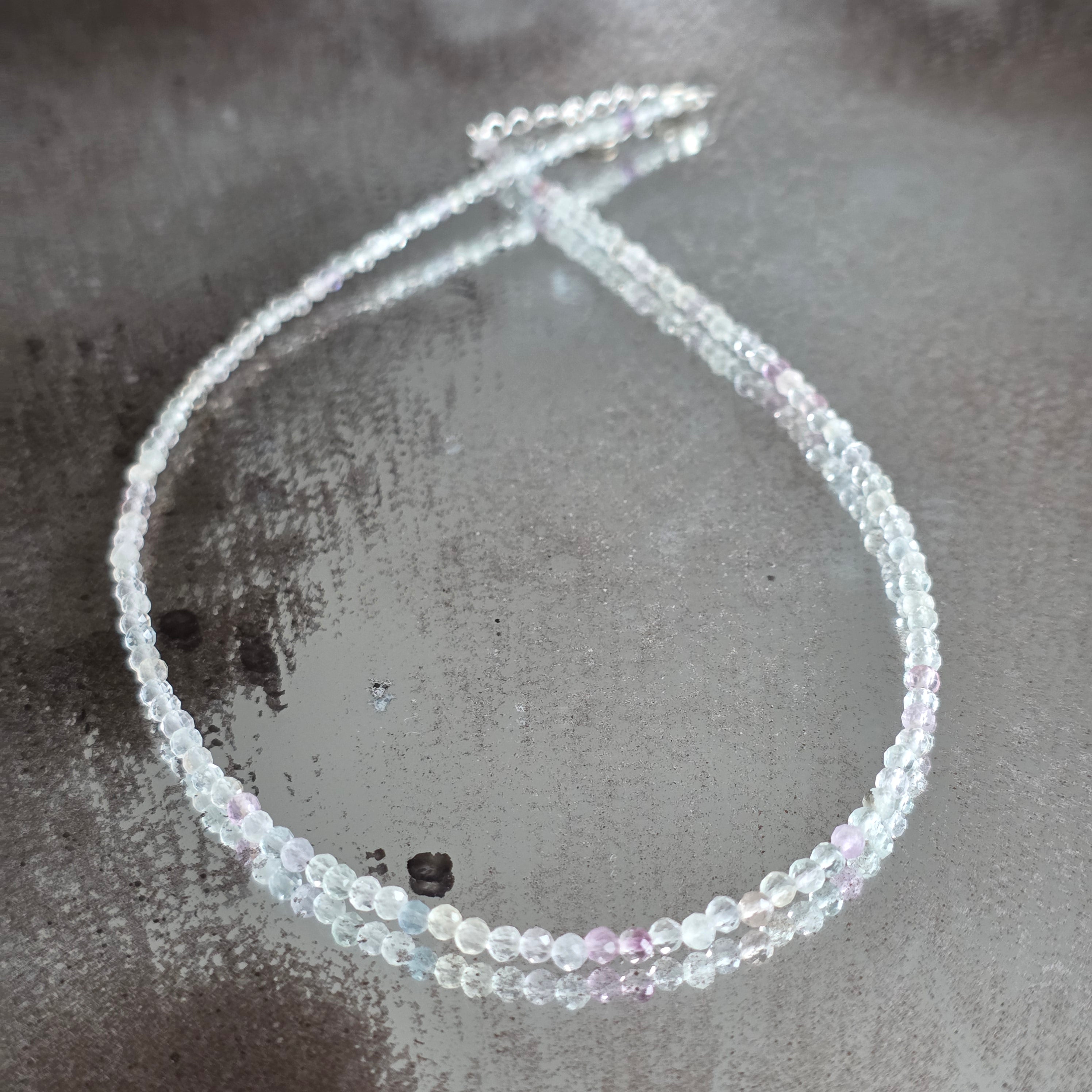 Un collier comme une fenêtre ouverte sur la lumière – vif, clair, joueur et profond à la fois. Les perles taillées de fluorite arc-en-ciel de 3 mm brillent dans des nuances qui dansent entre violet, vert, bleu et rose, comme un pont entre émotion et raison, entre rêve et lucidité.