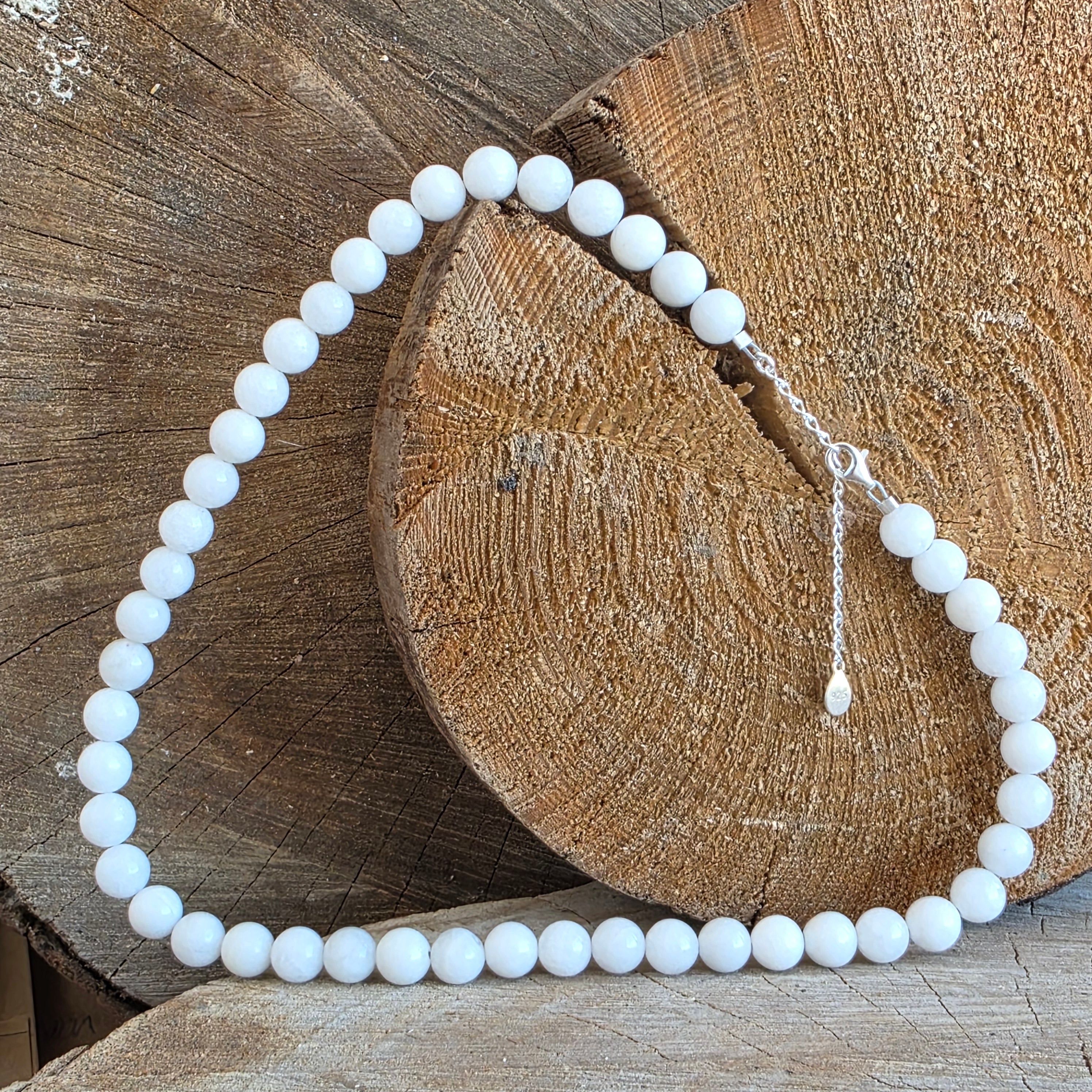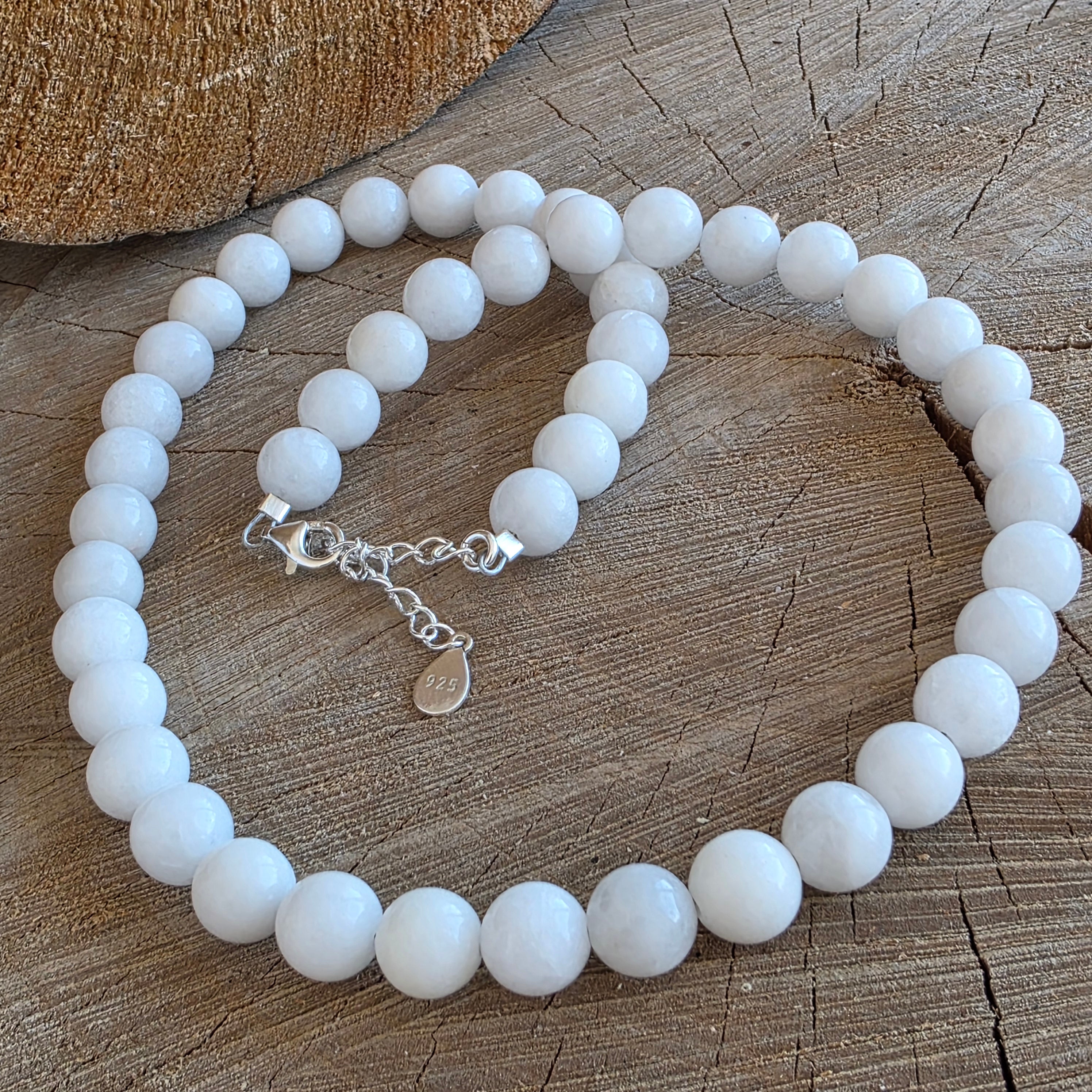 Un collier au charme calme et raffiné, composé de perles facettées de jade blanc de 6 mm, qui s'installent harmonieusement autour du cou, formant une ligne équilibrée et lumineuse. Le blanc laiteux, parfois légèrement translucide, confère à la pierre une expression pure et ordonnée, tandis que la délicate facettage ajoute des reflets subtils qui mettent en valeur la texture naturelle sans surcharger visuellement le bijou. Le design est épuré et intemporel, parfait pour un port quotidien ou pour des touches élégantes.