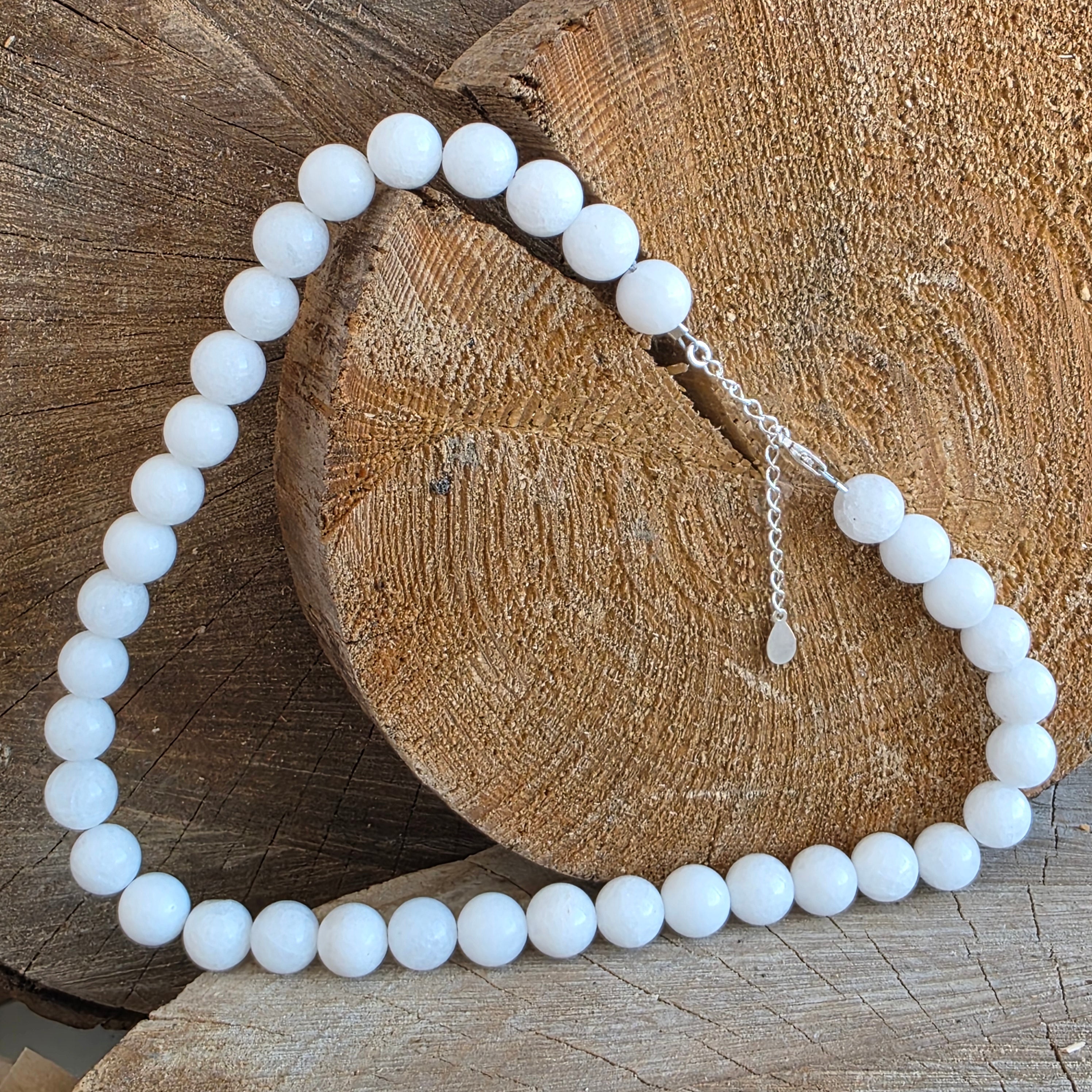 Un collier à la présence calme et raffinée, réalisé en perles de jade blanc de 6 mm, qui s'ajustent harmonieusement autour du cou, formant une ligne équilibrée et lumineuse. Le blanc laiteux, parfois légèrement translucide, confère à la pierre une expression pure et ordonnée, tandis que la taille fine ajoute des reflets discrets qui valorisent la texture naturelle sans surcharger visuellement le bijou. Le design est épuré et intemporel, adapté au port quotidien ou pour des touches élégantes.