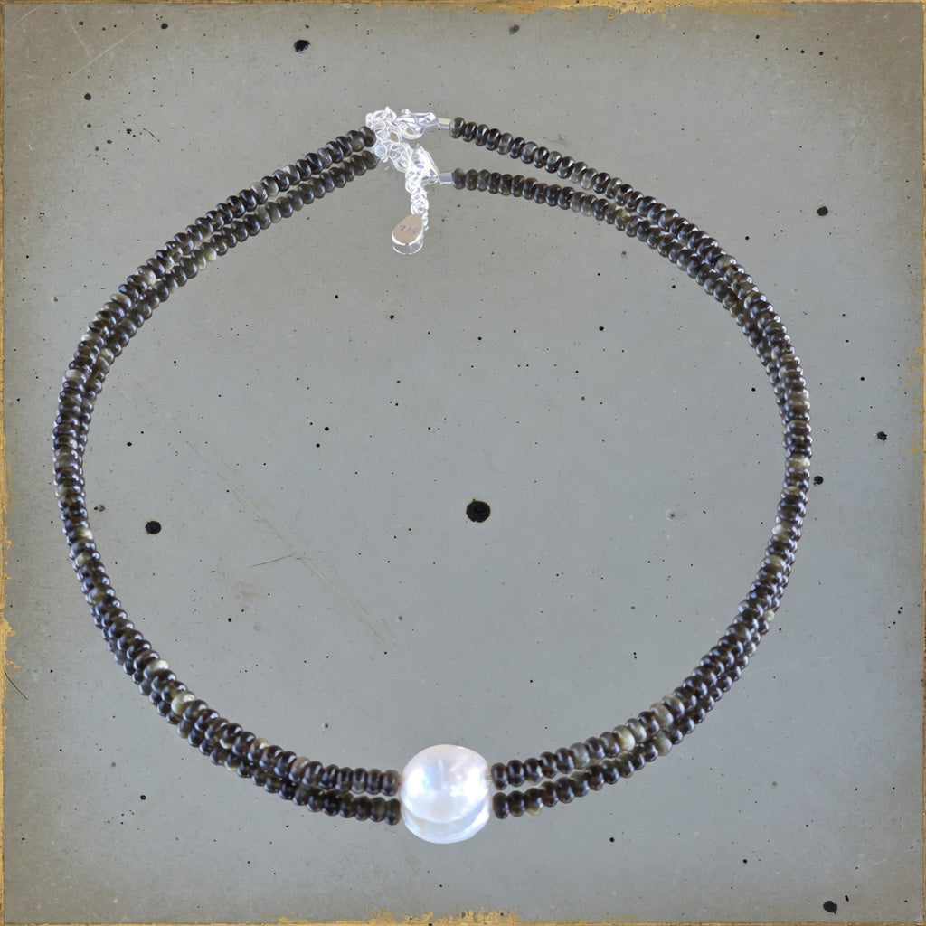 Un collier au design raffiné et au contraste équilibré, réalisé à partir de disques fins d'obsidienne dorée de 4 × 2 mm, disposés dans une succession fluide qui dessine délicatement la ligne du cou. La surface noire, traversée de reflets dorés subtils, crée un jeu élégant de lumière et de profondeur, tandis que la perle centrale, d'environ 1 cm, apporte un accent lumineux et organique, qui équilibre visuellement la composition.