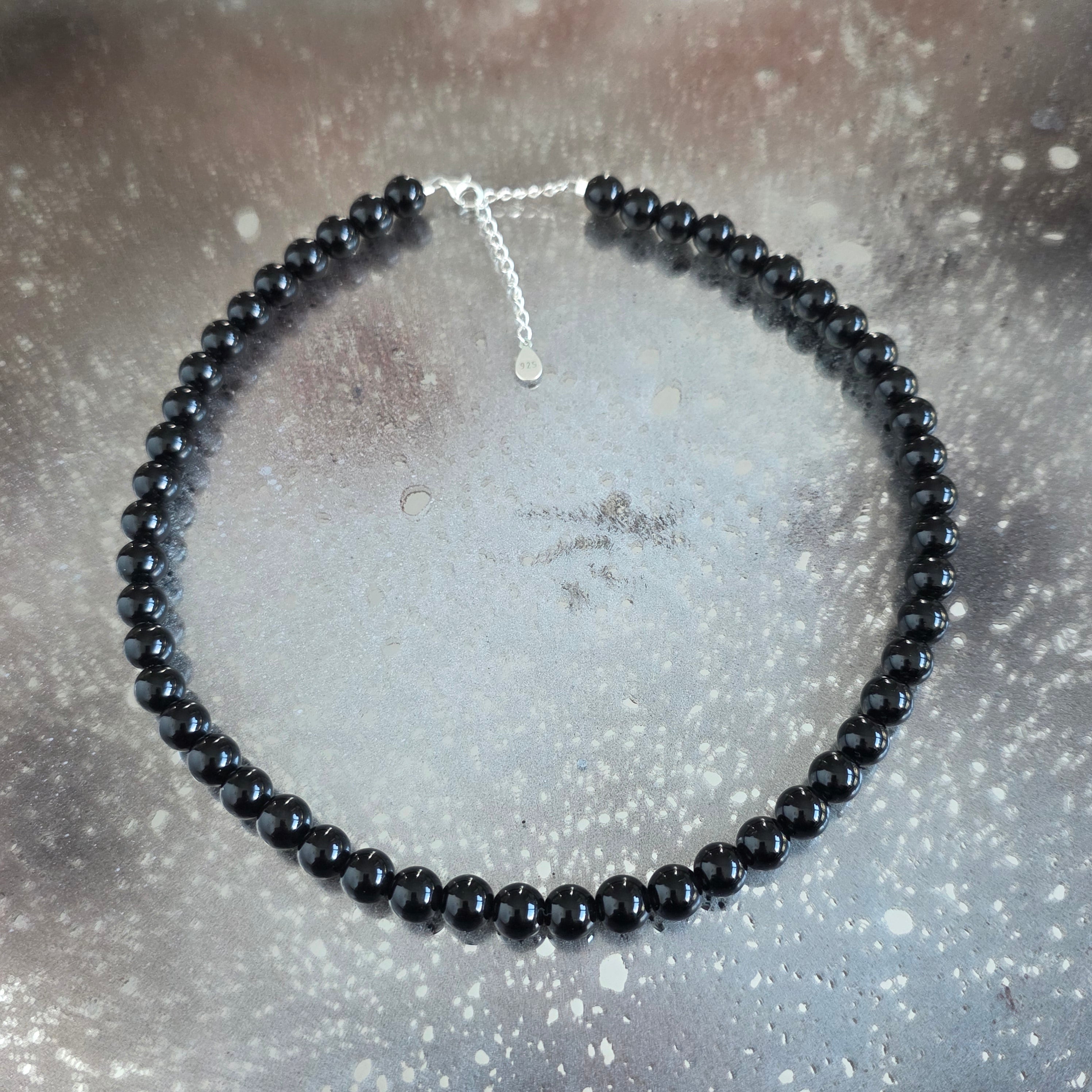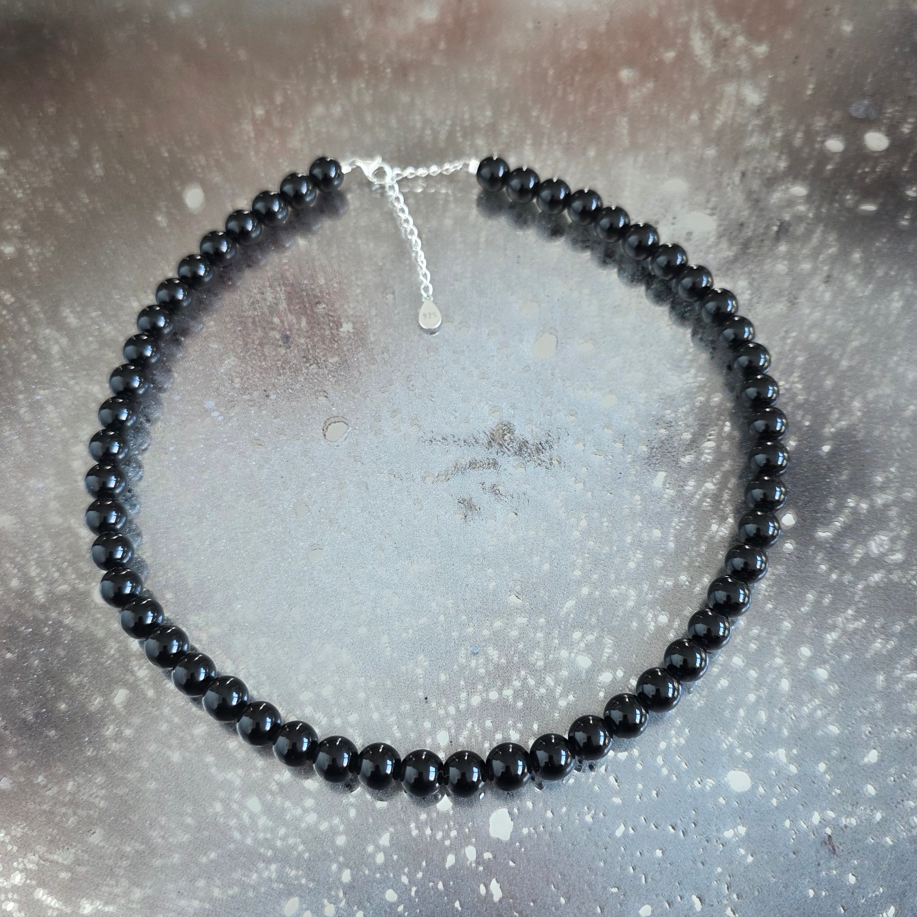 Un collier fin et intense, réalisé avec des perles d'obsidienne noire de 8 mm, qui crée une ligne délicate mais bien définie autour du cou. Le noir profond, avec une brillance vitrée discrète, capte la lumière en reflets fins, presque graphiques, offrant au bijou une allure moderne et équilibrée. La petite taille des perles préserve le design minimaliste, mettant en valeur la pureté de la forme et la clarté visuelle.