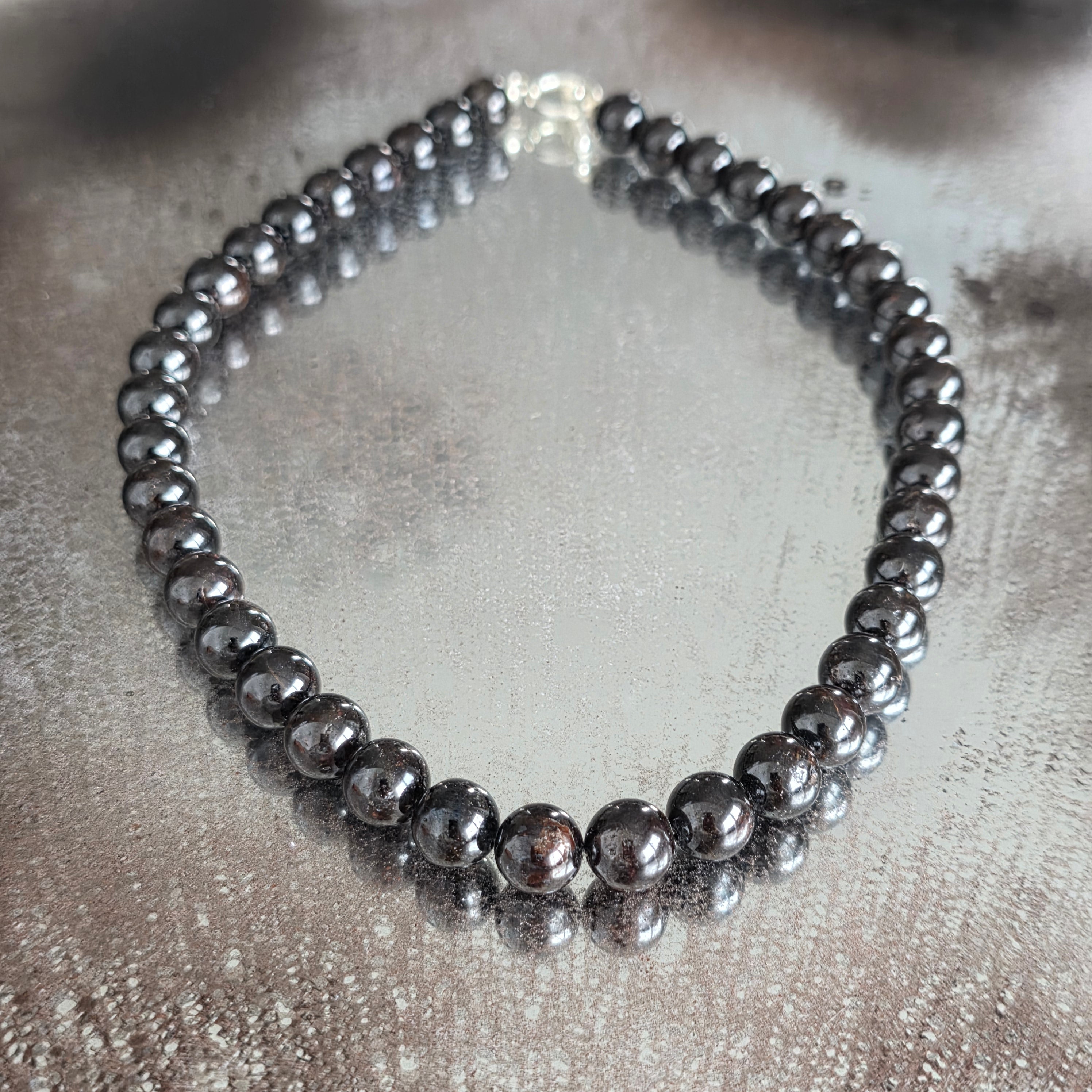 Un collier qui porte le feu de la terre et l'élégance noble de la profondeur. Le grenat naturel, avec ses tons rouge foncé et ses reflets subtils de vin rubis, évoque la passion vive, l'énergie vitale et la force intérieure. Chaque sphère de 10 mm est comme un cœur minéral, plein de vie et de lumière secrète.