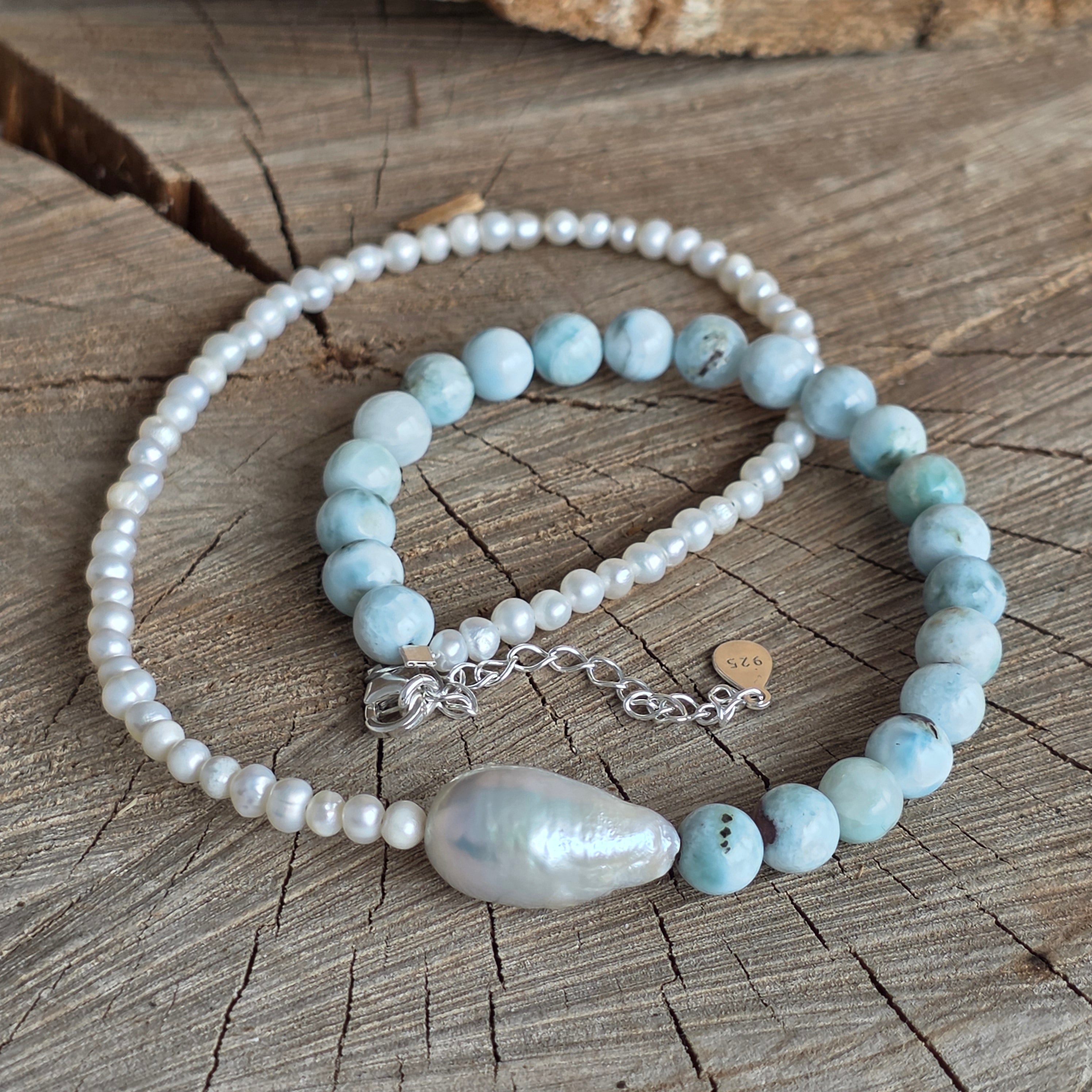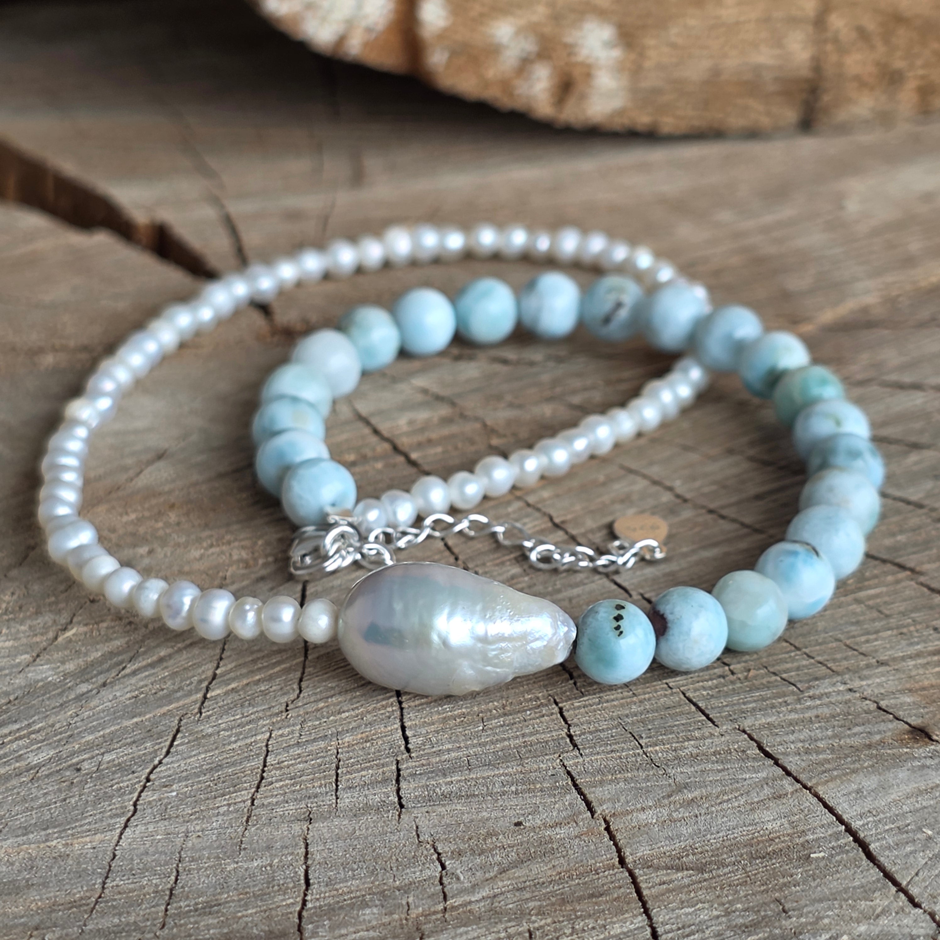 Matériaux : larimar naturel (sphères de 6 mm), perles de culture (sphères de 3 mm), perle baroque, argent 925, fermoir lobster en argent