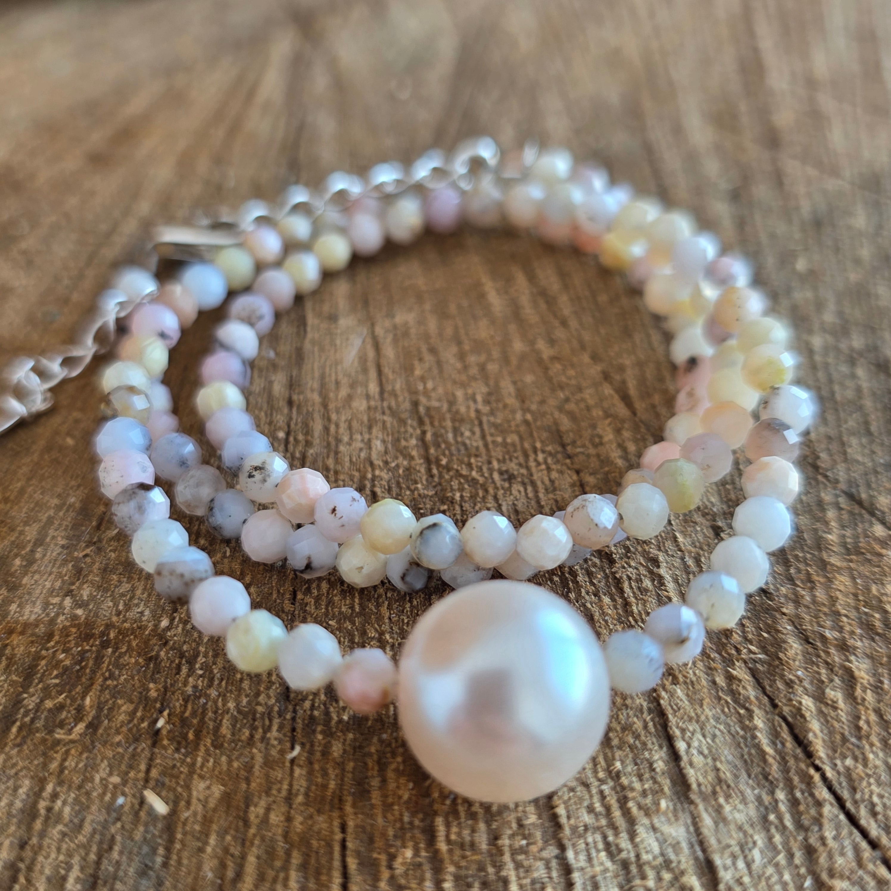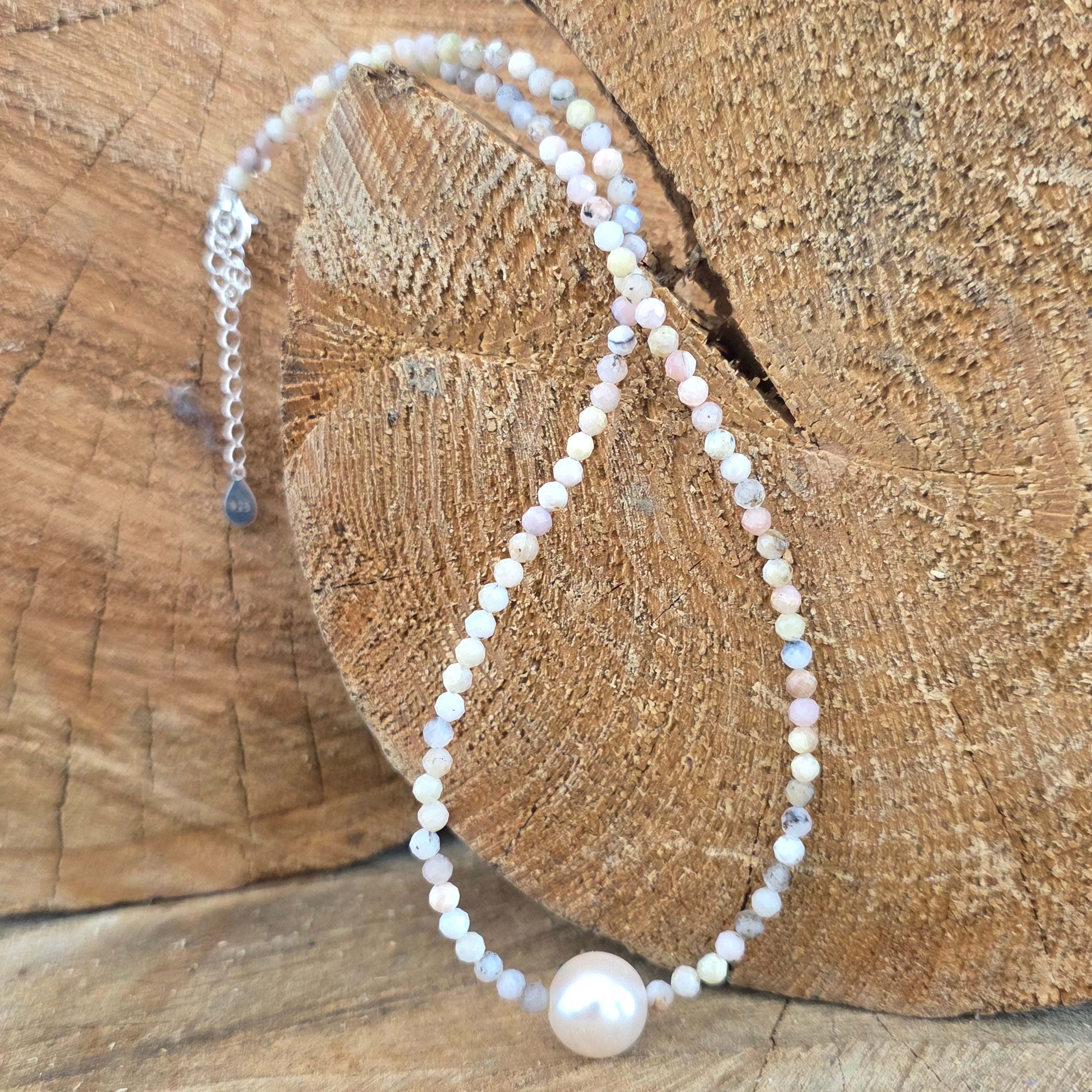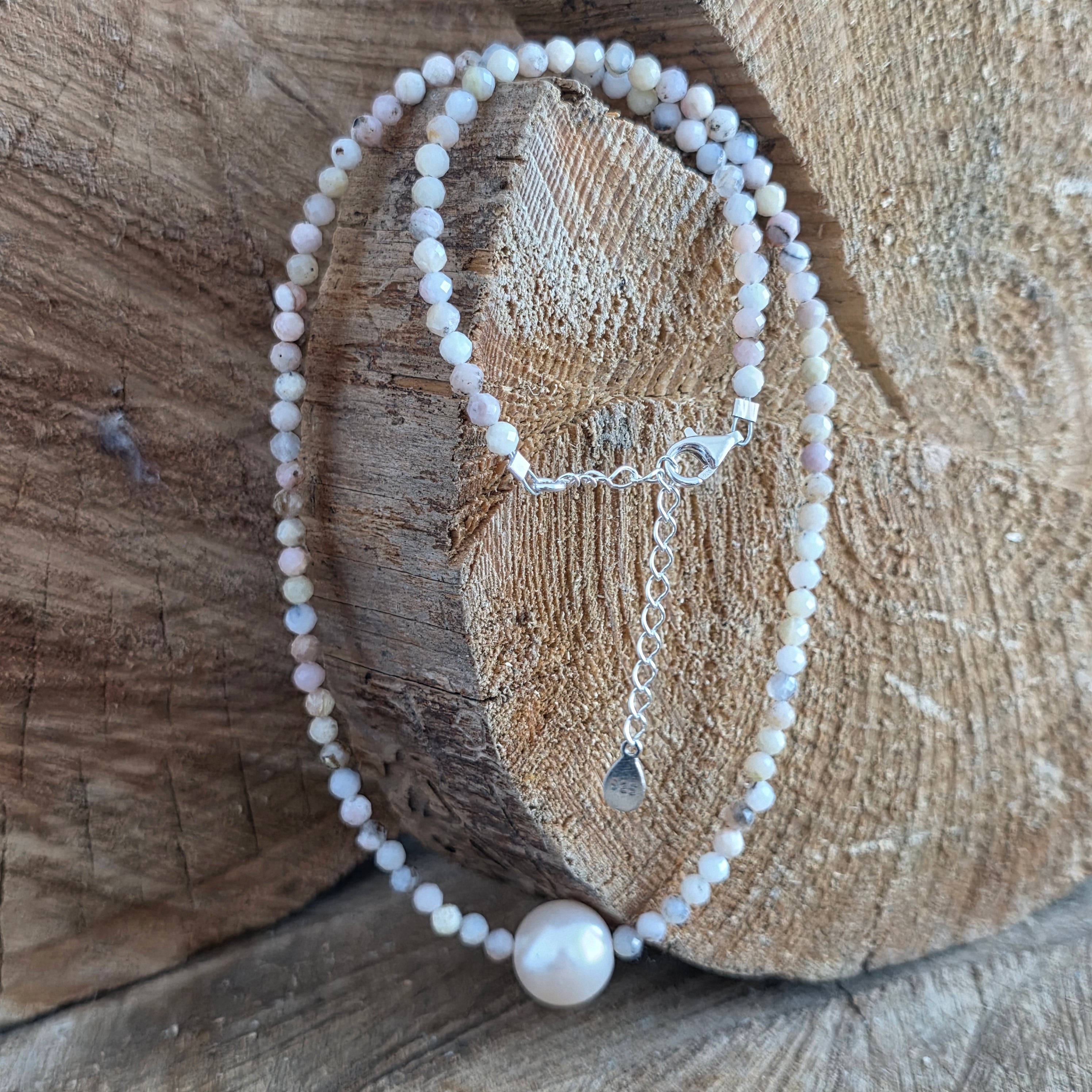 Matériaux : opale rose naturelle, perles facettées 3 mm, argent 925