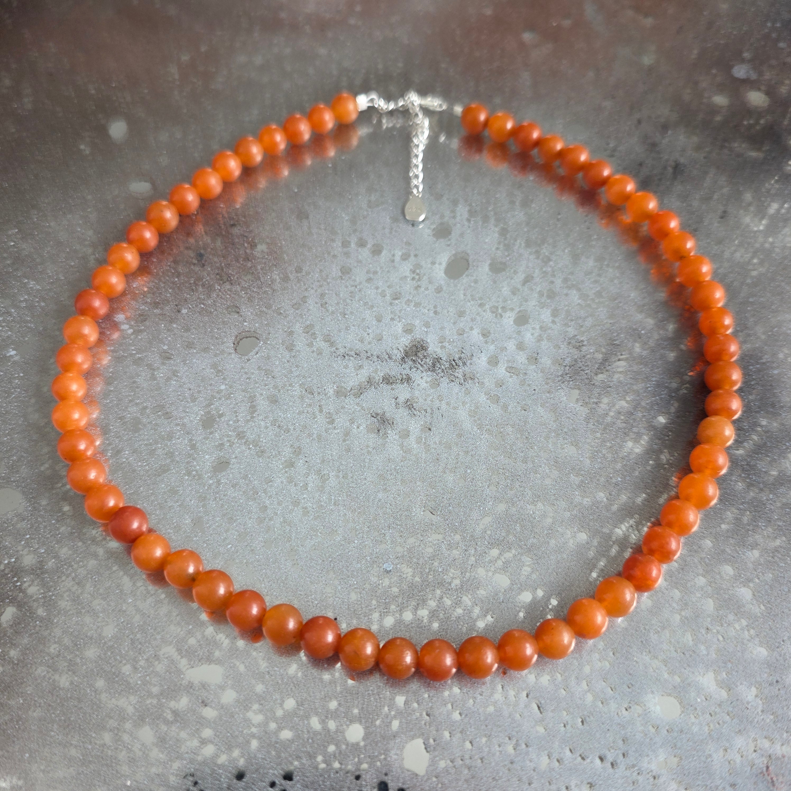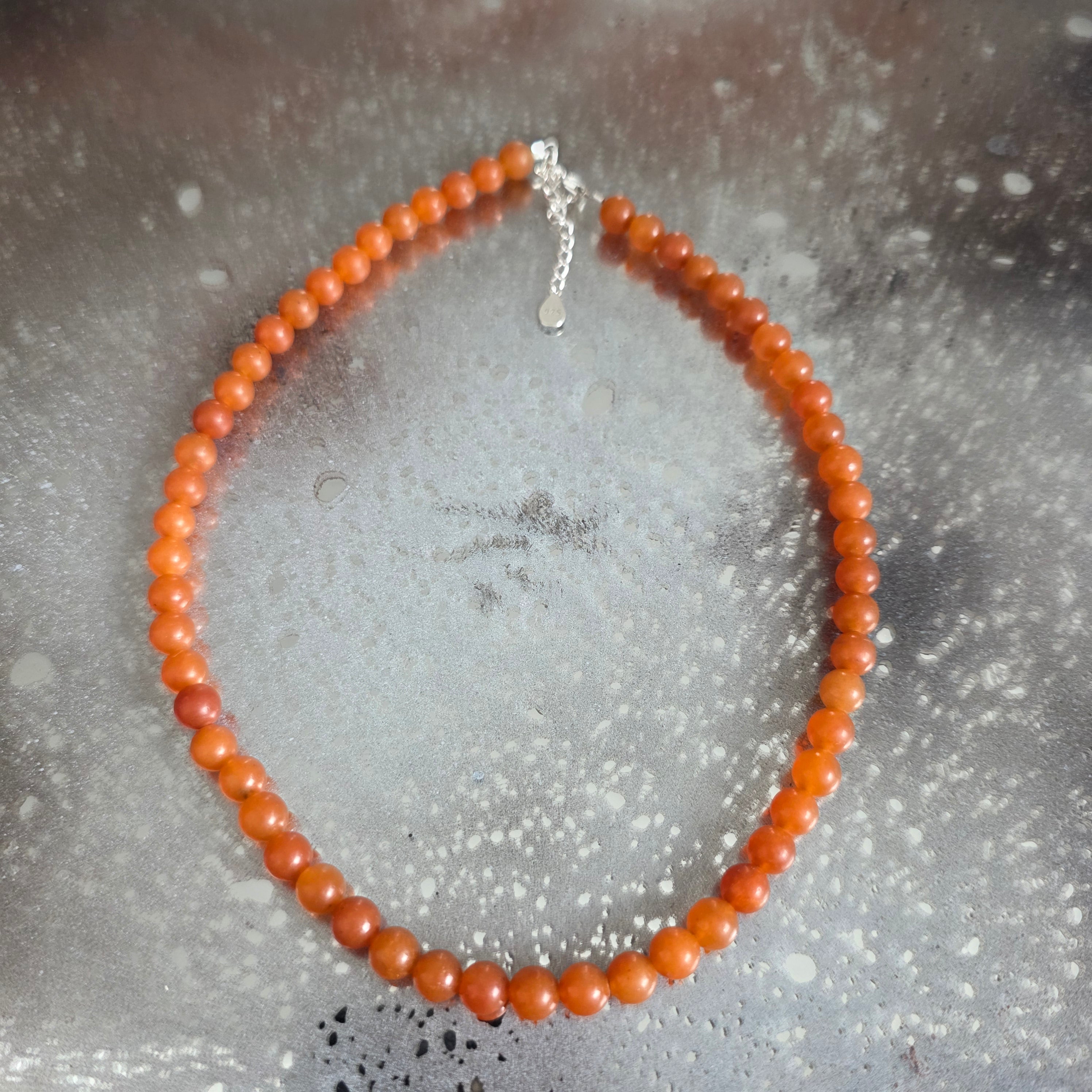 Le fil est composé entièrement de sphères polies d' aventurine orange de 6 mm, des perles lisses et veloutées qui semblent modelées par le soleil doux. Les nuances varient du pêche dorée à l'orange brûlé, dans un jeu subtil qui rappelle le miel coulant, l'argile chaude ou la lumière filtrée à travers le rideau d'un après-midi d'été.
