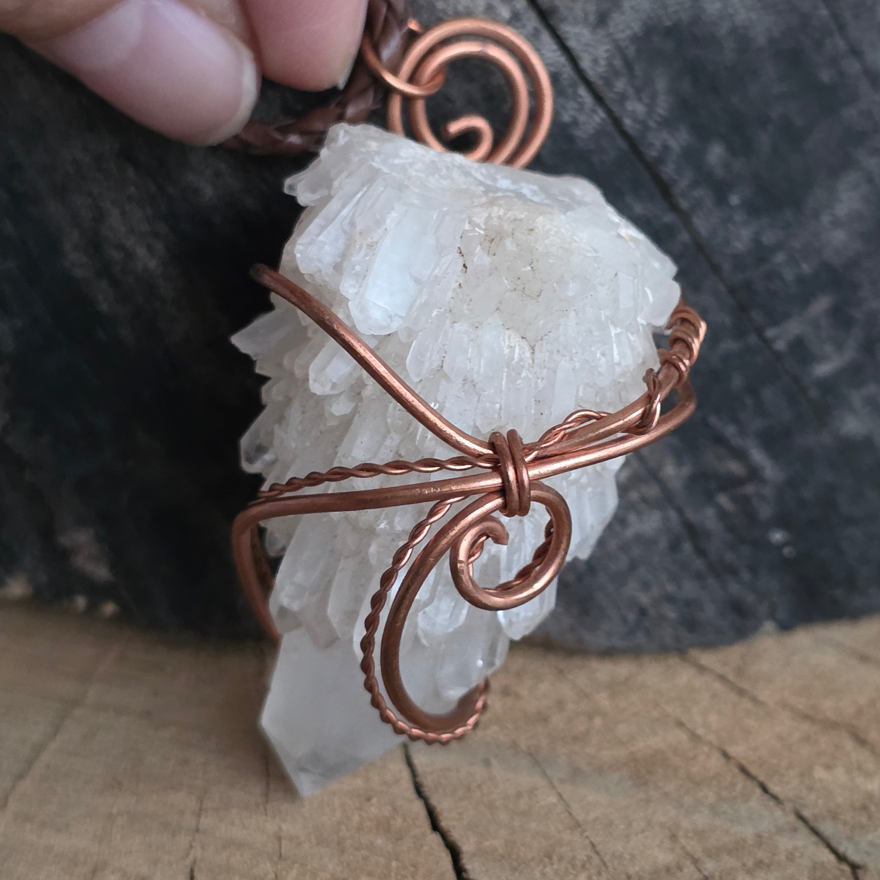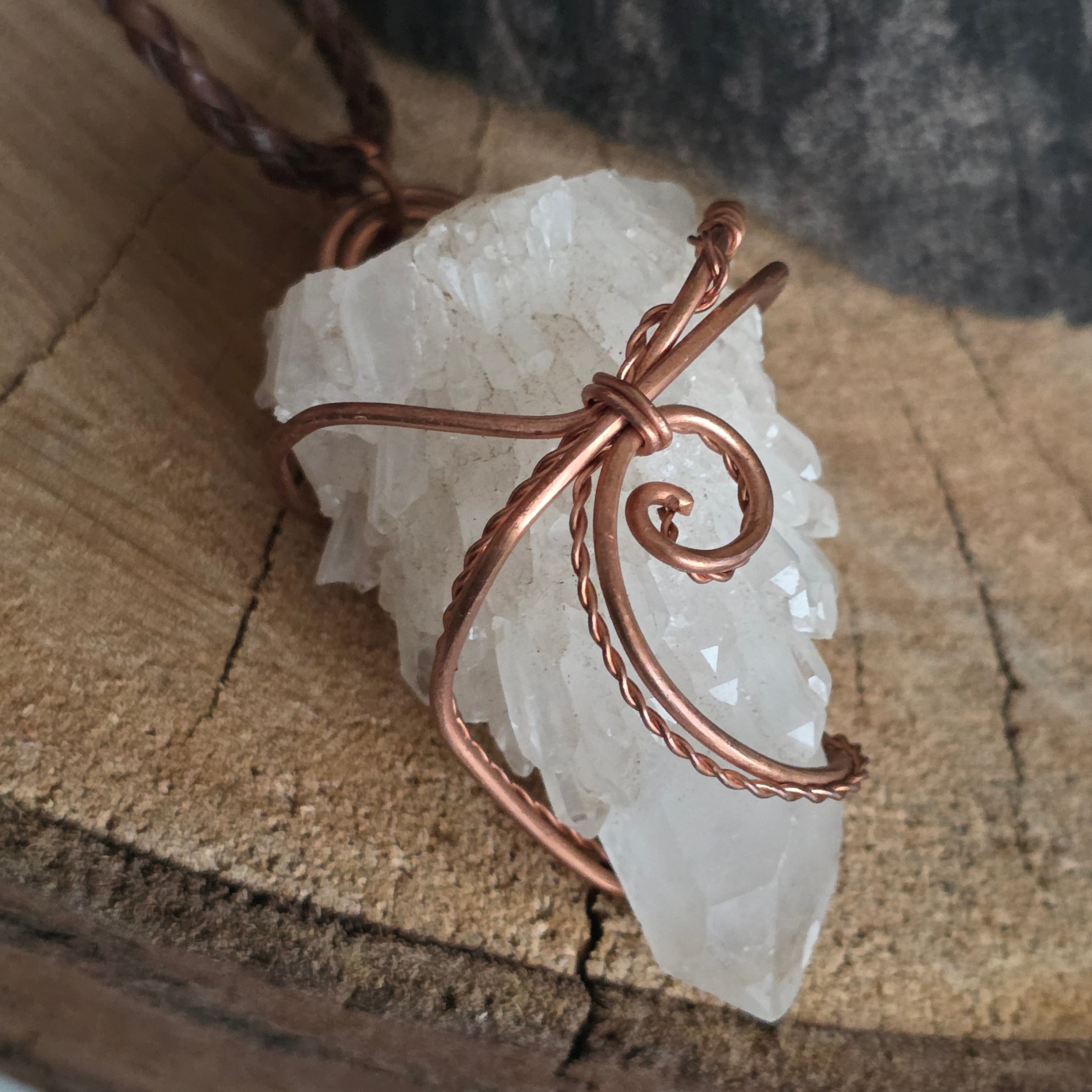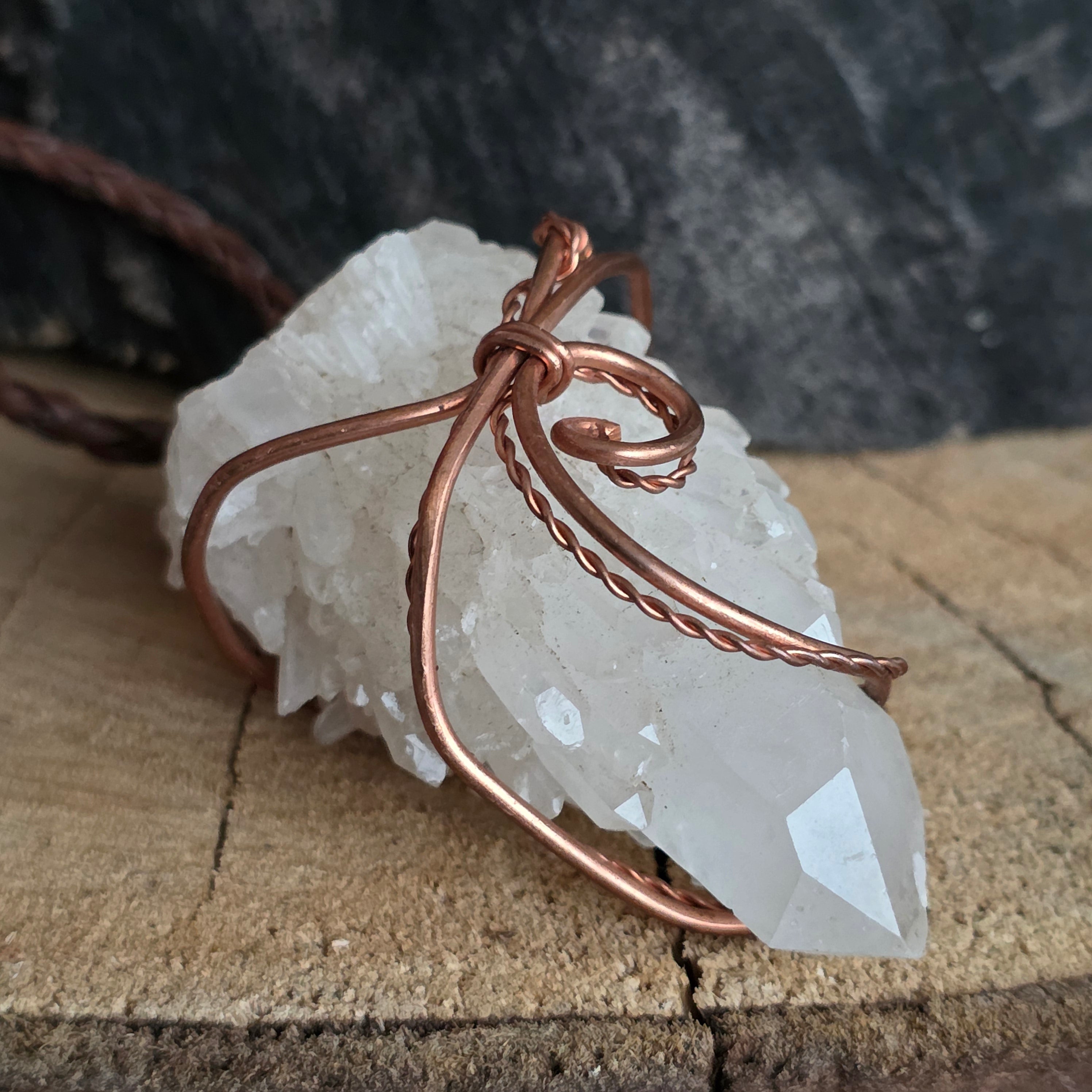 Description - Collier pendentif amas de quartz incolore en cuivre/fil artistique m3