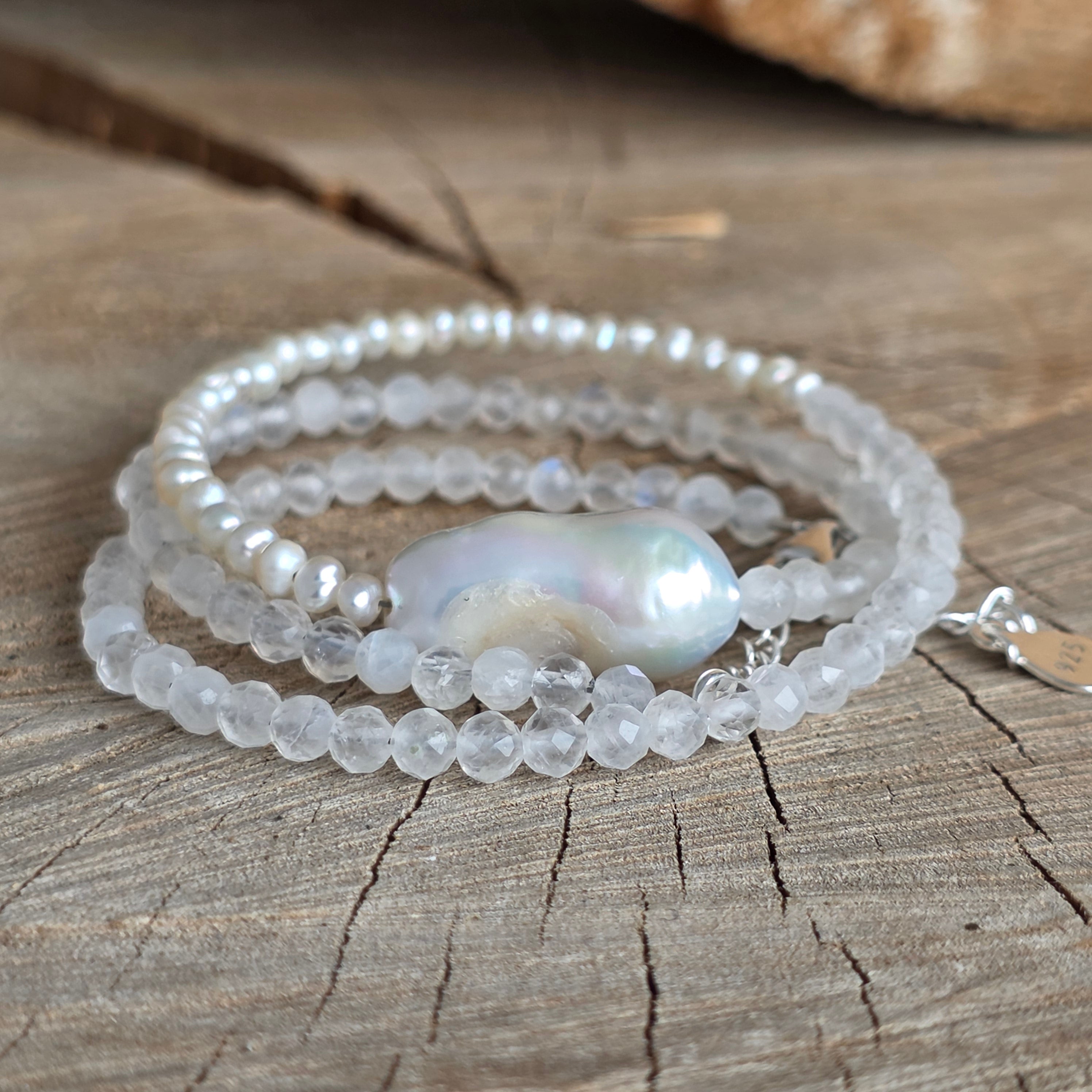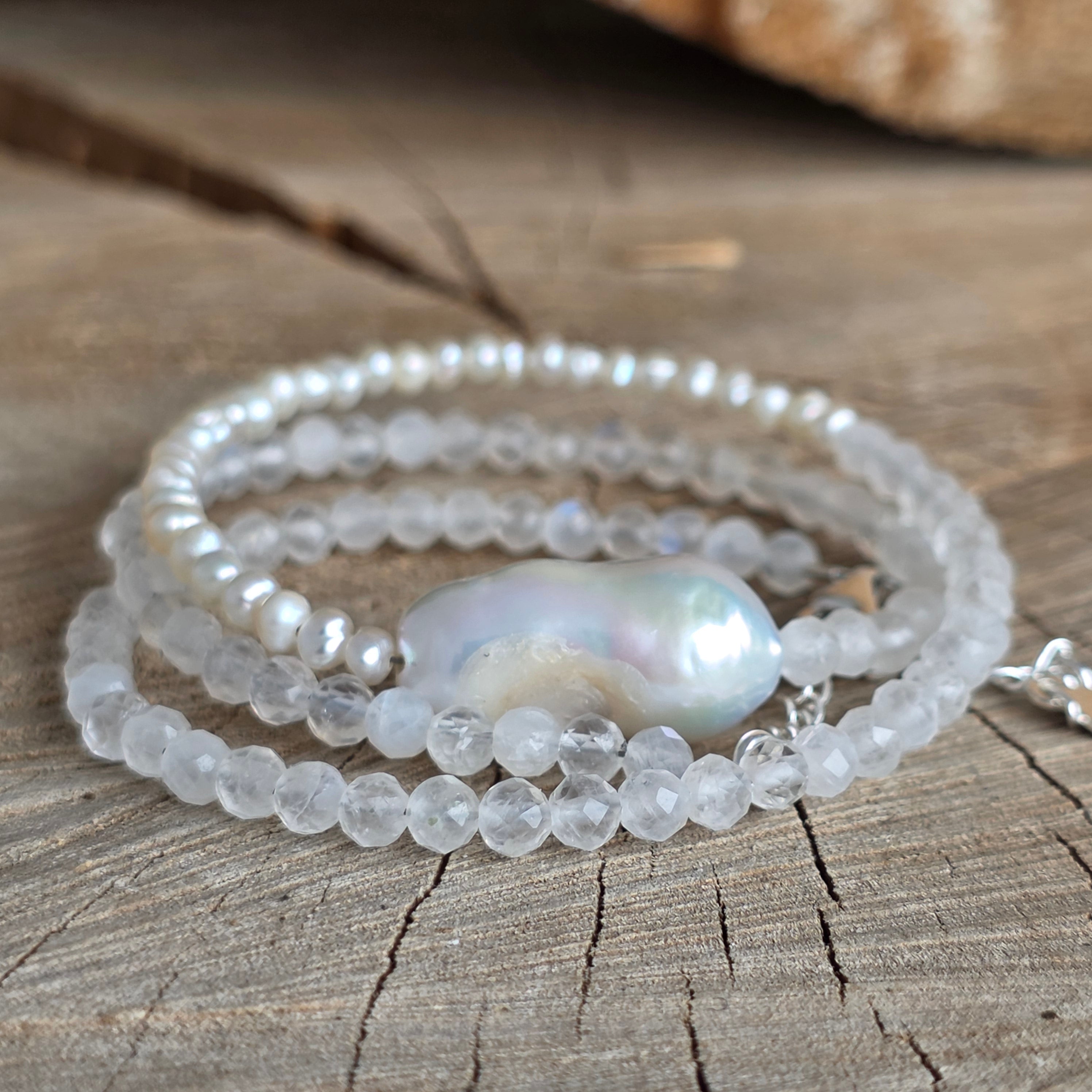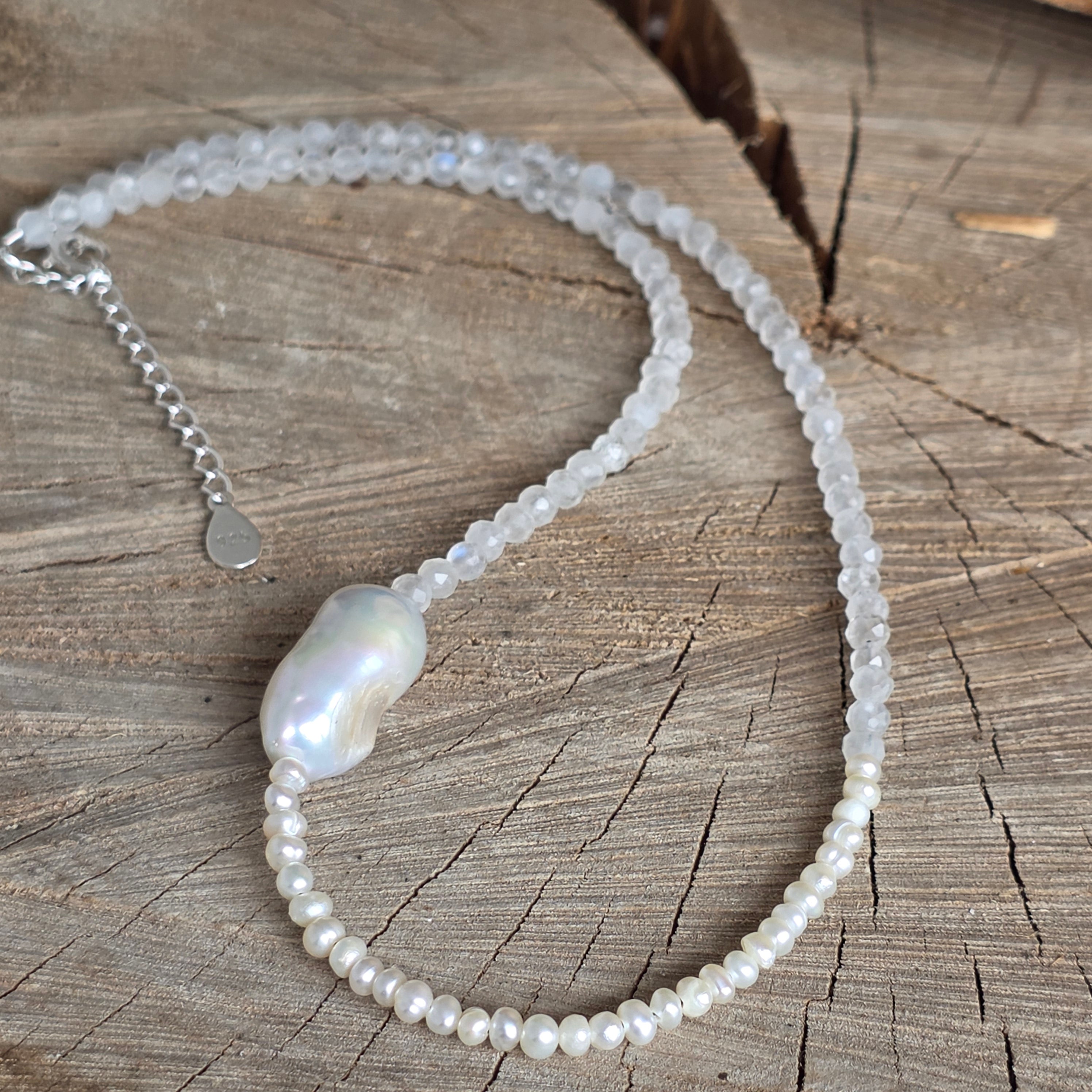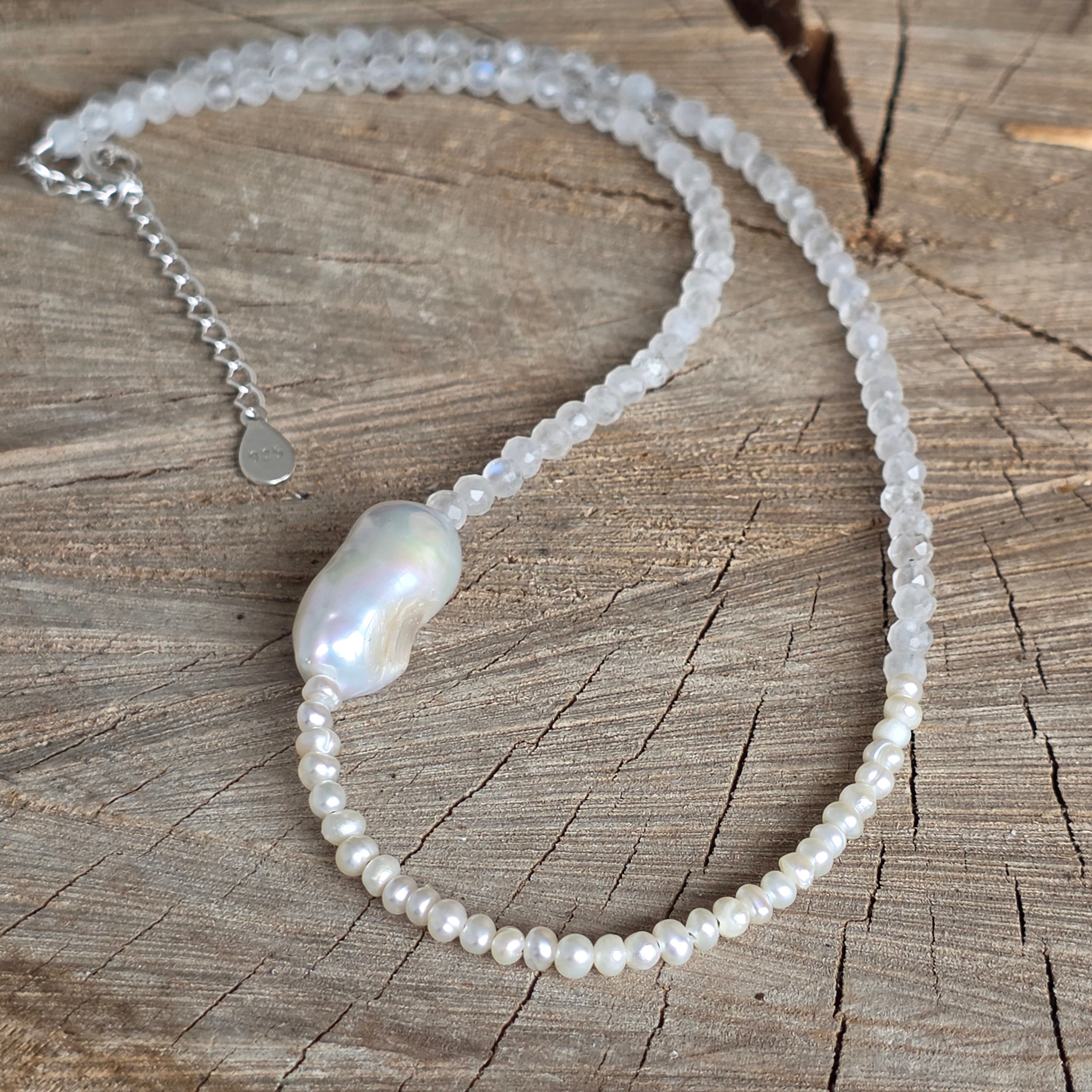 Matériaux : pierre de lune naturelle (sphères facettées de 4 mm), perles de culture (sphères de 2,5 mm), perle baroque, argent 925, fermeture mousqueton en argent