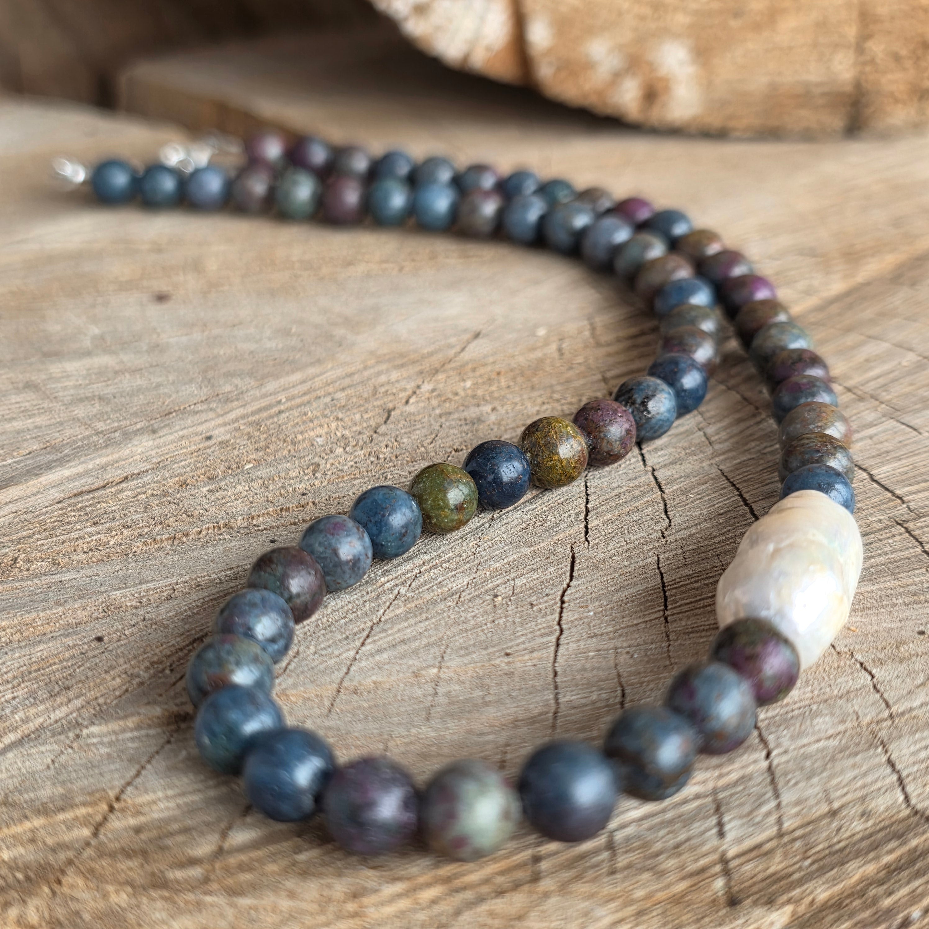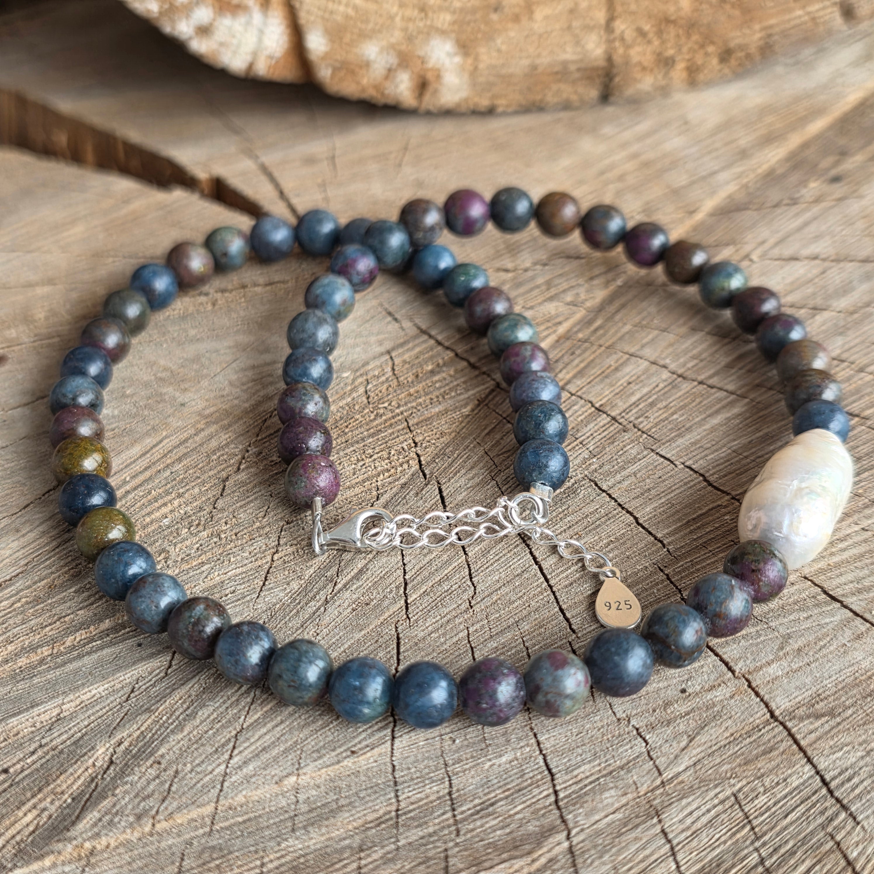 Matériaux : saphir et rubis naturels (sphères facettées), perle baroque, argent 925, fermoir mousqueton en argent