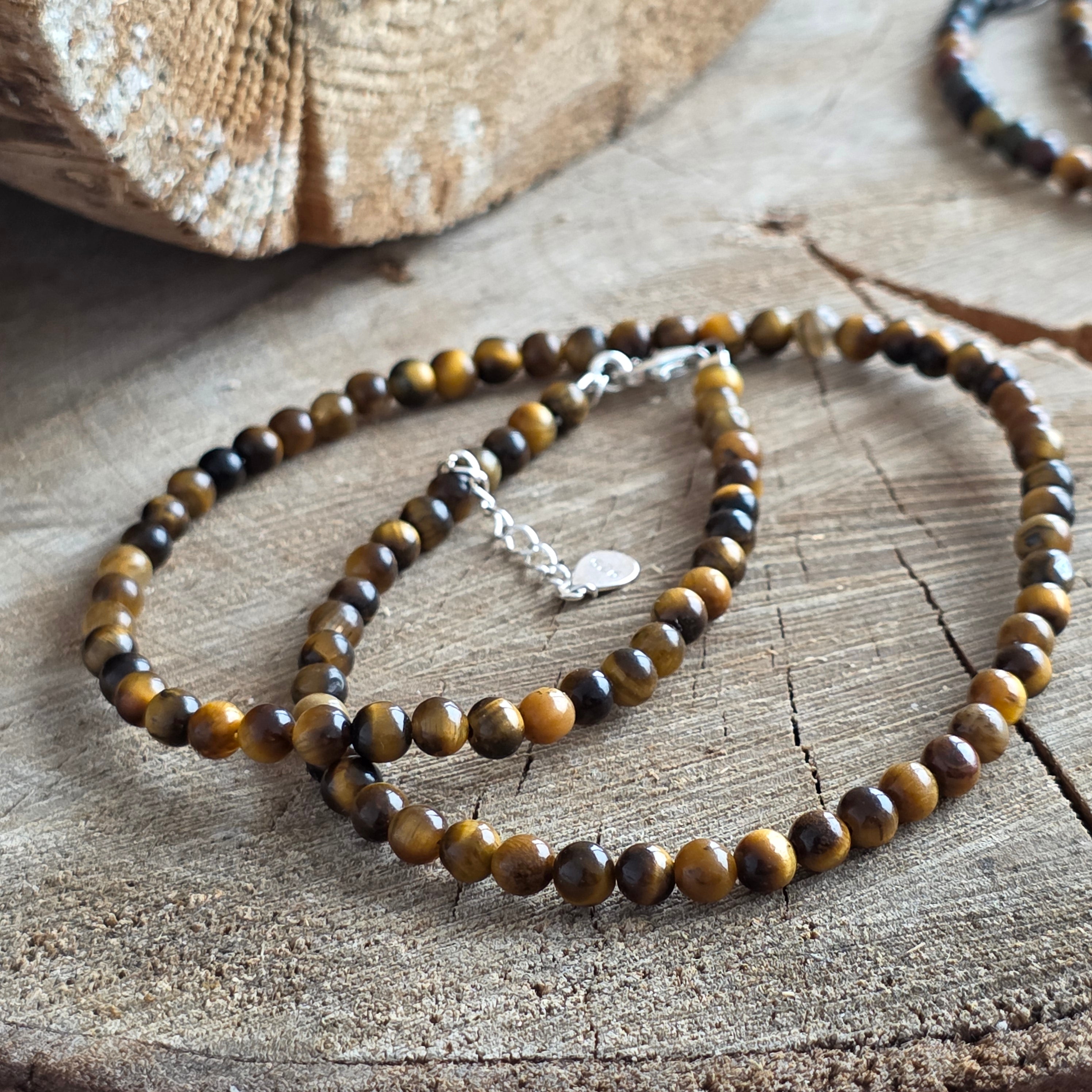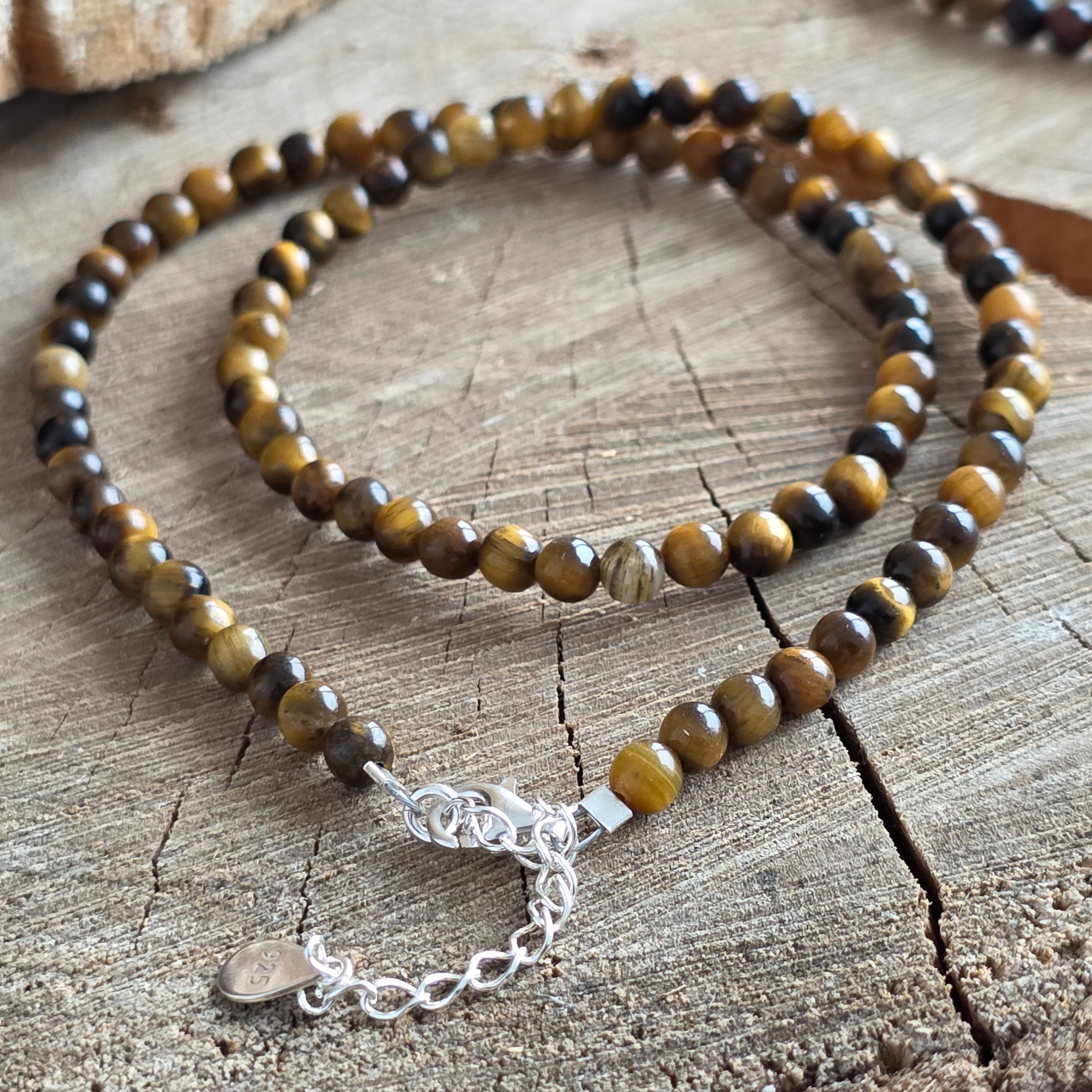 Un bijou qui vibre dans les tons dorés et les ombres de cuivre - comme les rayons filtrés à travers le feuillage dense d'une forêt sacrée. Ce collier Tiger Eye, avec des perles de 4 mm, révèle une lueur subtile, comme une promesse prononcée dans un murmure par la terre elle-même.