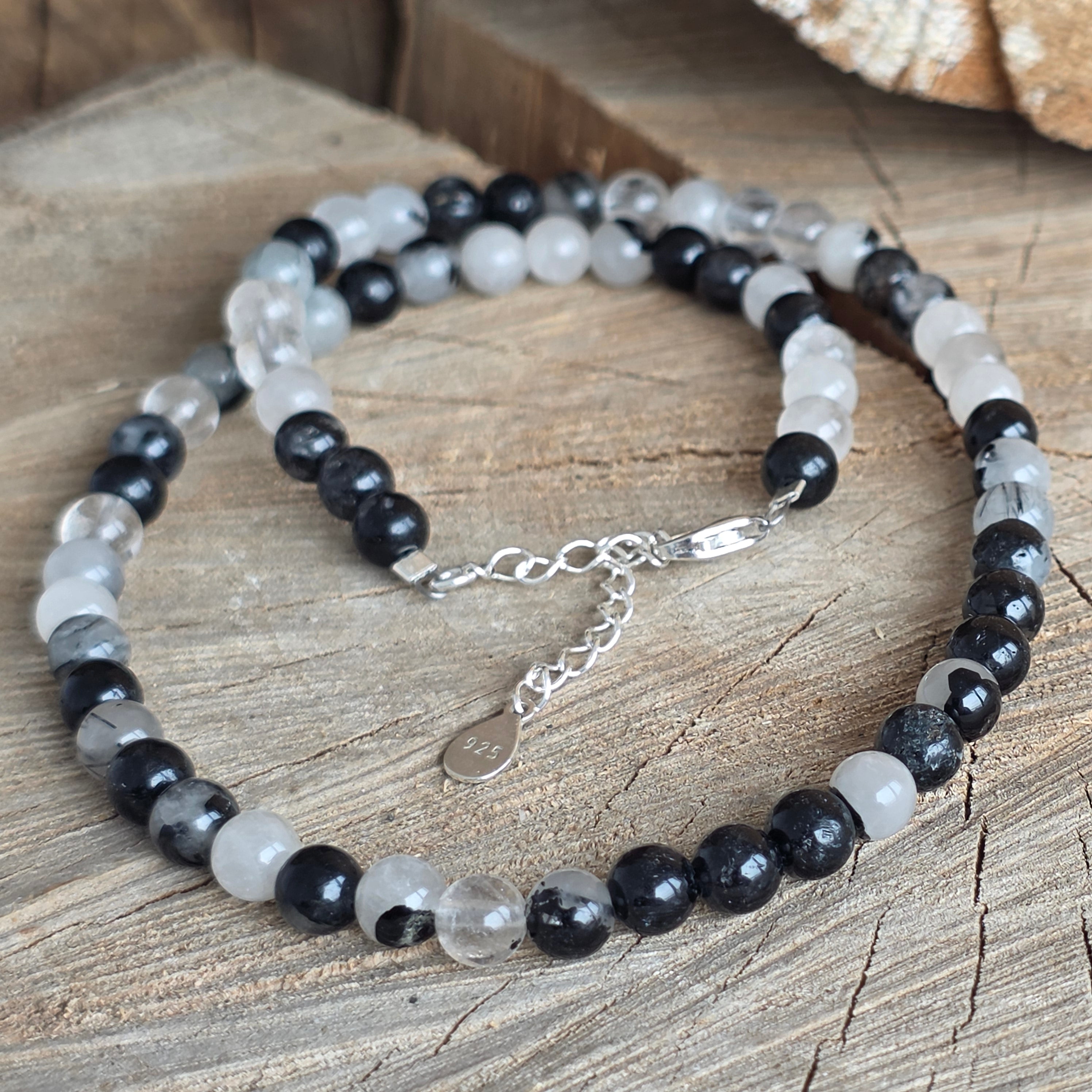 Un collier où le contraste devient équilibre – la transparence du quartz rencontre la profondeur de la tourmaline noire, créant une harmonie entre la lumière et la stabilité. Réalisée avec des perles de 6 mm, cette bijouterie a une présence claire mais équilibrée, facile à intégrer dans n'importe quel style.