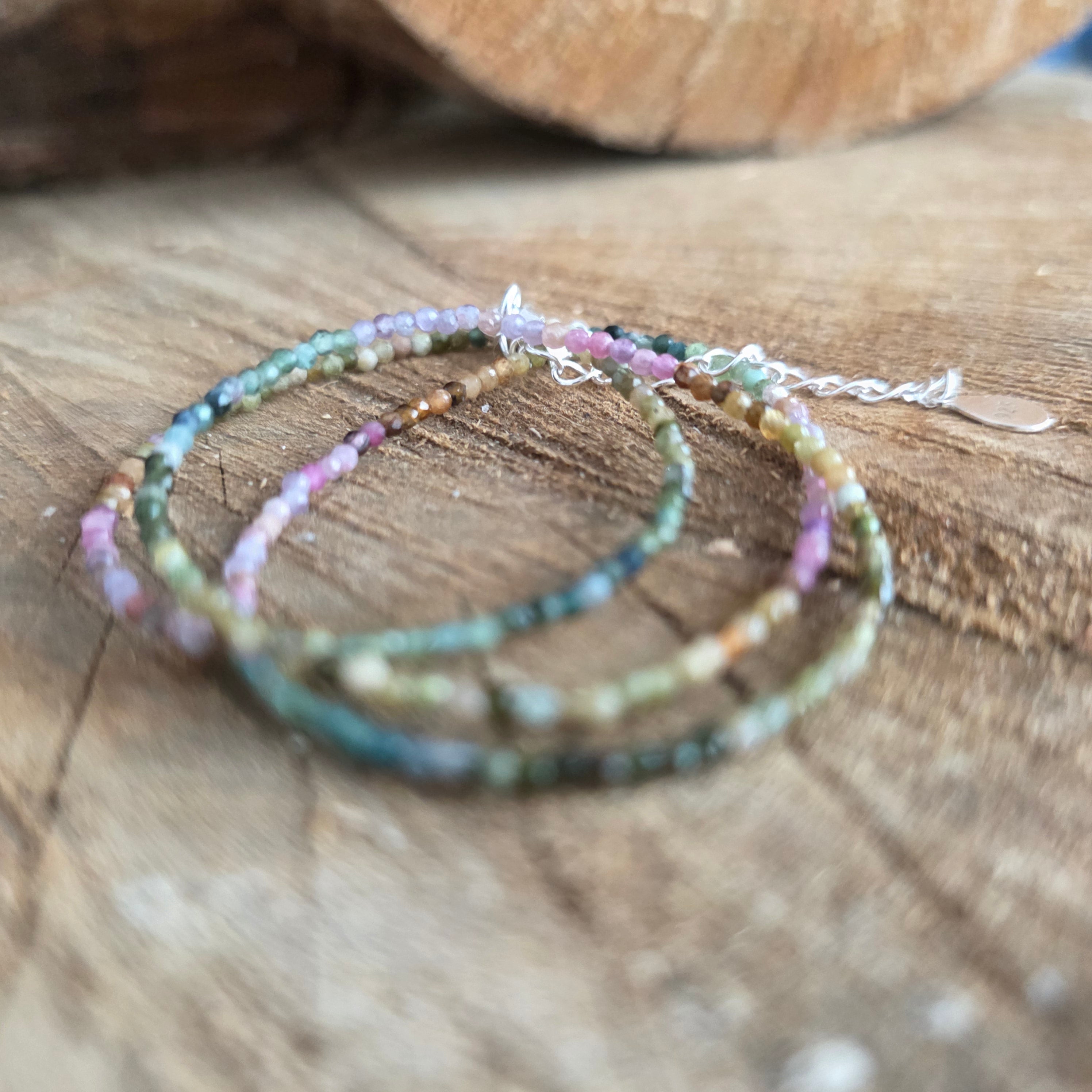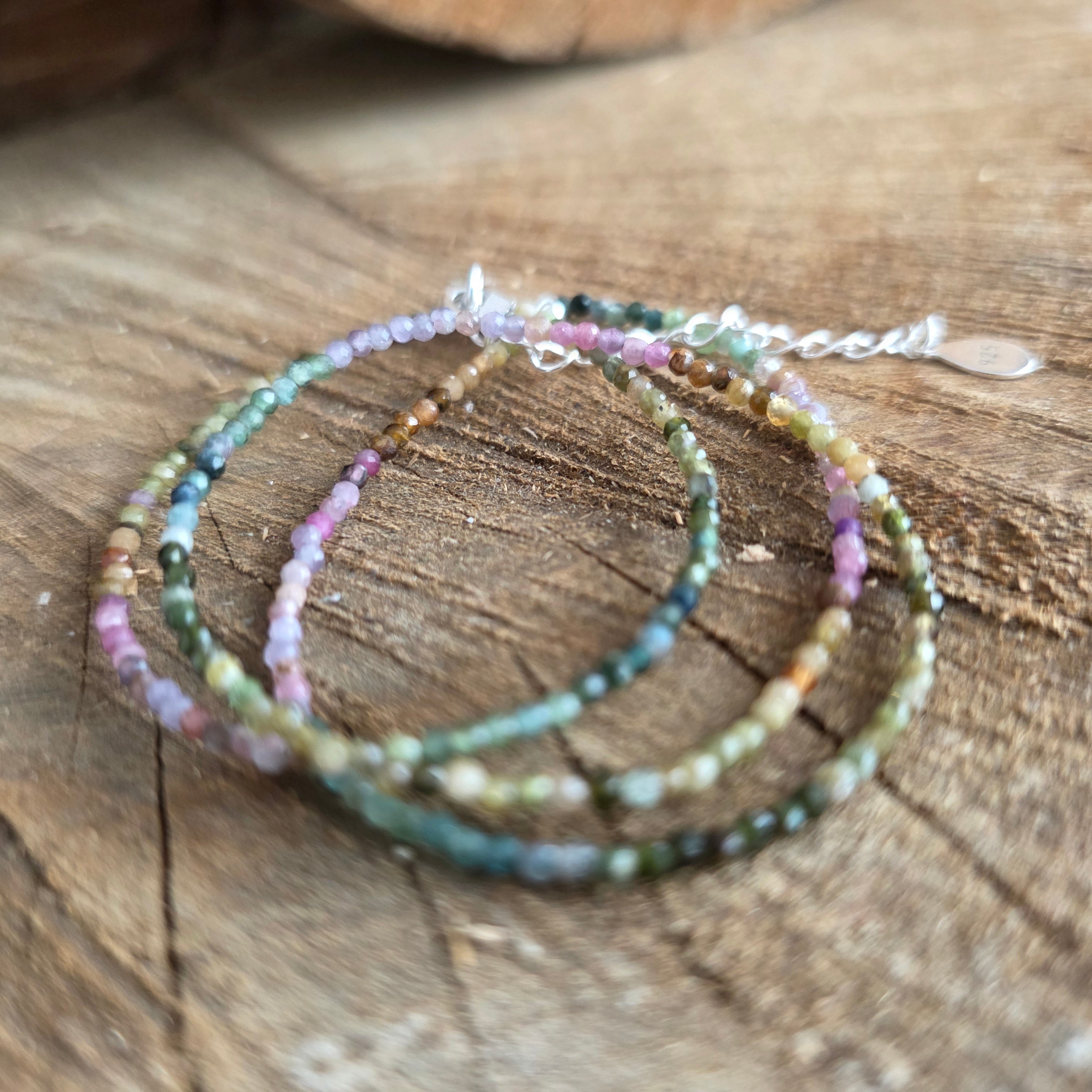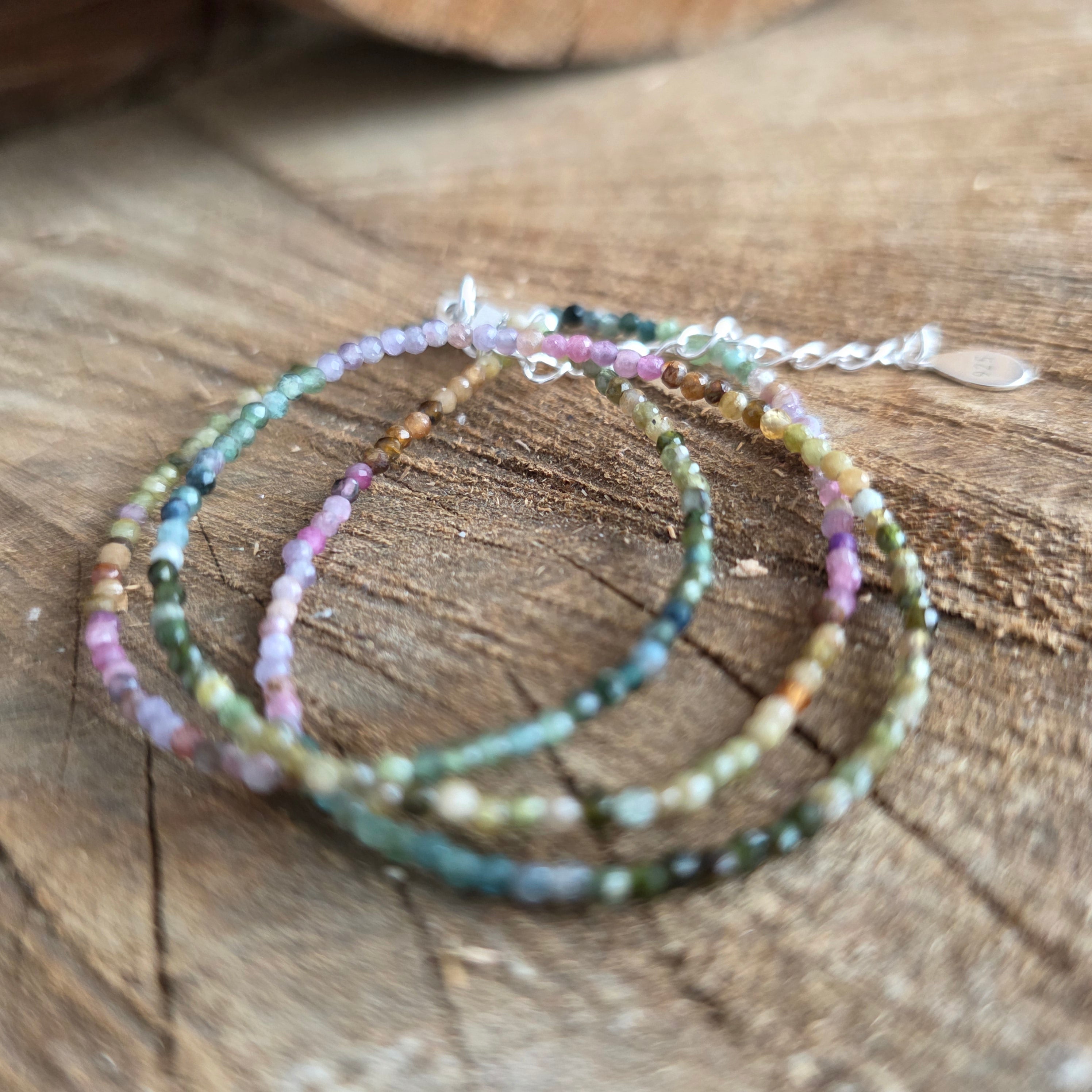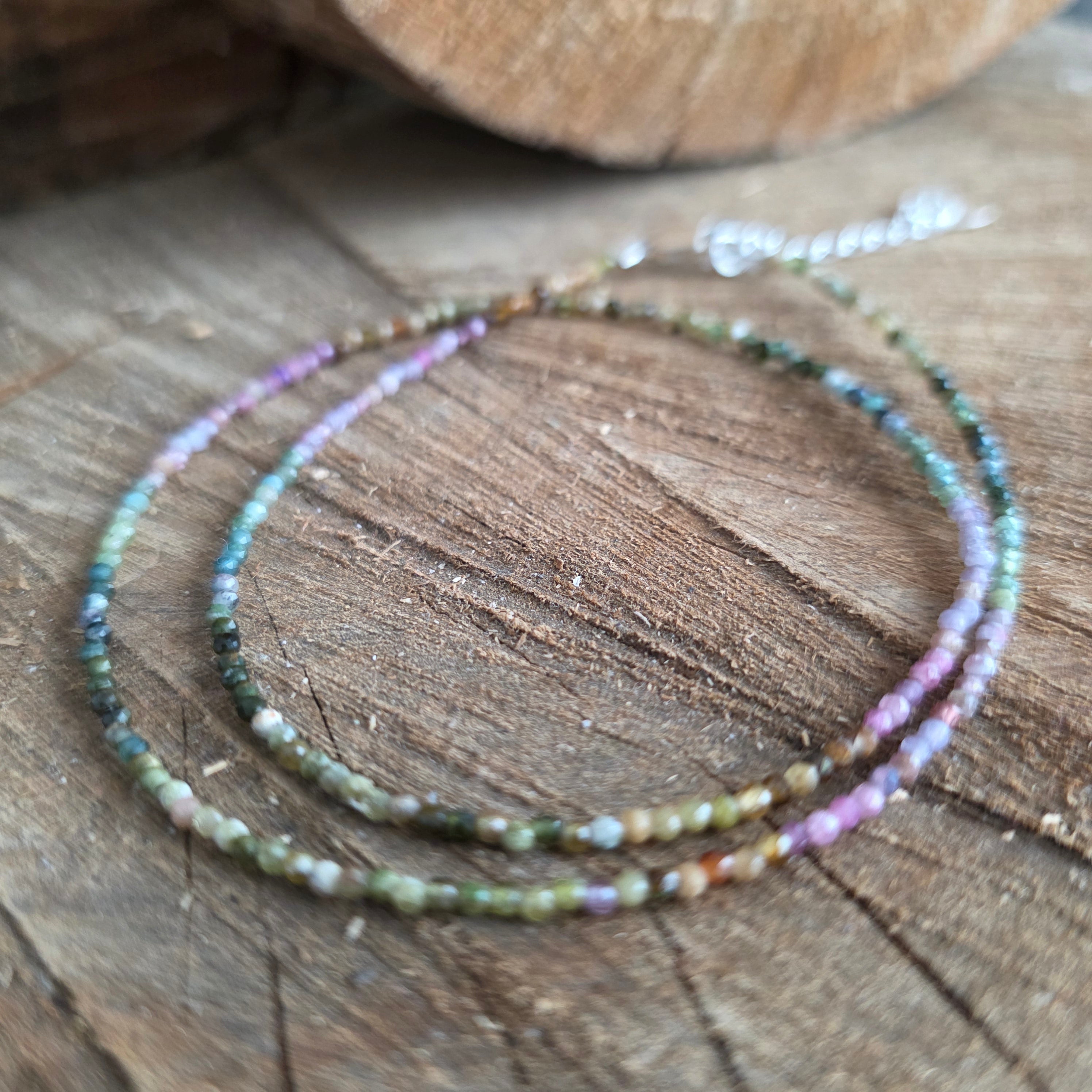 Un collier qui allie la force à la beauté de la diversité. Tourmaline naturelle facettée 2 mm révèle une symphonie de couleurs terreuses et pastel, comme un jardin d'automne pris dans la lumière. Ses fines facettes reflètent subtilement chaque teinte, conférant au collier un air de sophistication et de vitalité.