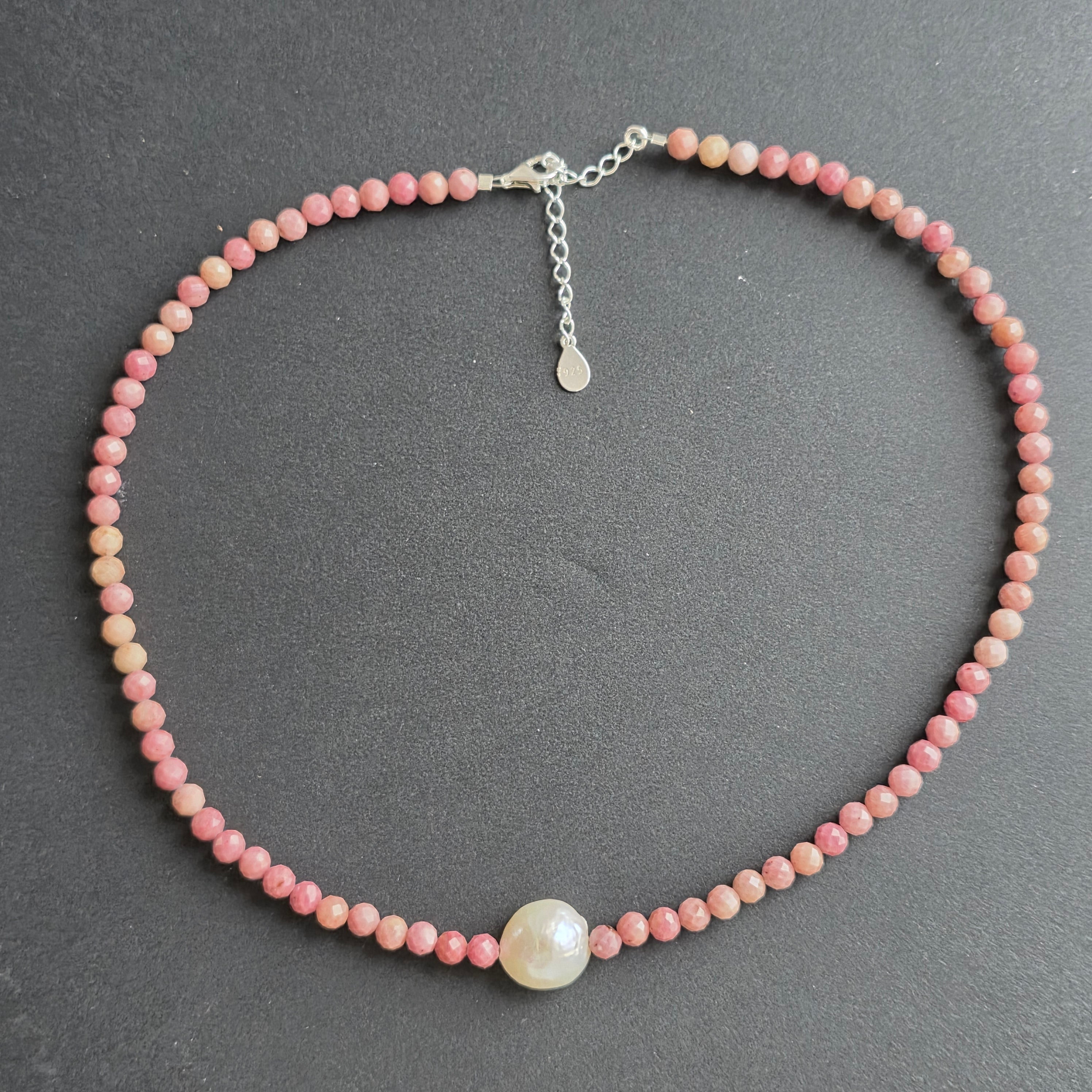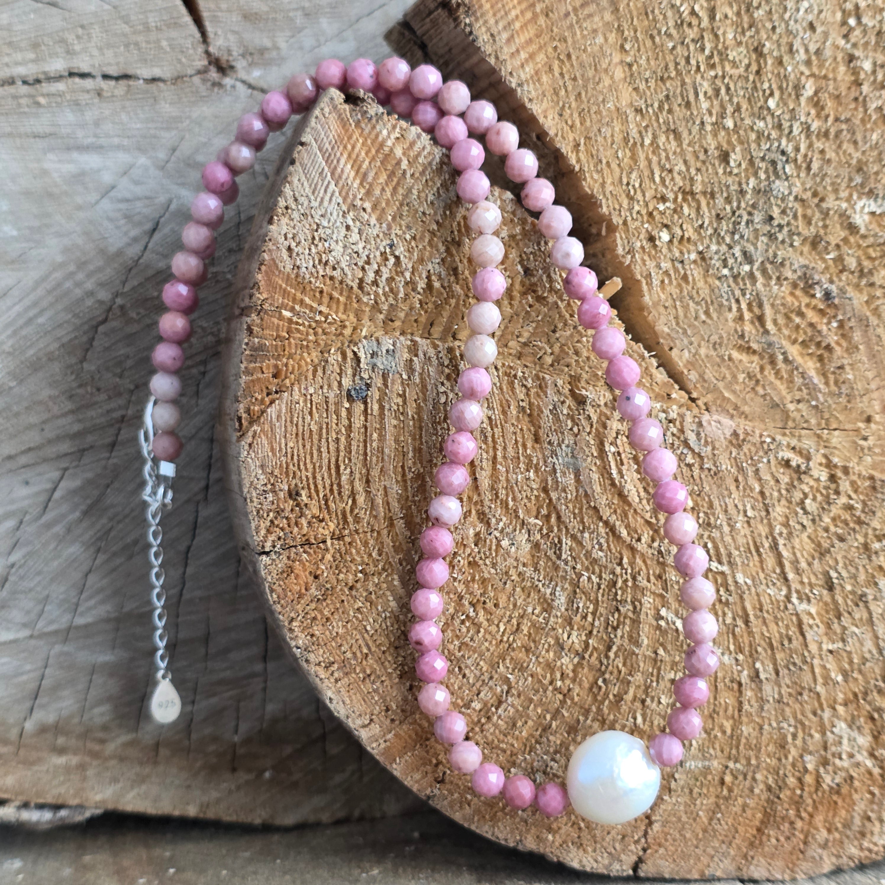 Un collier délicat et expressif, réalisé avec des perles facettées de tulit de 5 mm, mises en valeur par une perle naturelle centrale de 1 cm, qui apporte équilibre et élégance à la composition. Le contraste entre le rose chaud du tulit et la lumière douce de la perle crée un bijou d'une énergie profondément féminine et harmonieuse.