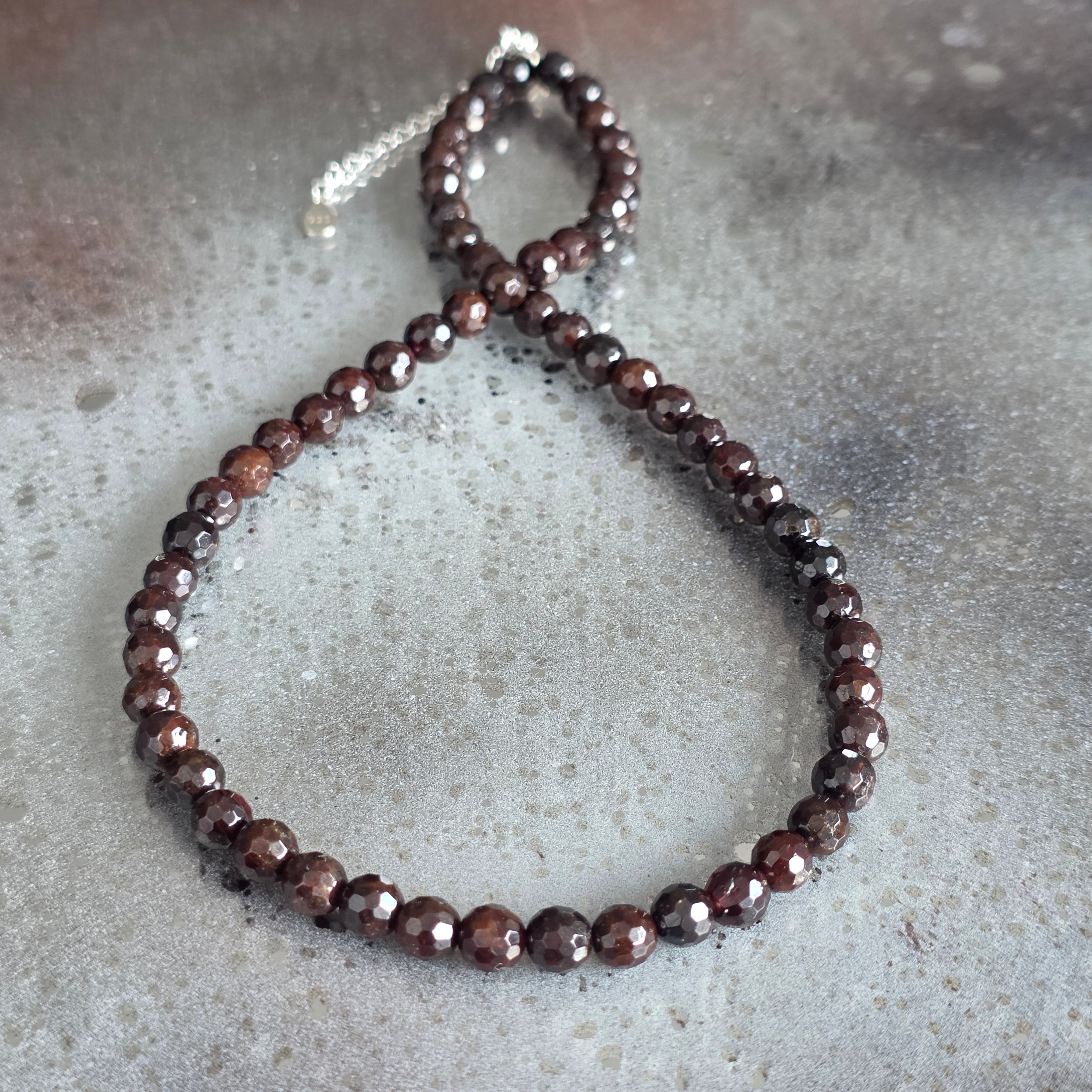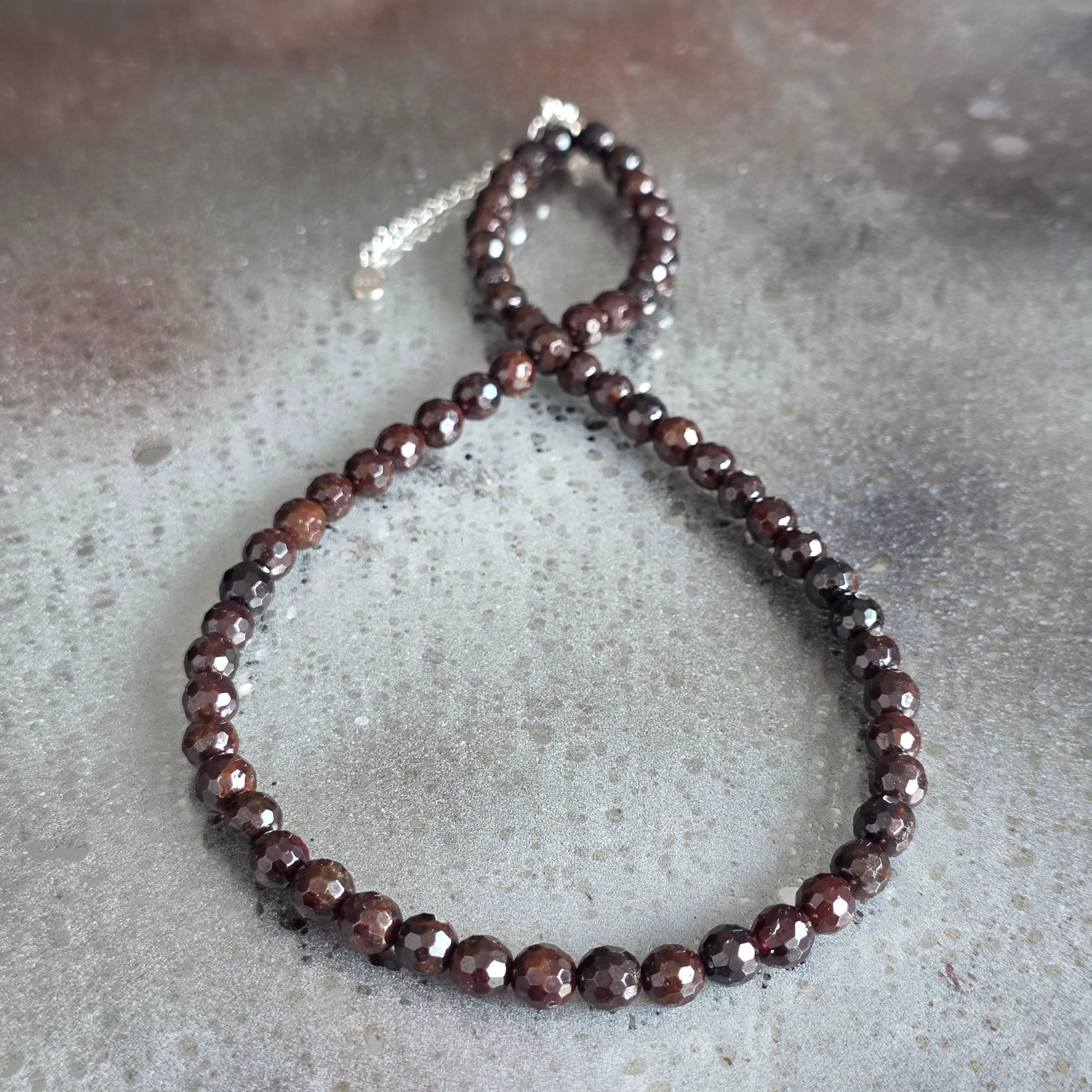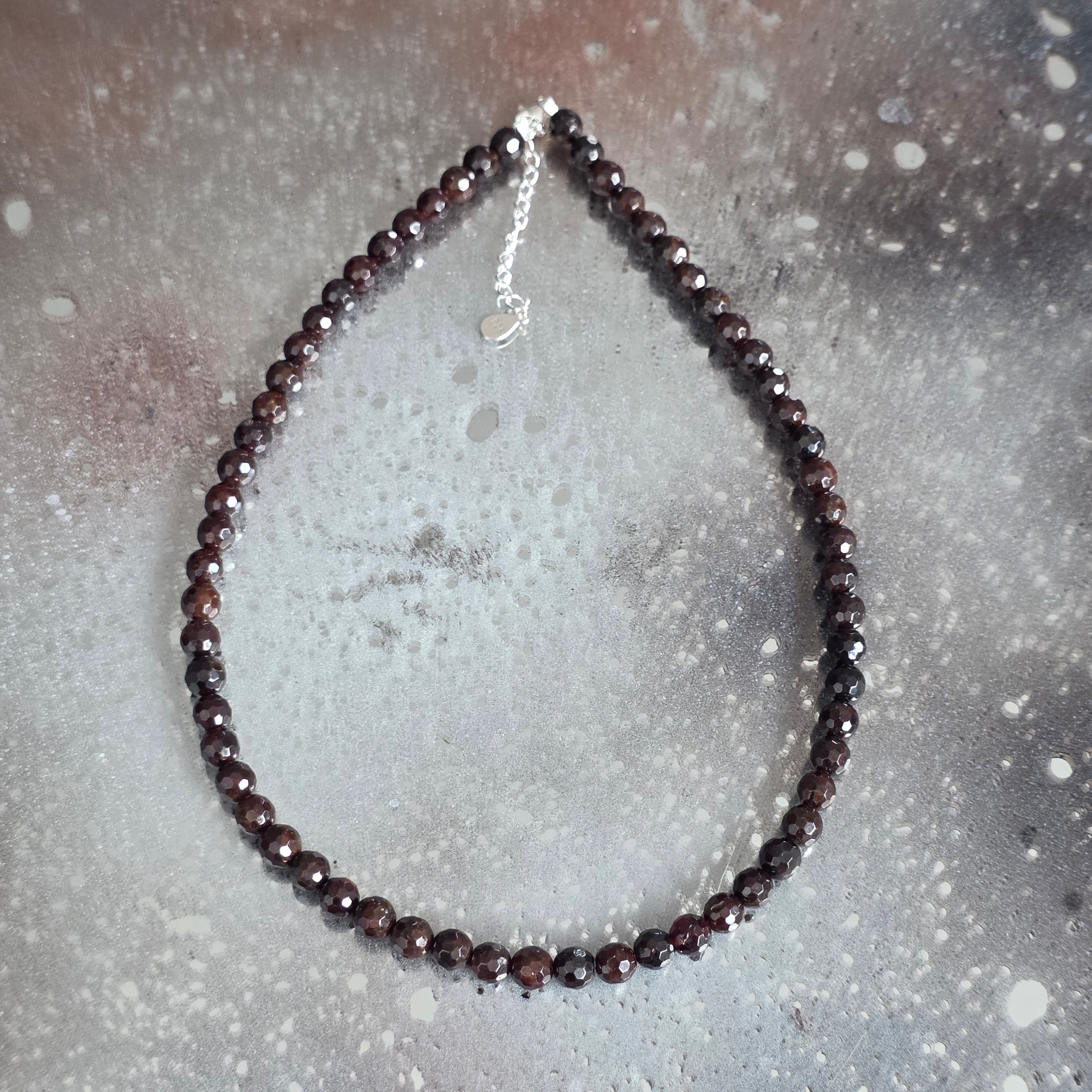 Un collier qui dégage intensité et noblesse, semblable à une étincelle cachée dans les profondeurs de la terre. Le grenat naturel facetté de 6 mm fait surgir des reflets rouge-bordeaux qui dansent à la lumière, offrant au bijou une élégance classique et séduisante.