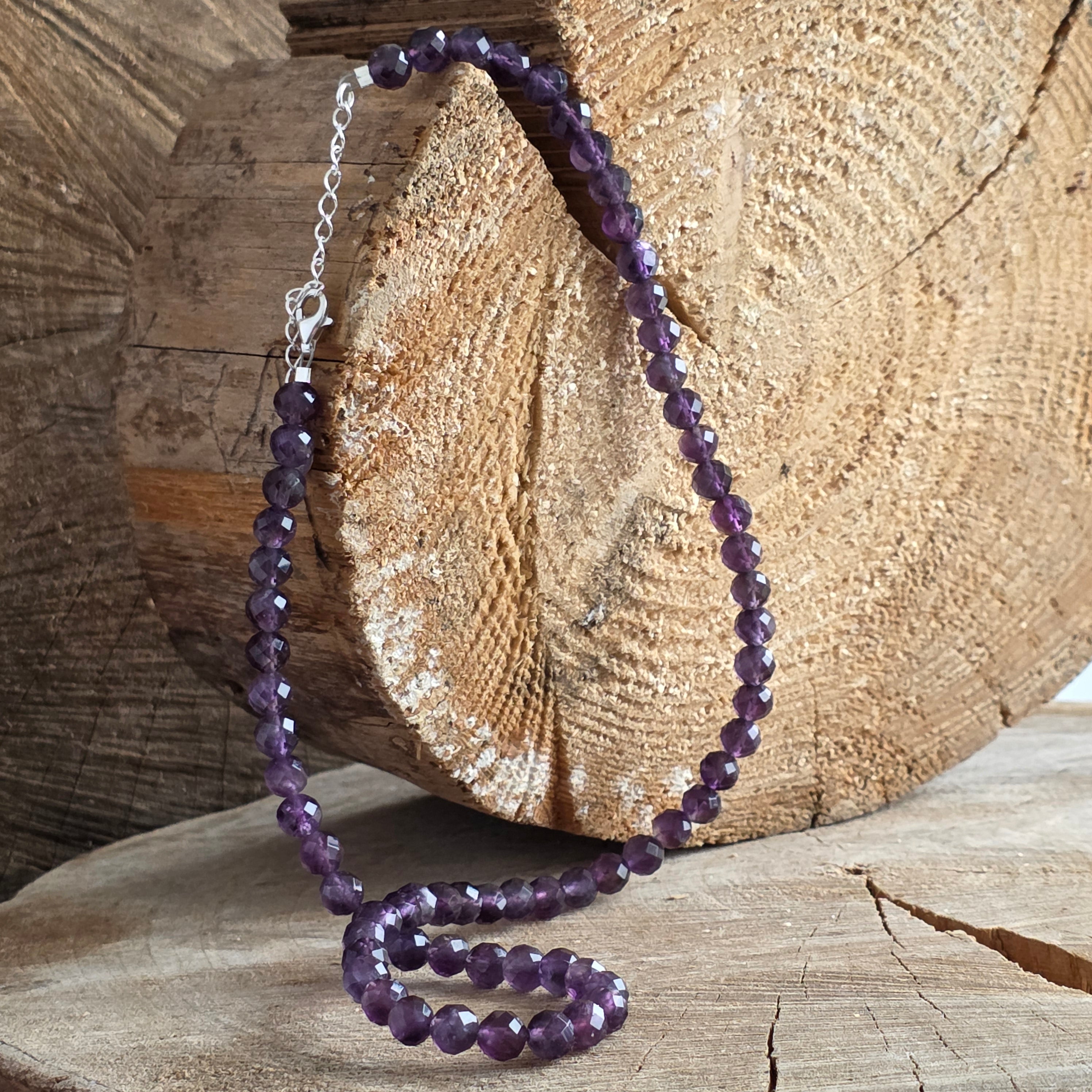 Un collier qui apporte la délicatesse et la noblesse subtile du rêve, comme un murmure de violet gardé sur la peau. 6 mm, soigneusement facettée, discrètement, réfléchissant la lumière dans un rythme doux et gracieux.