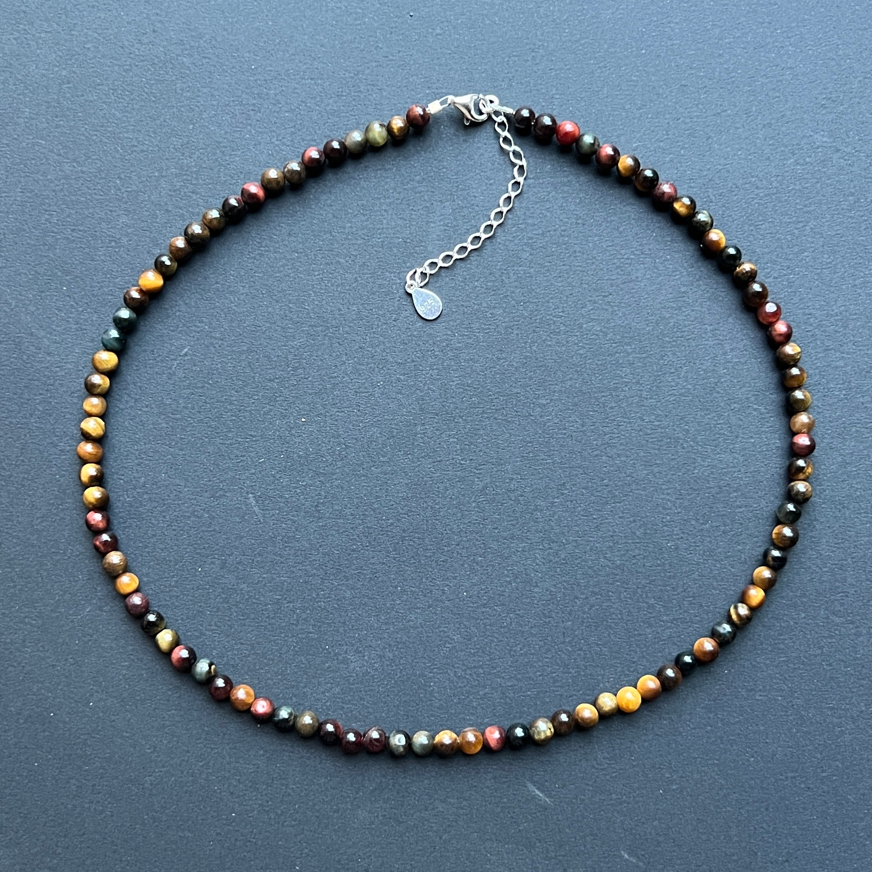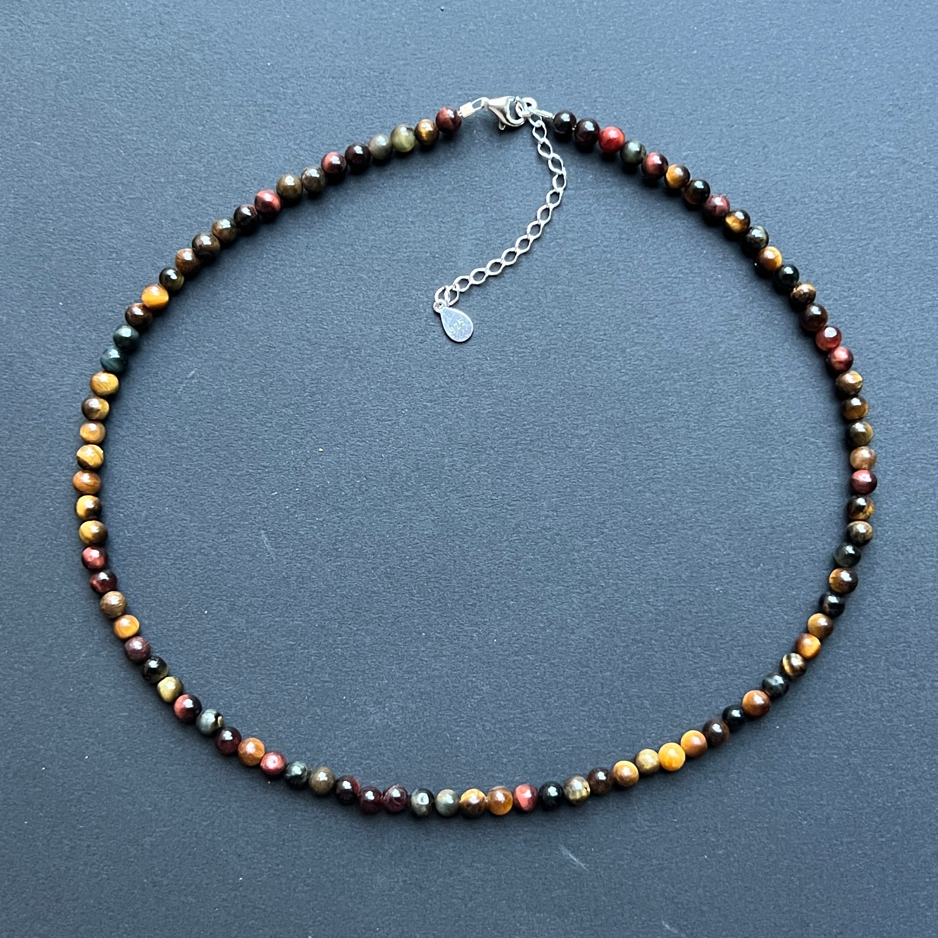 Un bijou qui vibre dans les tons dorés et les ombres de cuivre - comme les rayons filtrés à travers le feuillage dense d'une forêt sacrée. Ce collier Tiger Eye, avec des perles de 4 mm, révèle une lueur subtile, comme une promesse prononcée dans un murmure par la terre elle-même.
