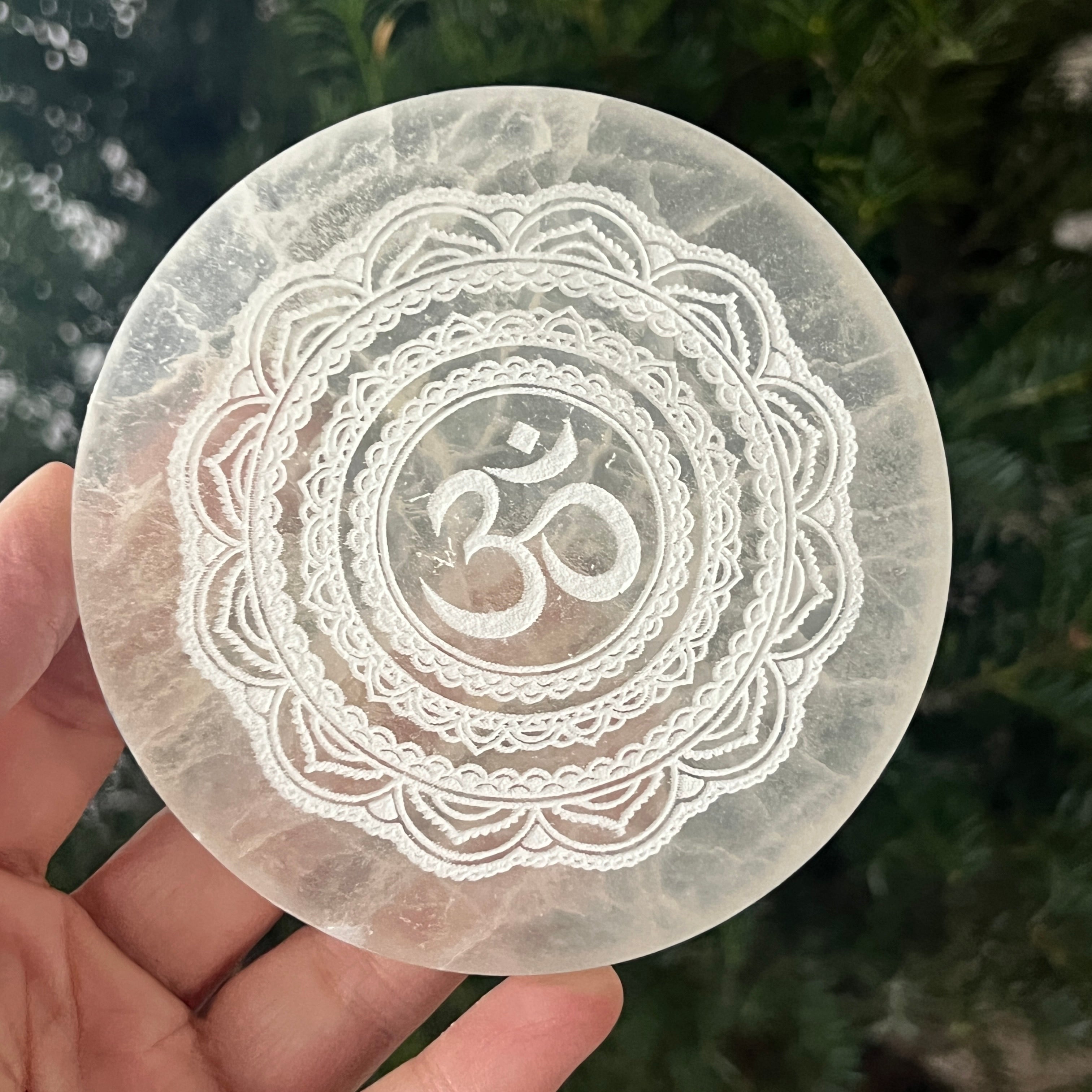Acest disc din selenit gravat cu simbolul sacru Om este o piesă de mare frumusețe și încărcătură spirituală. Mandala Om reprezintă vibrația primordială a universului, fiind un simbol al unității și armoniei interioare.