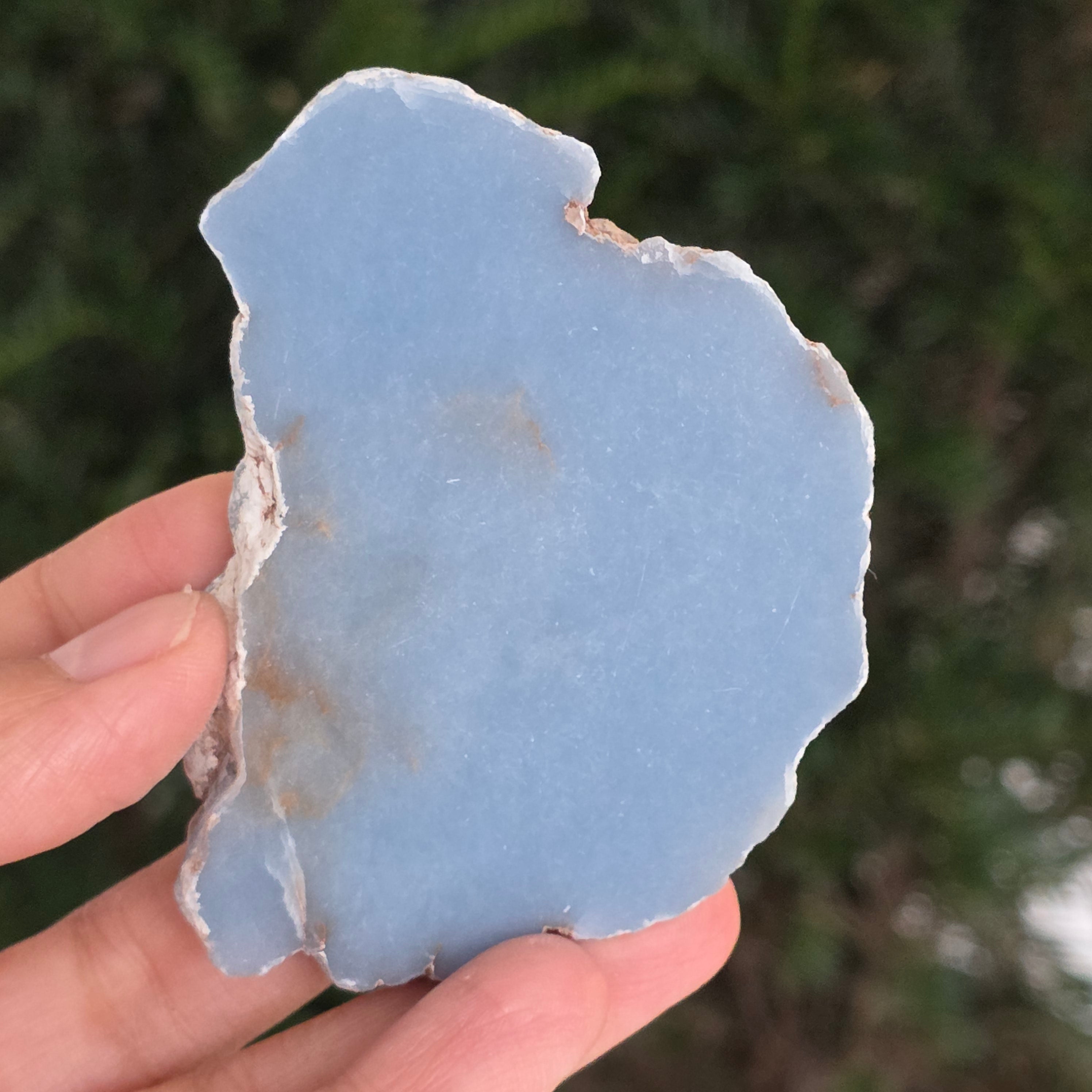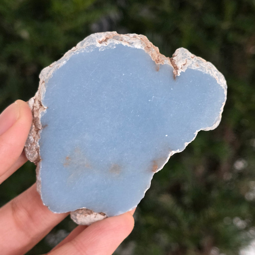 O piesă rară, ce pare desprinsă din seninul cerului. Această felie de angelit natural, dezvăluie un albastru delicat, lăptos, străbătut de nuanțe fine de gri și alb sidefat. Suprafața netedă și textura sa mată emană liniște și puritate – o bijuterie minerală a calmului și a echilibrului interior.