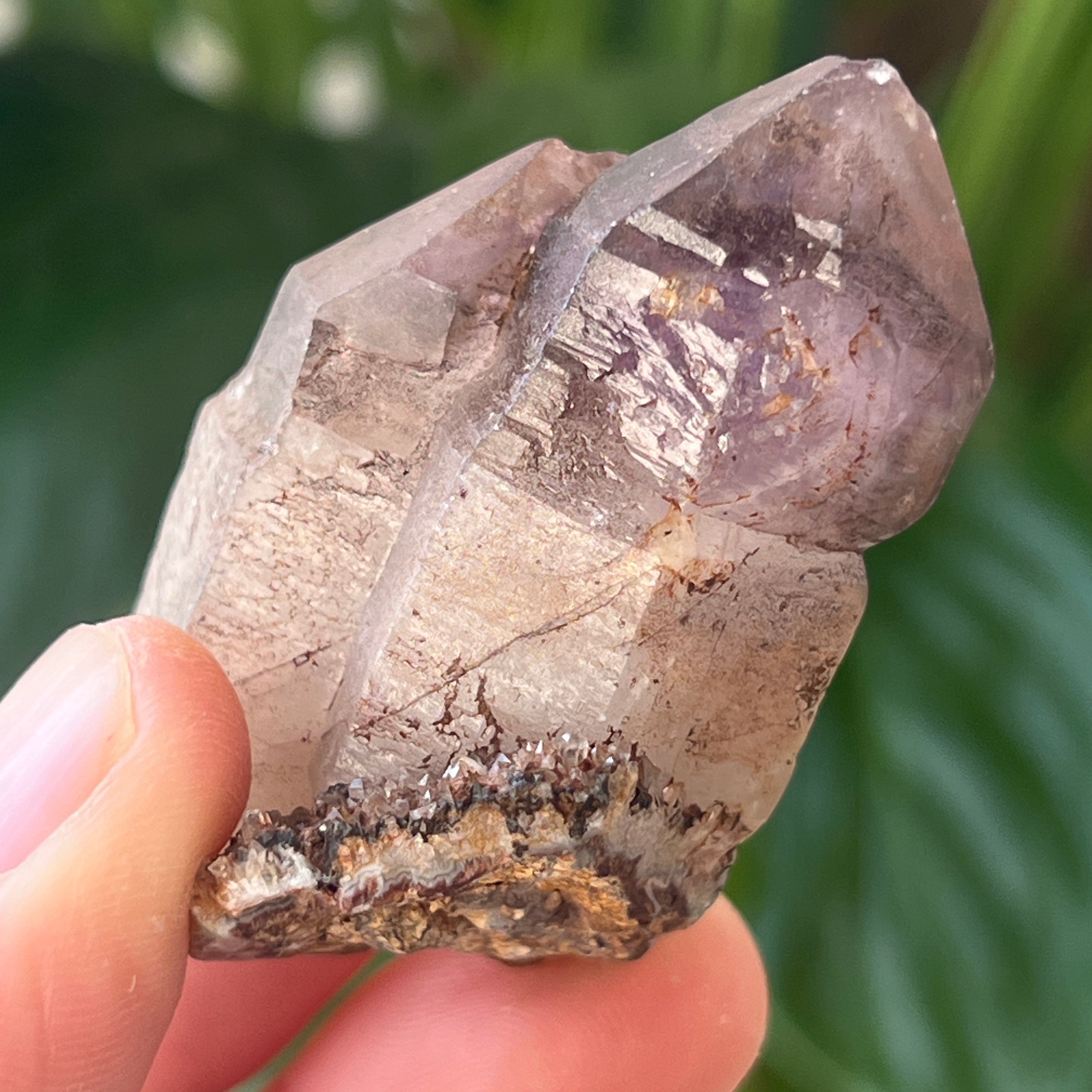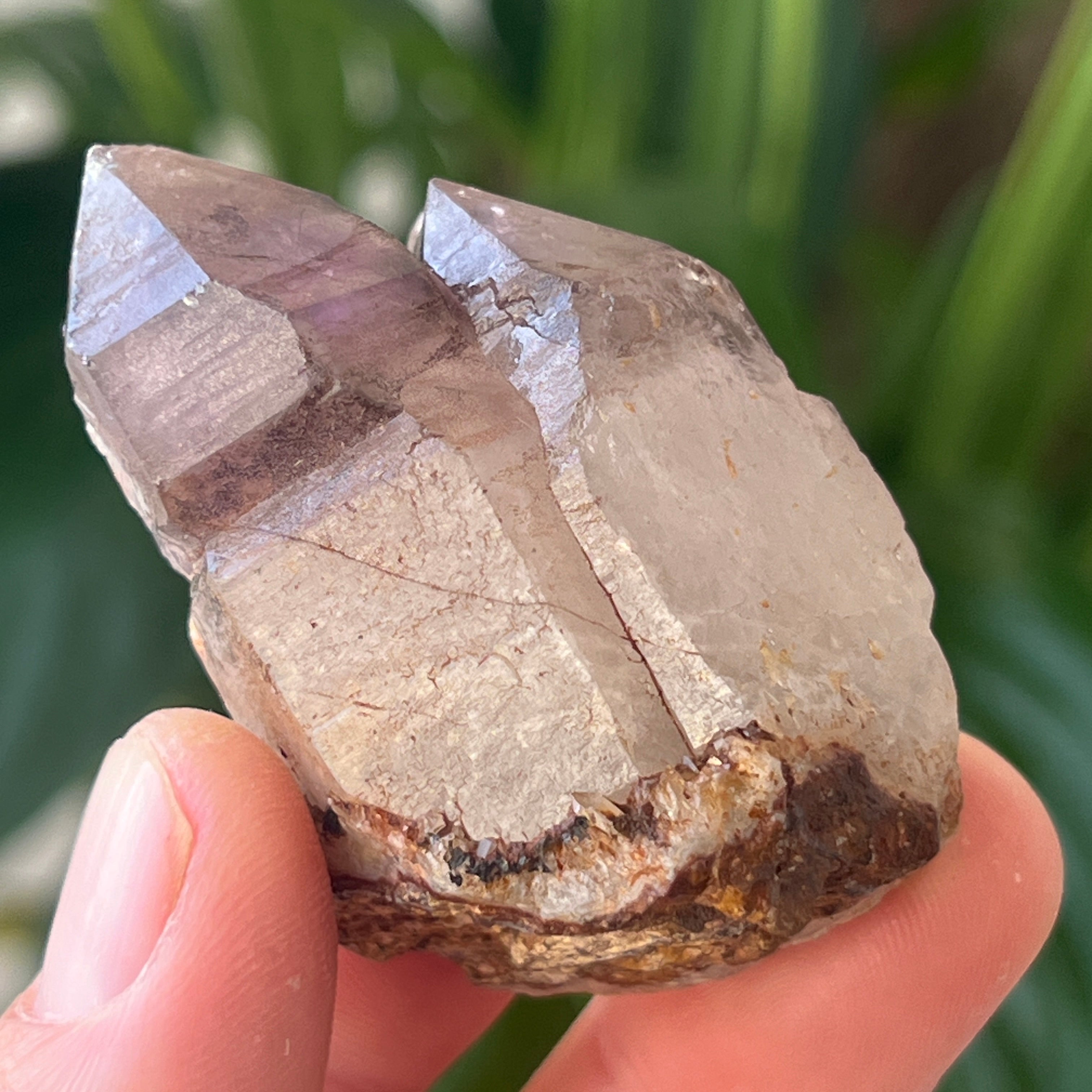 Cristallisant dans le système trigonal, ce spécimen de SiO₂ (dioxyde de silicium) se distingue par son excellente transparence et ses formes hexagonales naturelles. Certaines pièces incluent des "fantômes" - des contours internes qui reflètent les premiers stades de croissance - ou montrent des bulles mobiles de fluide hydrothermal, d'hématite ou de goethite, toutes capturées à l'intérieur du cristal il y a des millions d'années.