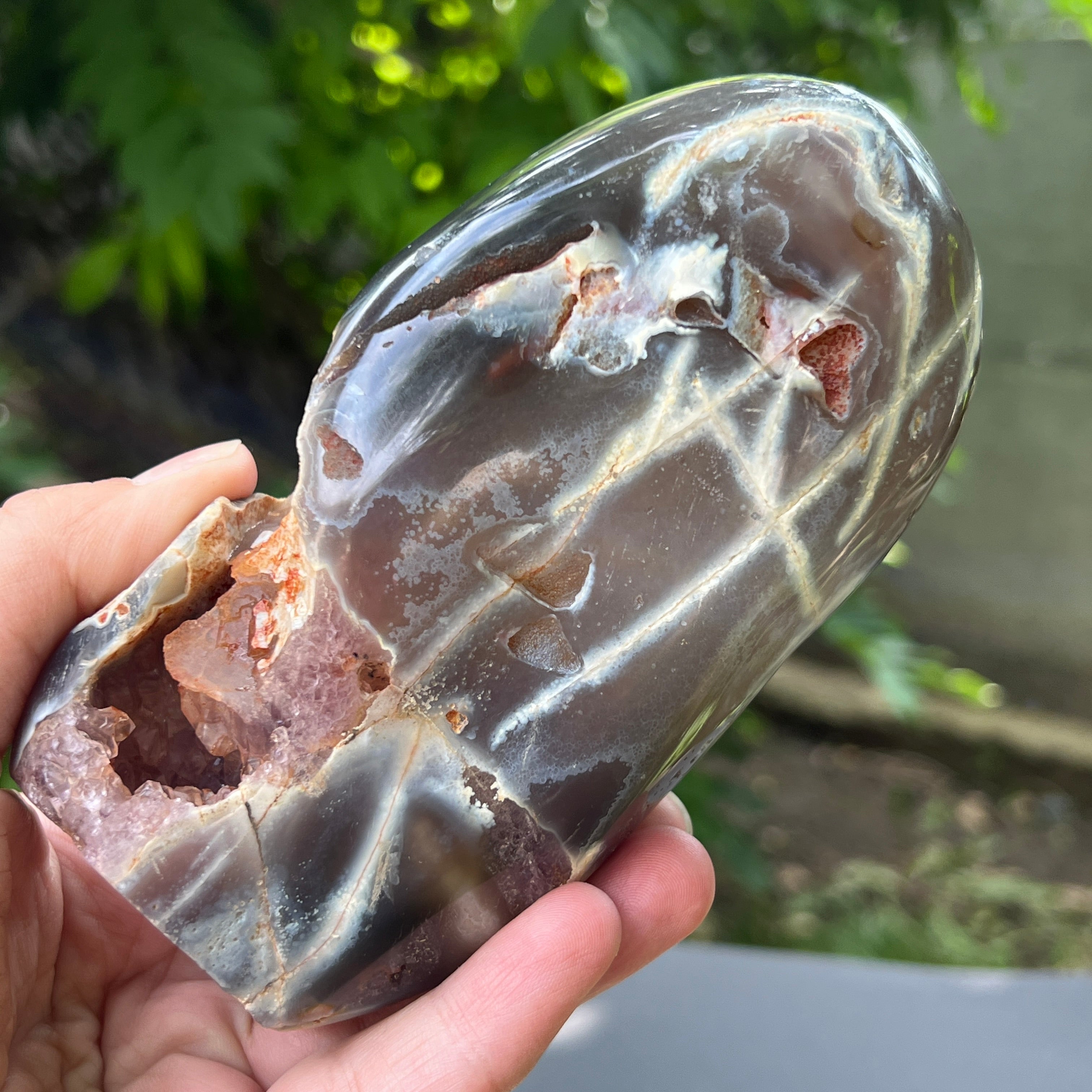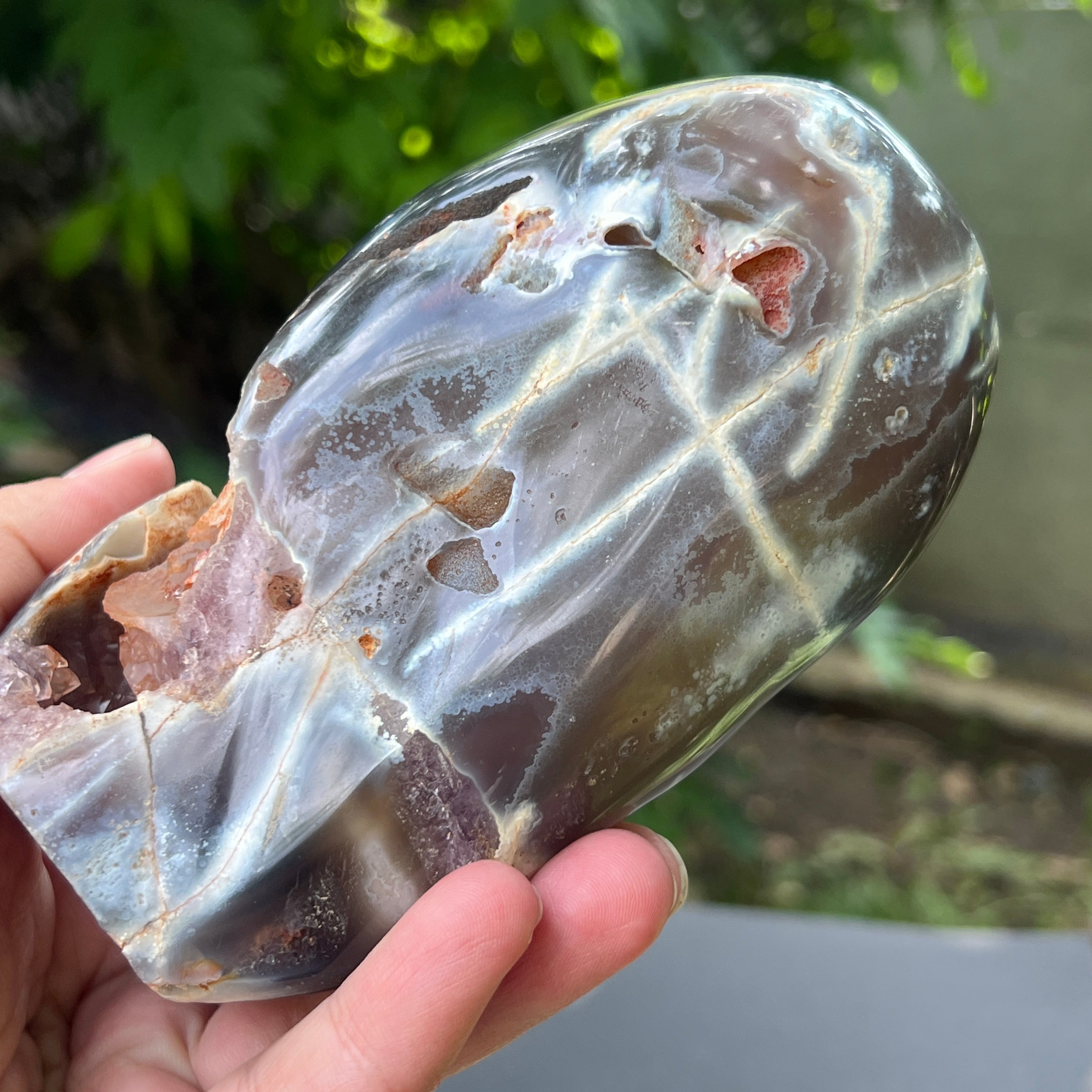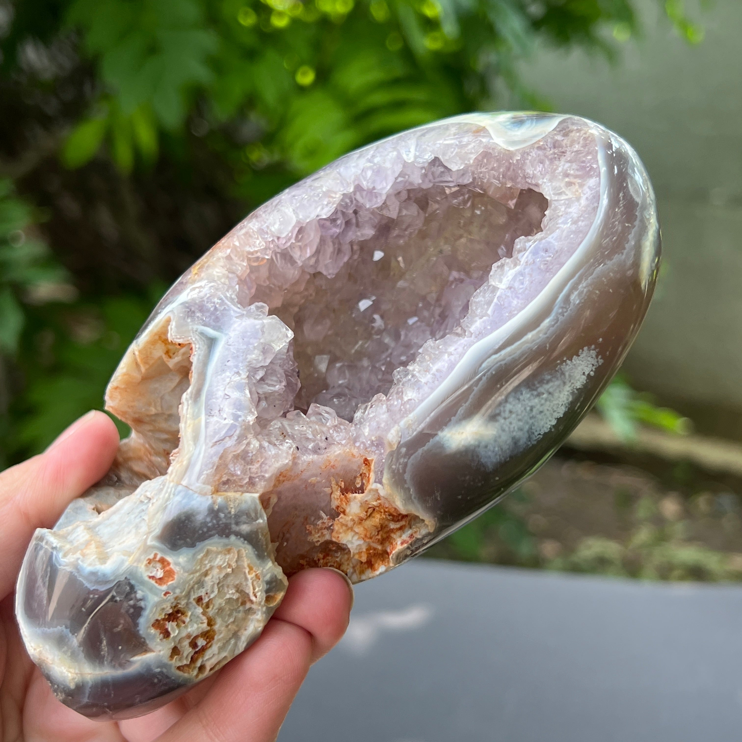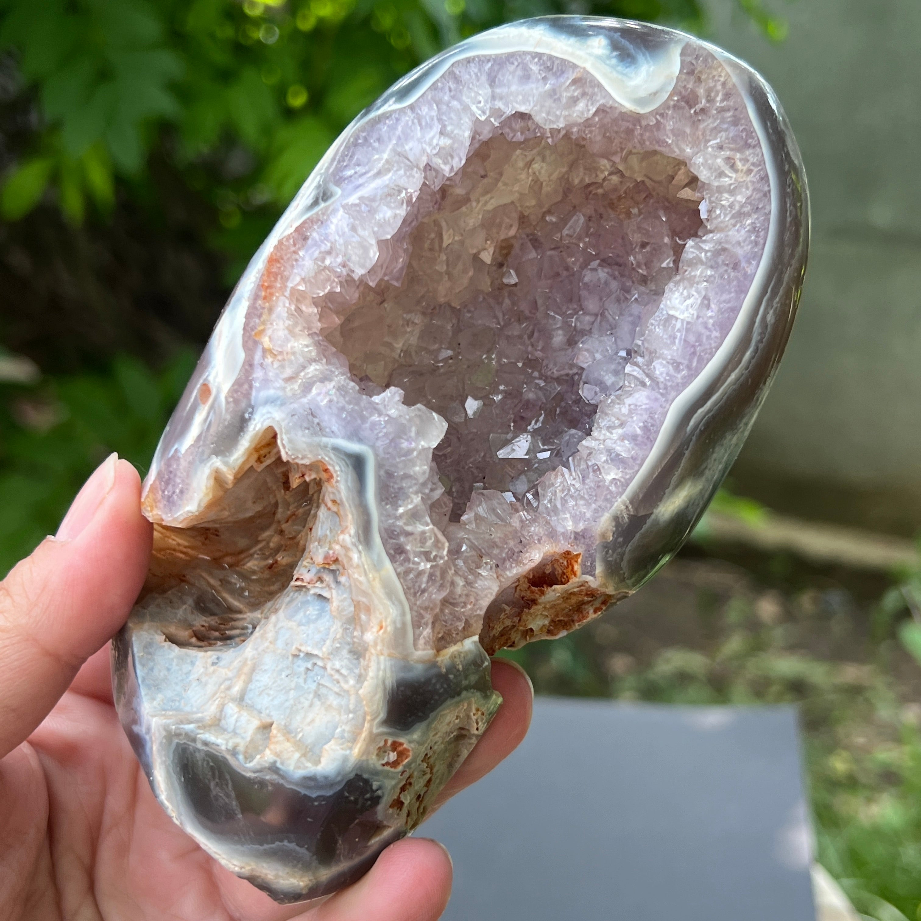 Cette géode spectaculaire combine le mystère profond de l'améthyste avec la tranquillité stratifiée de l'agate, révélant un trésor de nature sculpté par le temps et l'énergie. Chaque détail de son intérieur caché - des cristaux d'améthyste brillants dans des nuances violets - est mis en évidence par le contour fin et stable de l'agate, comme un cœur protégé par une écorce de sagesse.
