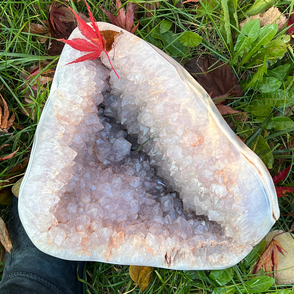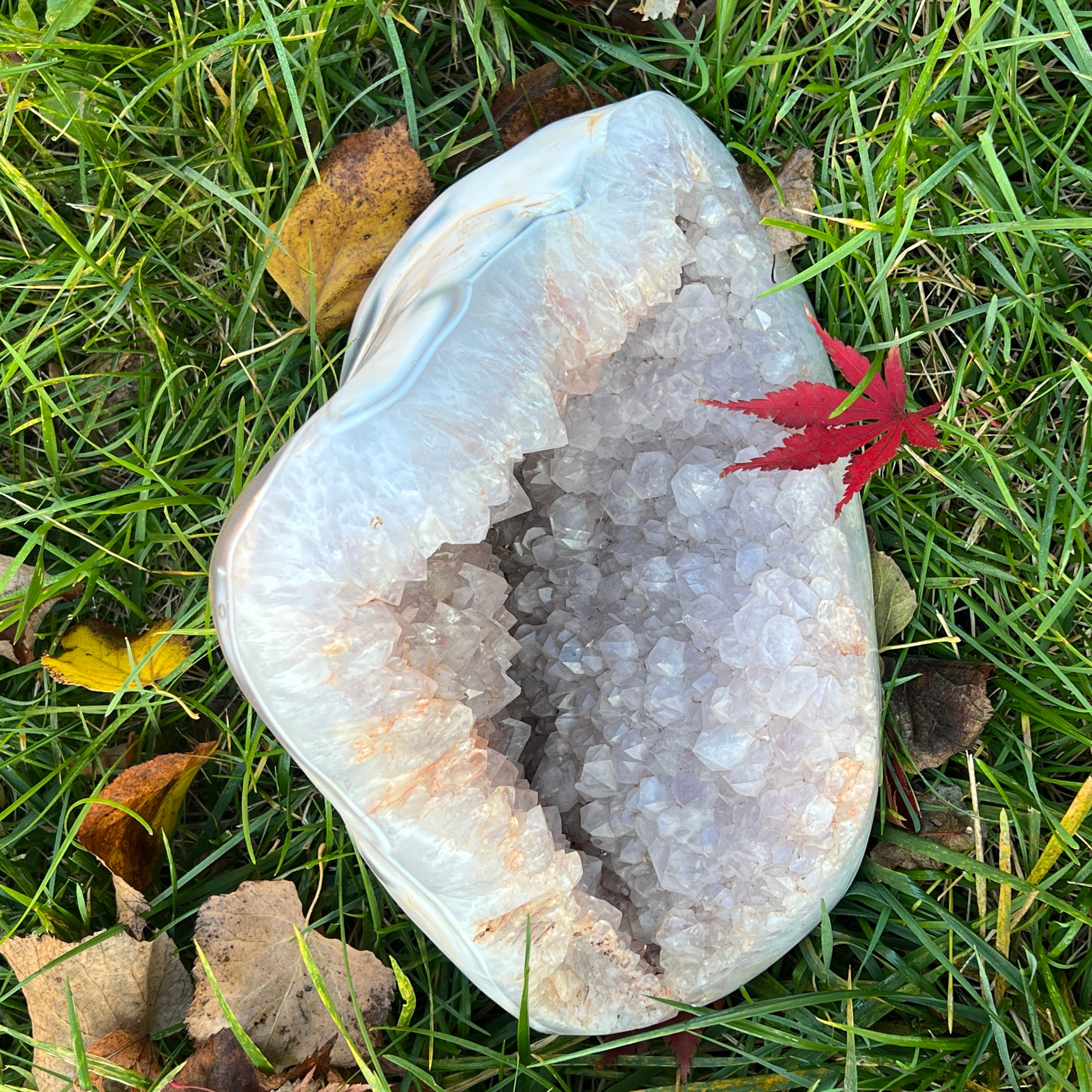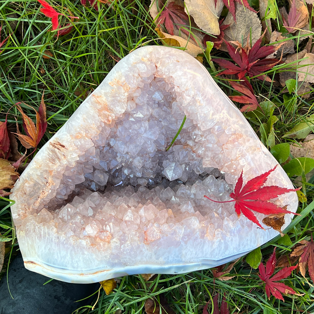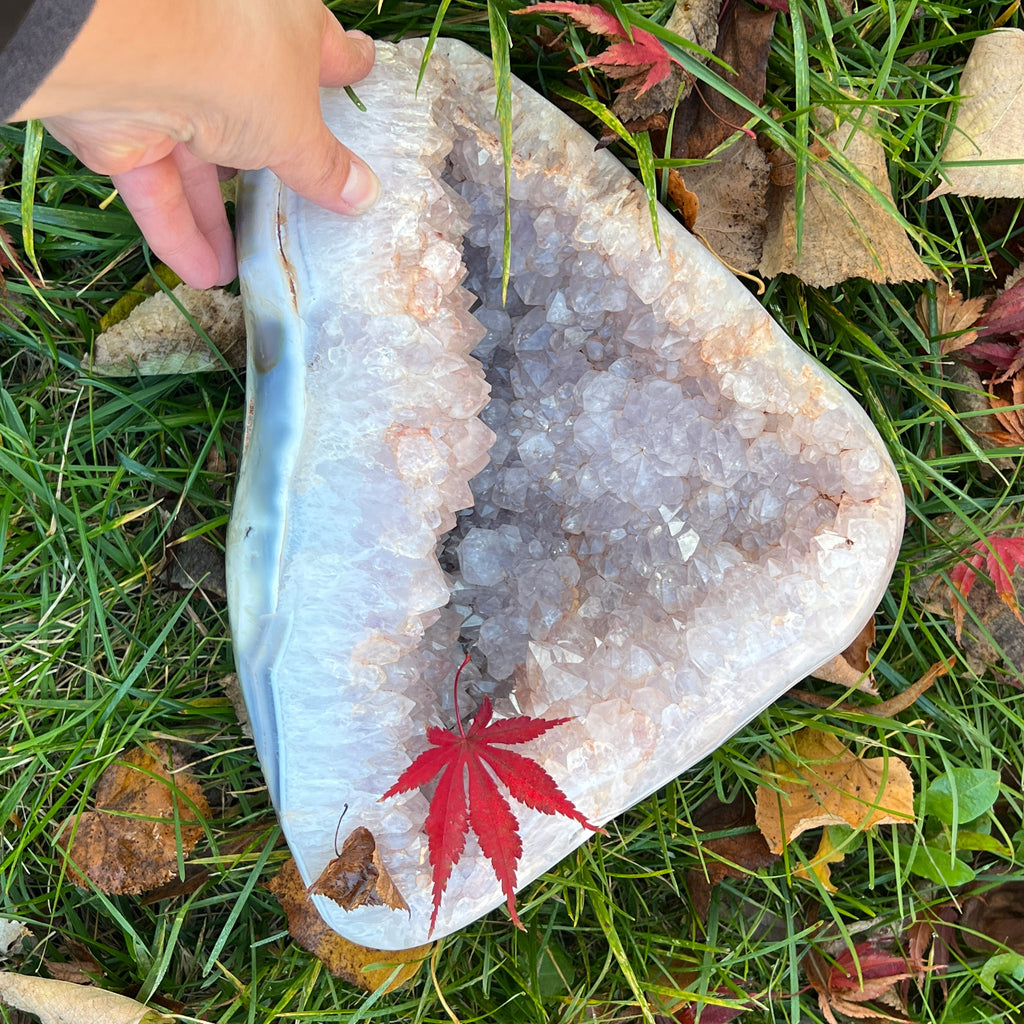 Această geodă naturală de agat cu cristale de ametist este o operă a naturii născută din răbdarea timpului. În straturile sale concentrice de agat se deschide un sanctuar violet, în care ametistul a cristalizat în forme delicate, ca niște petale înflorite în adâncul pământului.