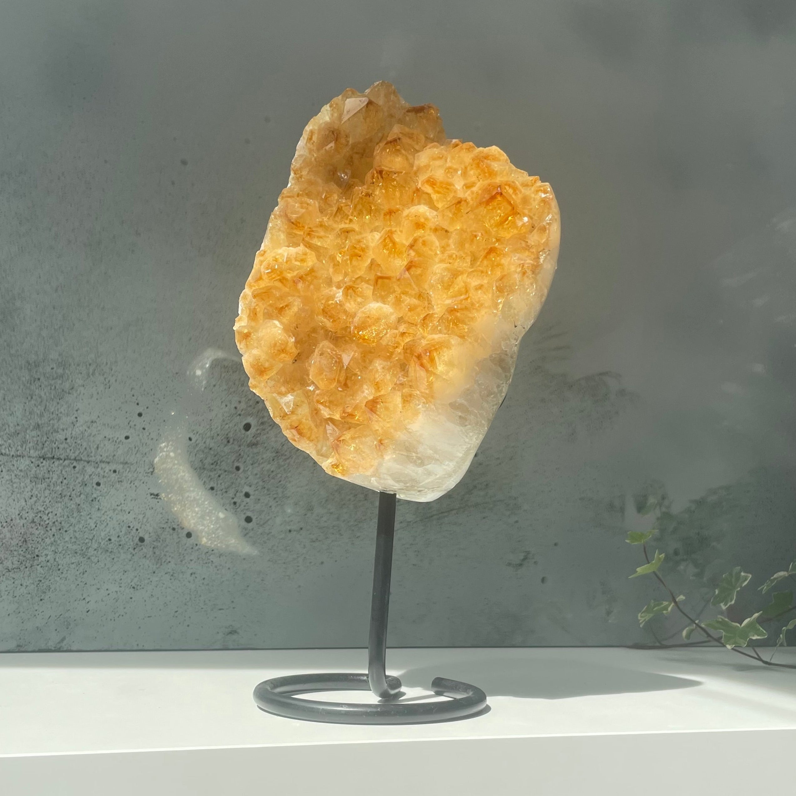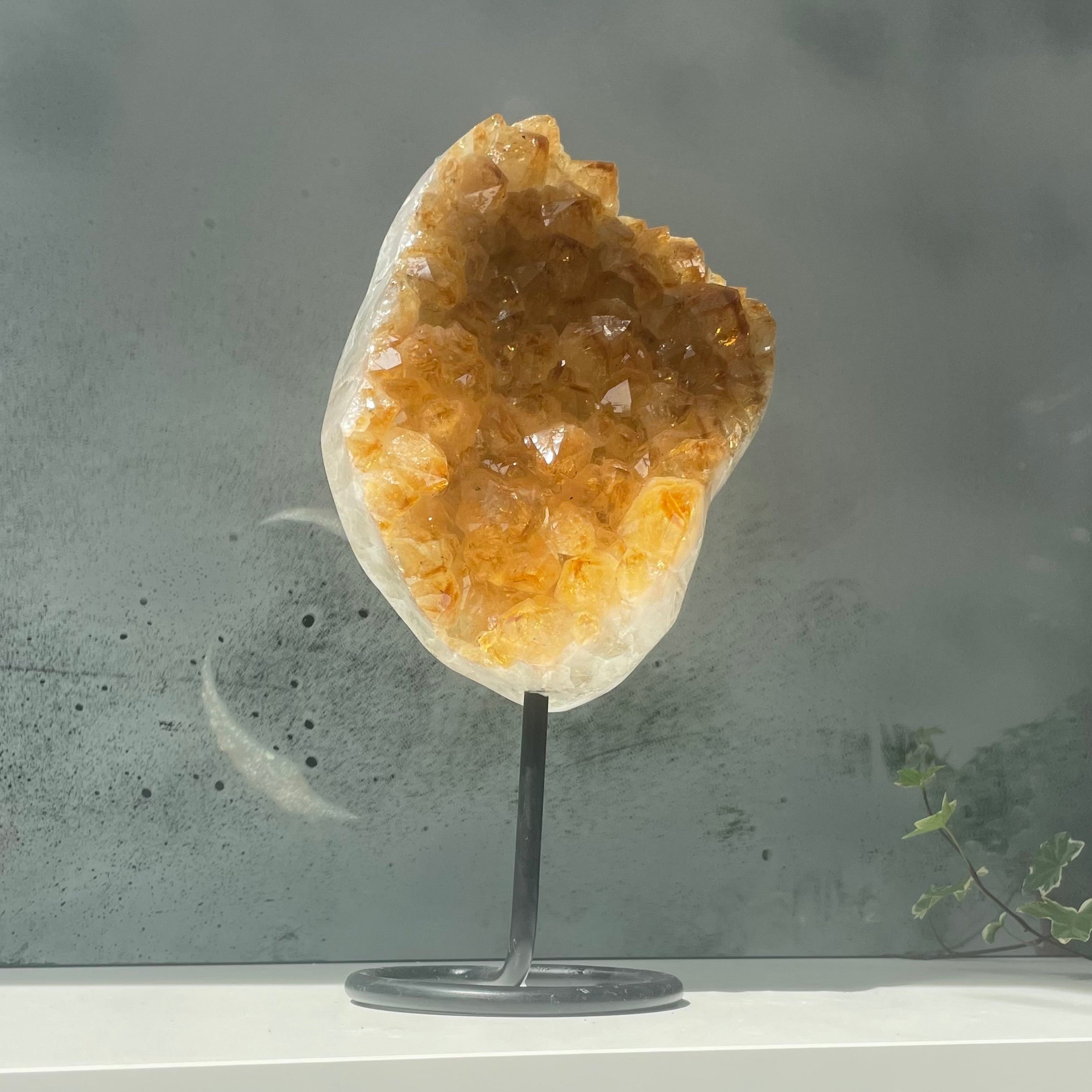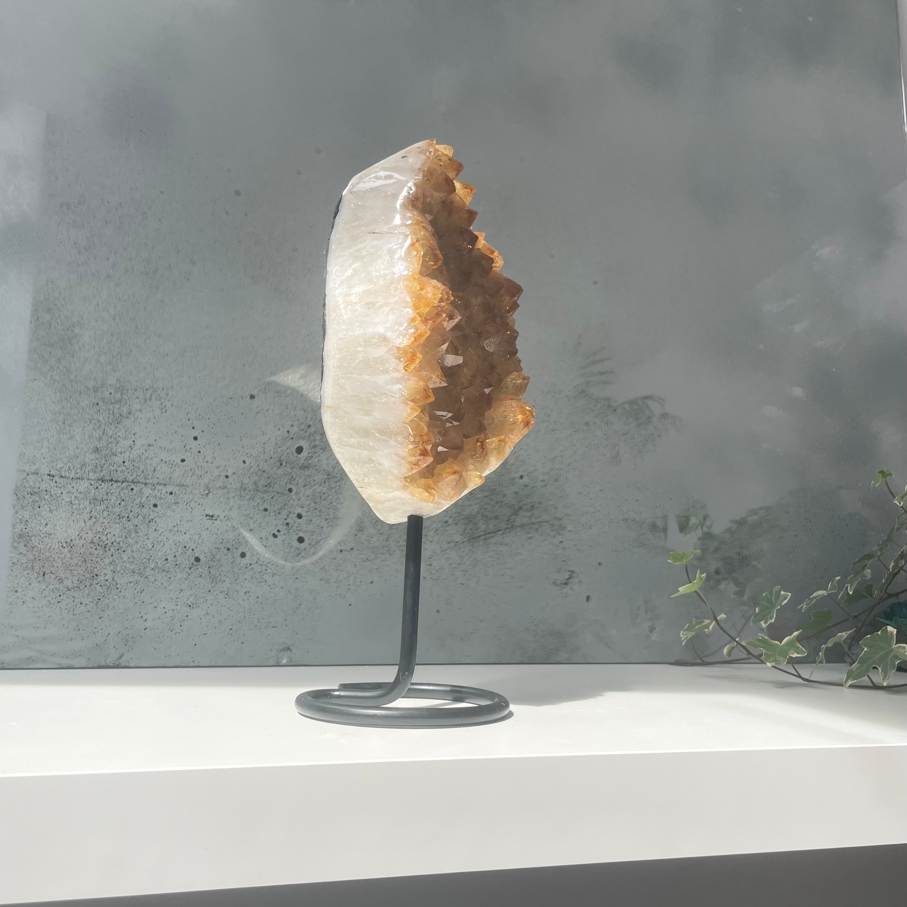 La géode de citrine présentée est une pièce unique, où la nature a laissé son empreinte de manière spectaculaire. Les cristaux étincelants, dans des nuances chaudes de jaune-doré, reflètent la lumière de façon vibrante, apportant énergie et élégance à tout espace.