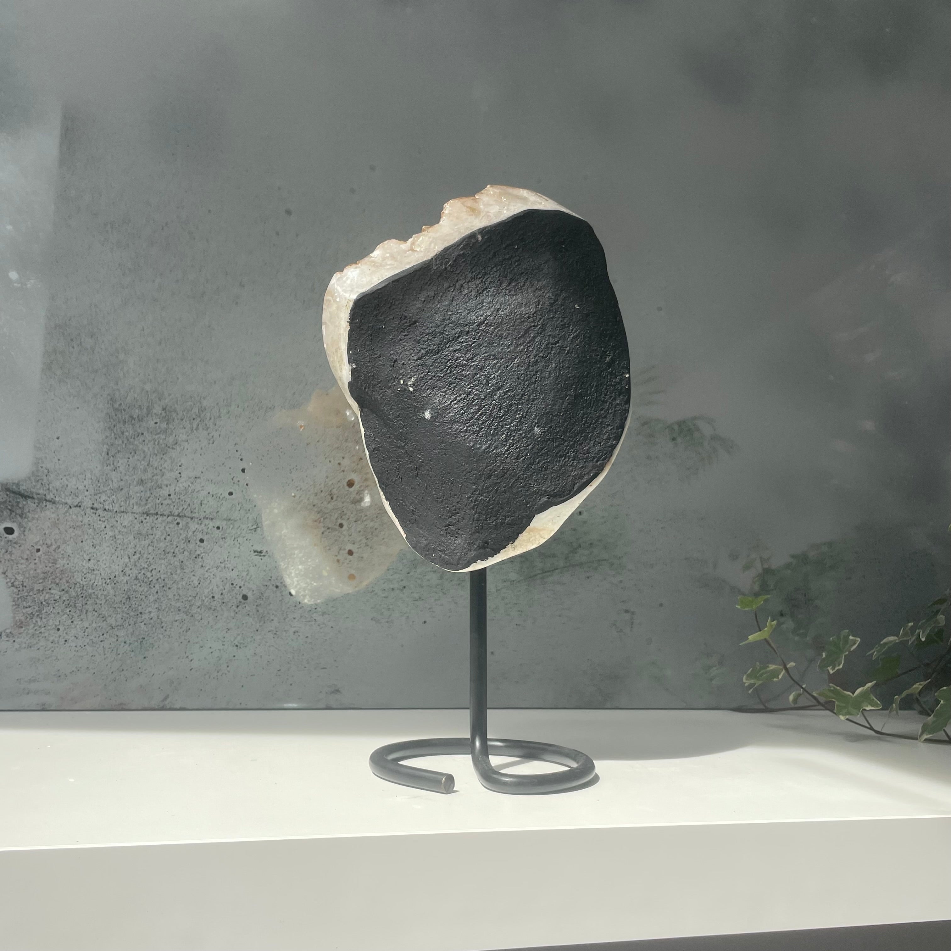 Montée sur socle, cette géode devient un objet décoratif d'impact, idéal pour un bureau, un salon ou des espaces de détente. Sa forme naturelle et sa texture cristalline créent un contraste fascinant entre l'extérieur brut et l'intérieur lumineux.