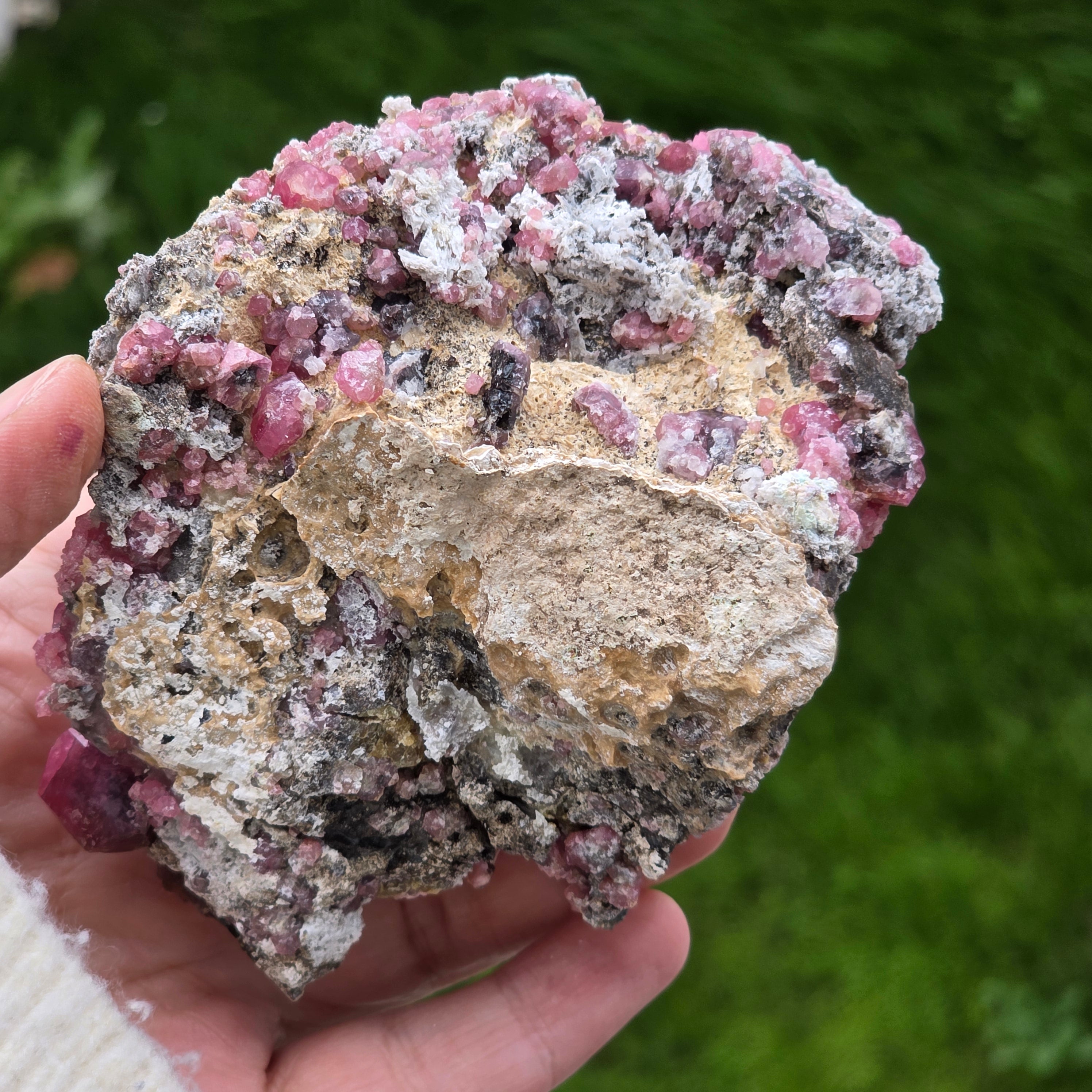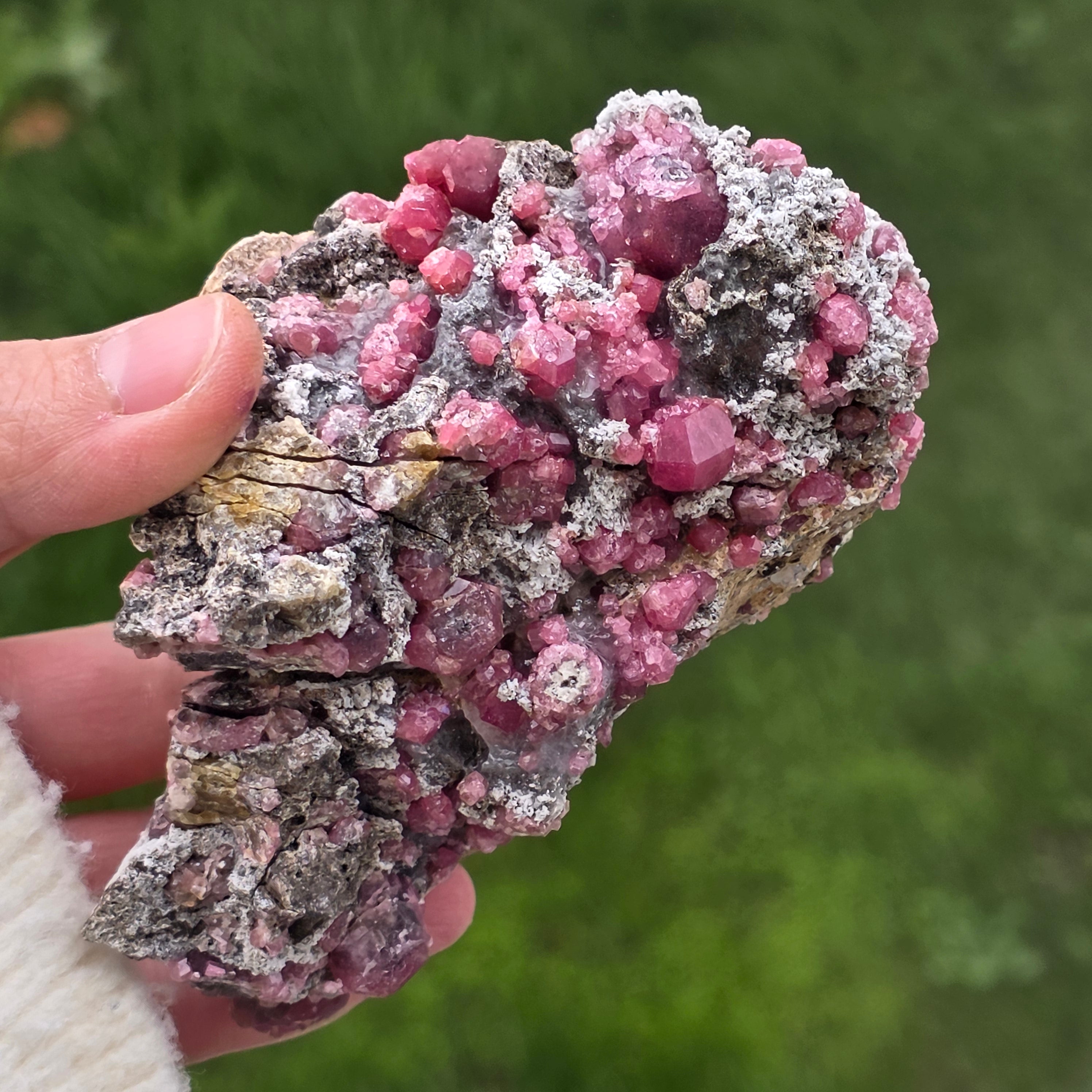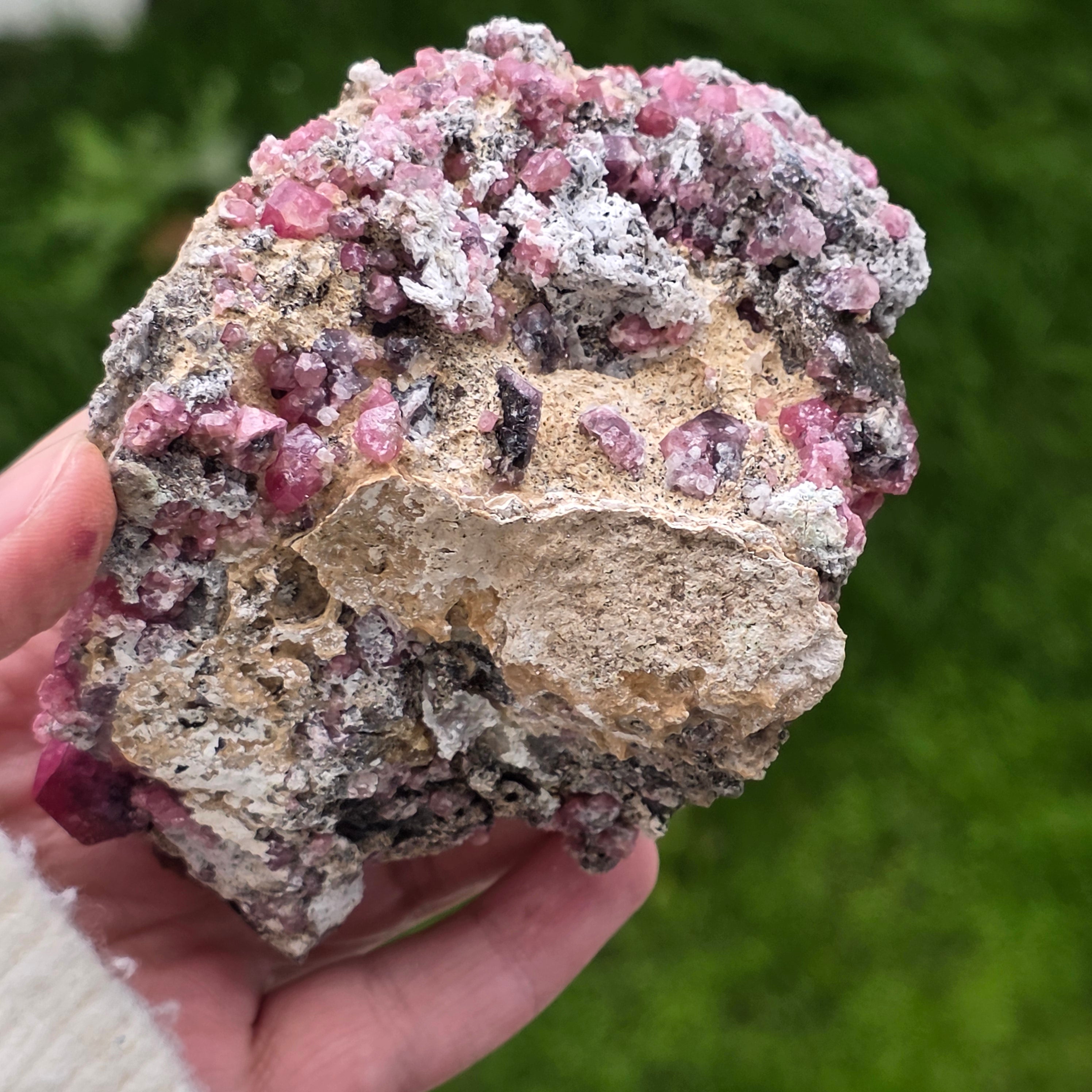 Cristalele de granat roz sunt vizibile direct în matrice, cu forme naturale bine definite, crescute organic în structura rocii. Contrastul dintre nuanțele calde ale granatului și textura brută a matricei oferă specimenului un aspect echilibrat și autentic, specific pieselor destinate colecției. Prezența matricei păstrează contextul de formare al mineralului, sporind atât valoarea estetică, cât și cea mineralogică.