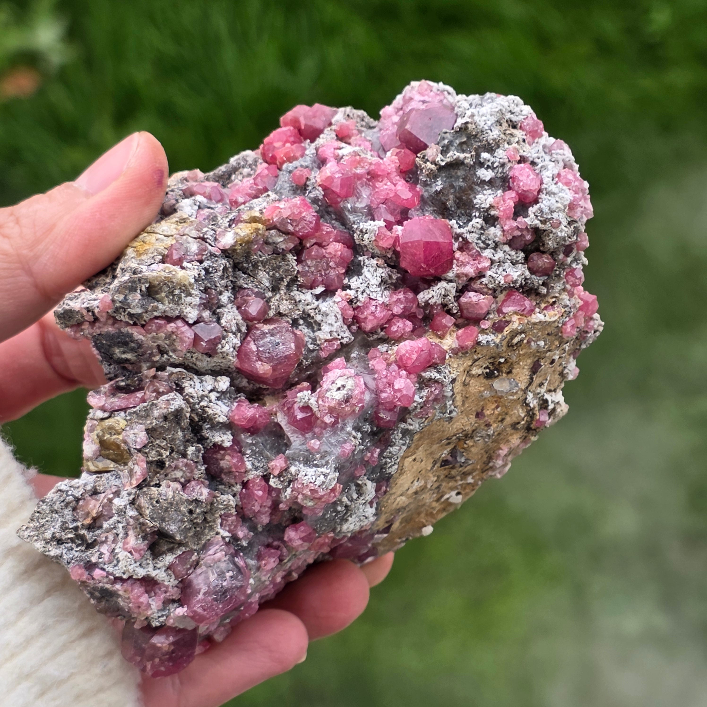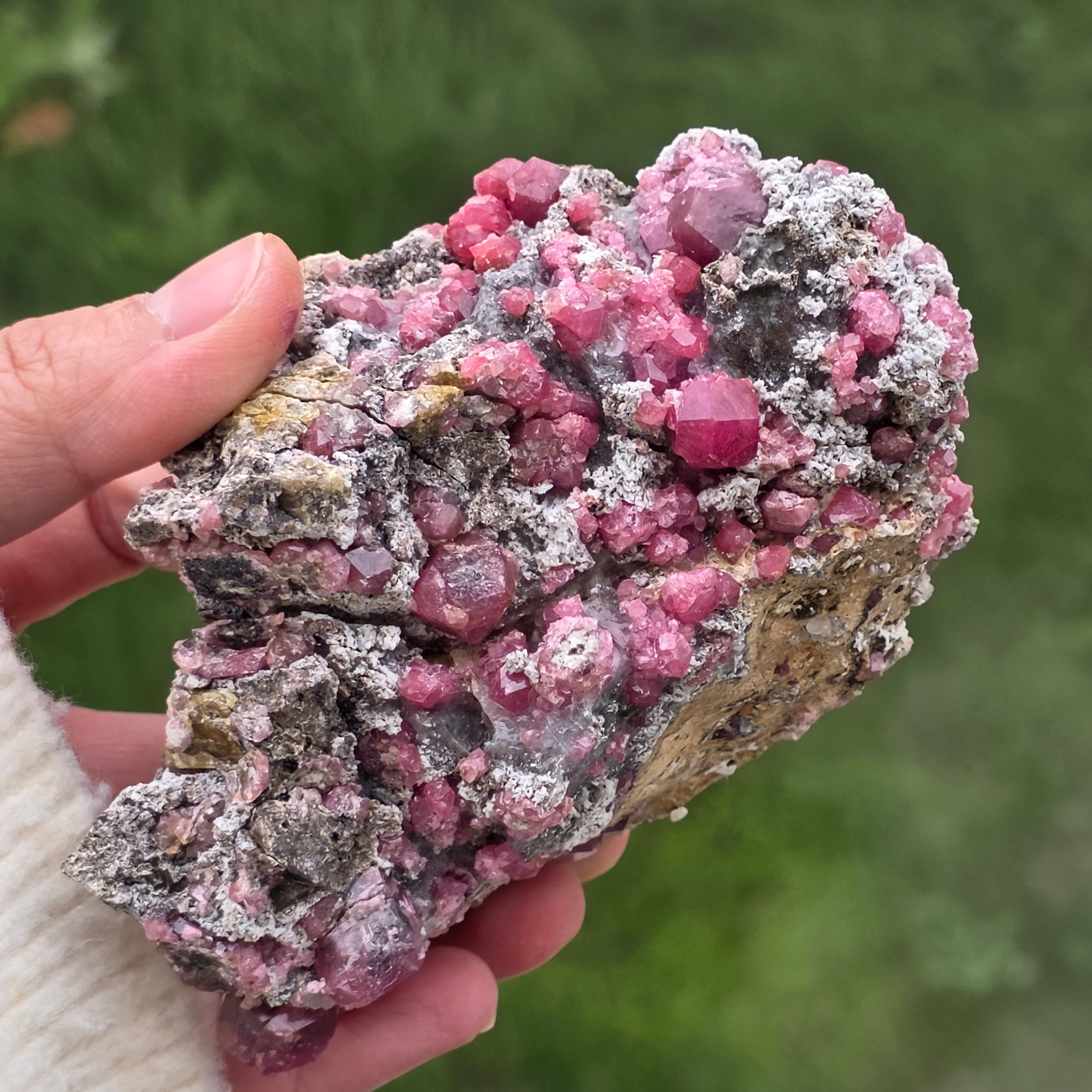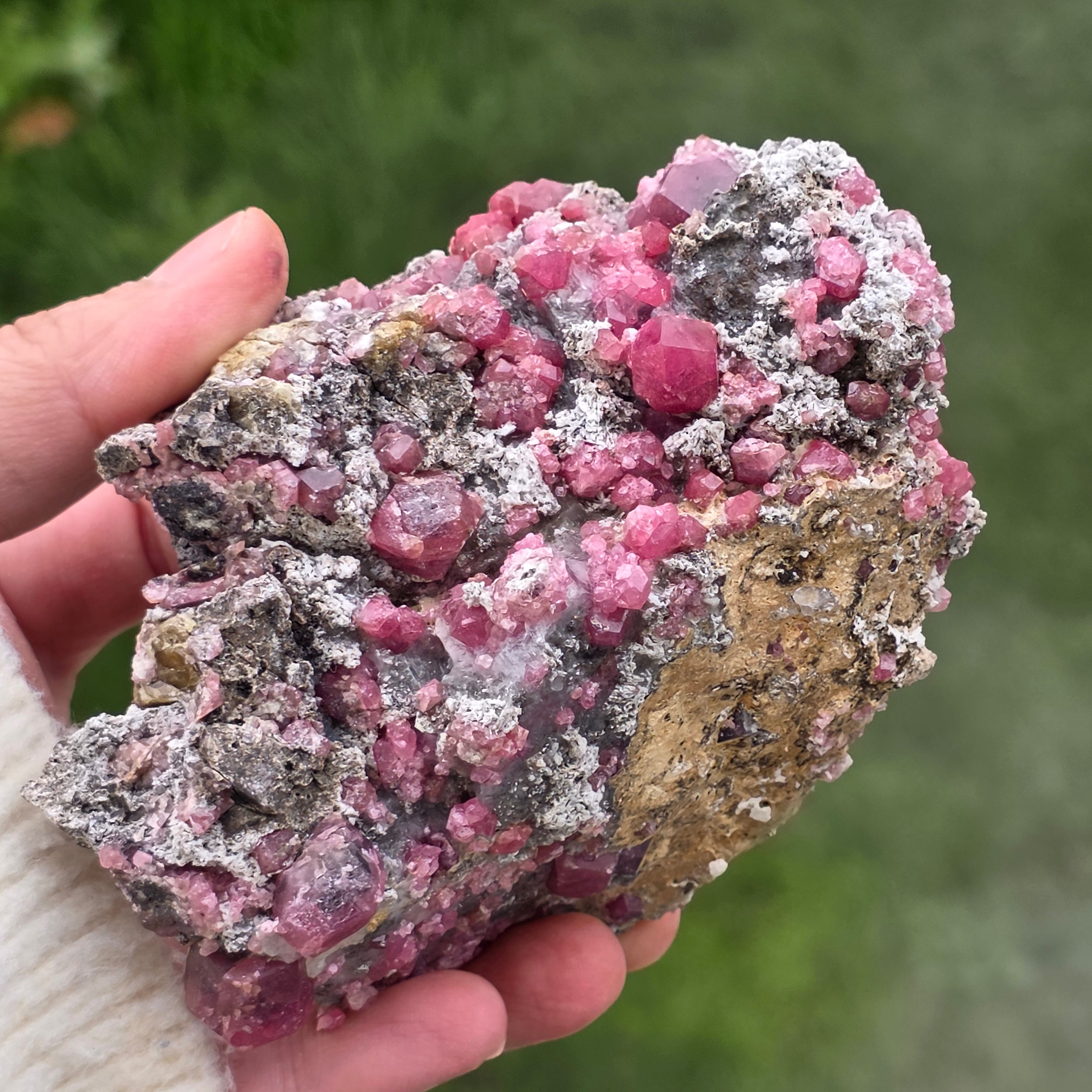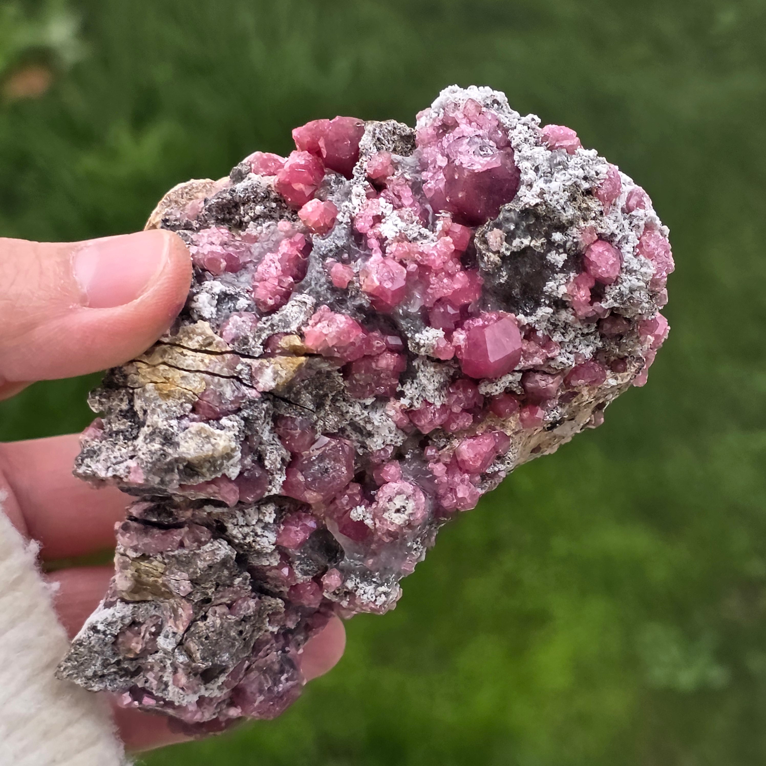 Cristalele de granat roz sunt vizibile direct în matrice, cu forme naturale bine definite, crescute organic în structura rocii. Contrastul dintre nuanțele calde ale granatului și textura brută a matricei oferă specimenului un aspect echilibrat și autentic, specific pieselor destinate colecției. Prezența matricei păstrează contextul de formare al mineralului, sporind atât valoarea estetică, cât și cea mineralogică.