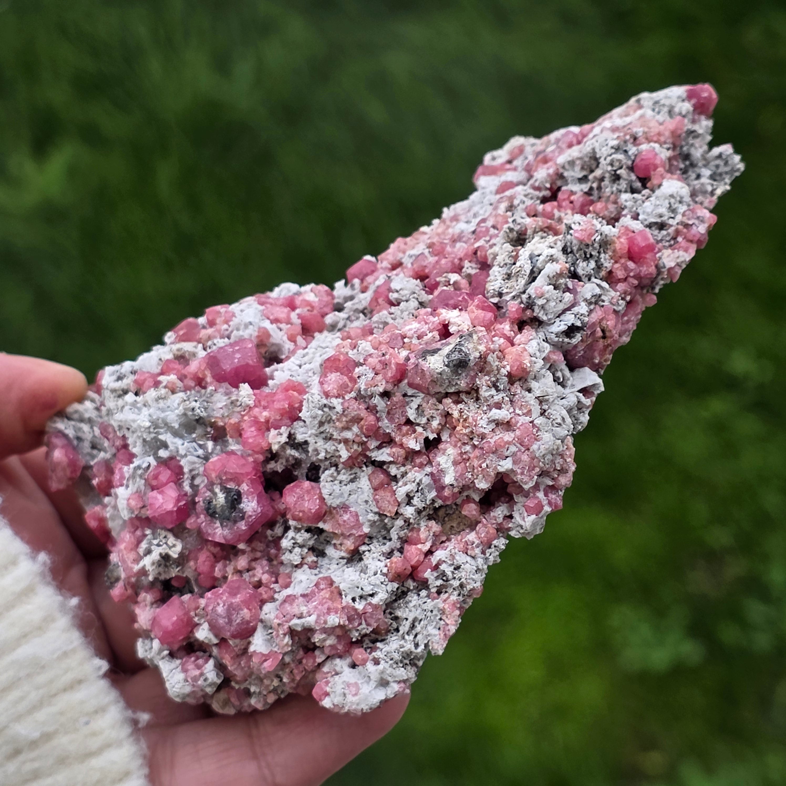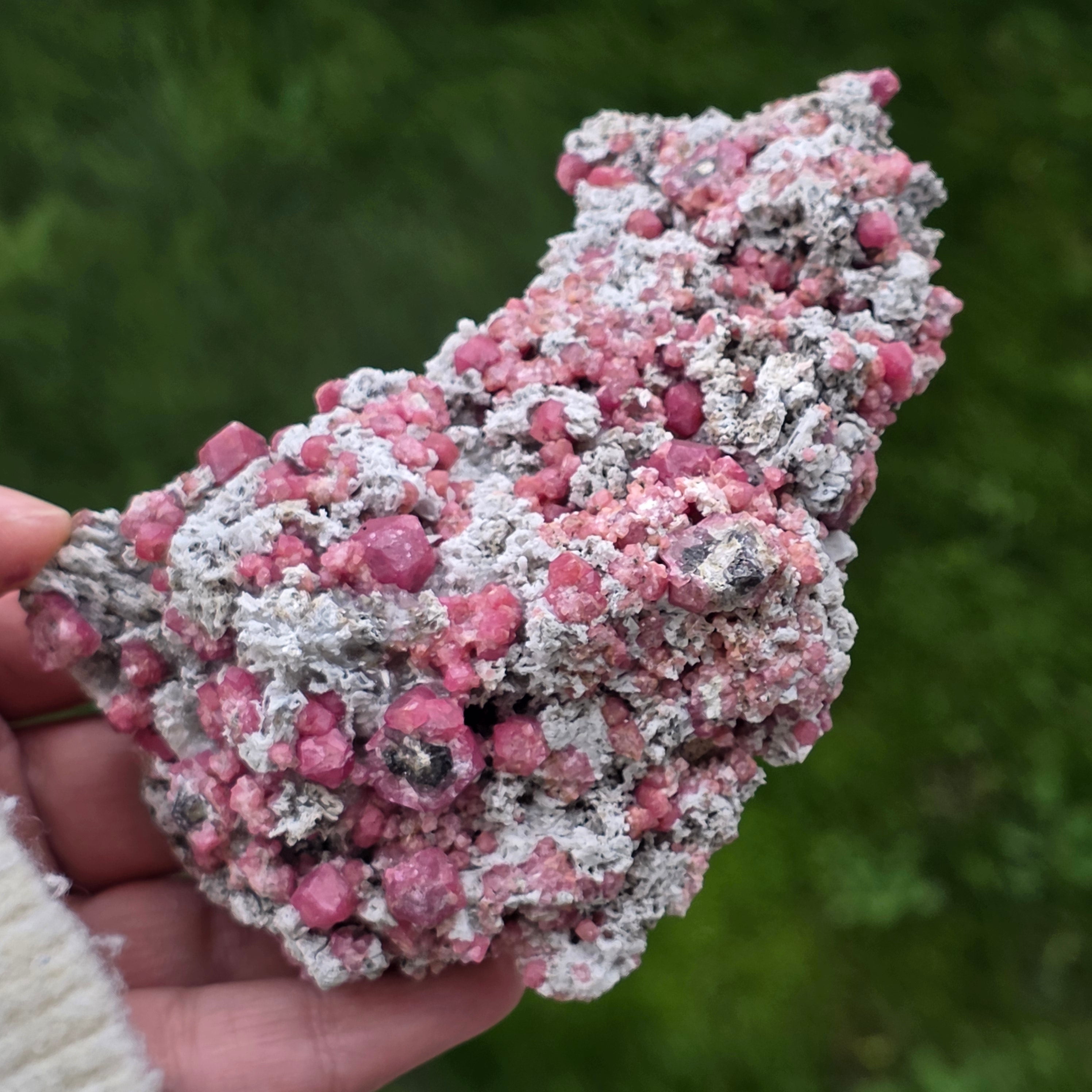 Cristalele de granat roz sunt vizibile direct în matrice, cu forme naturale bine definite, crescute organic în structura rocii. Contrastul dintre nuanțele calde ale granatului și textura brută a matricei oferă specimenului un aspect echilibrat și autentic, specific pieselor destinate colecției. Prezența matricei păstrează contextul de formare al mineralului, sporind atât valoarea estetică, cât și cea mineralogică.