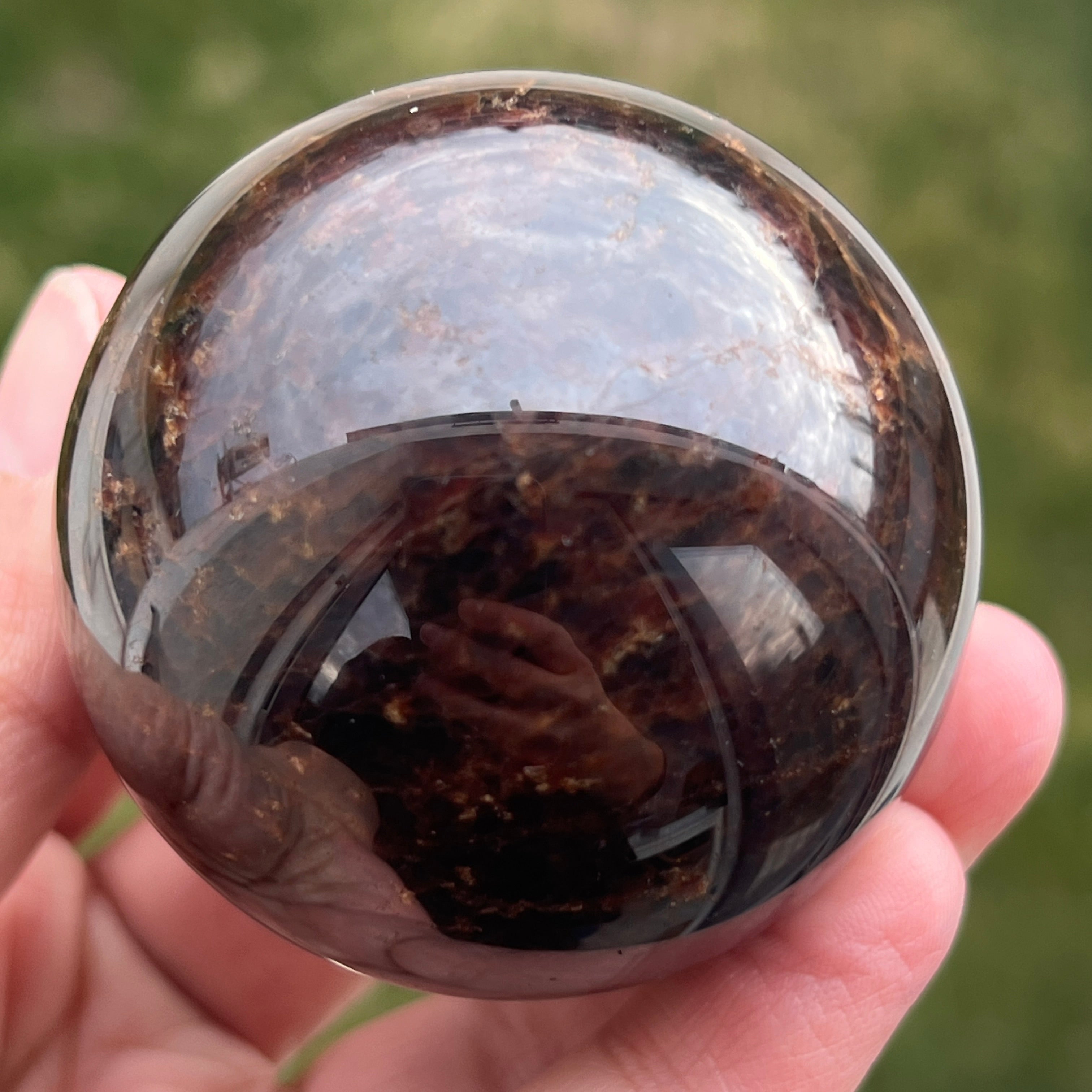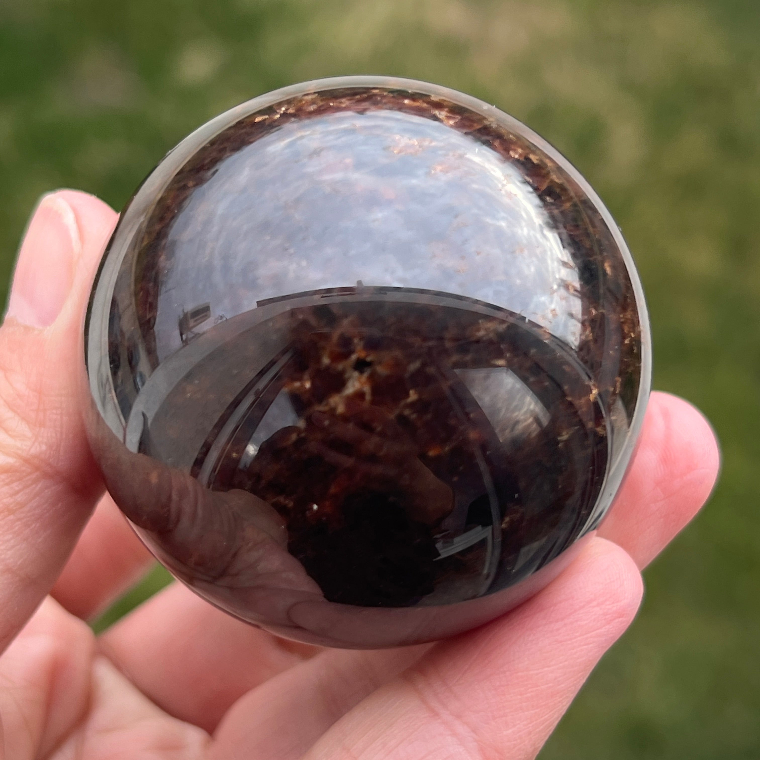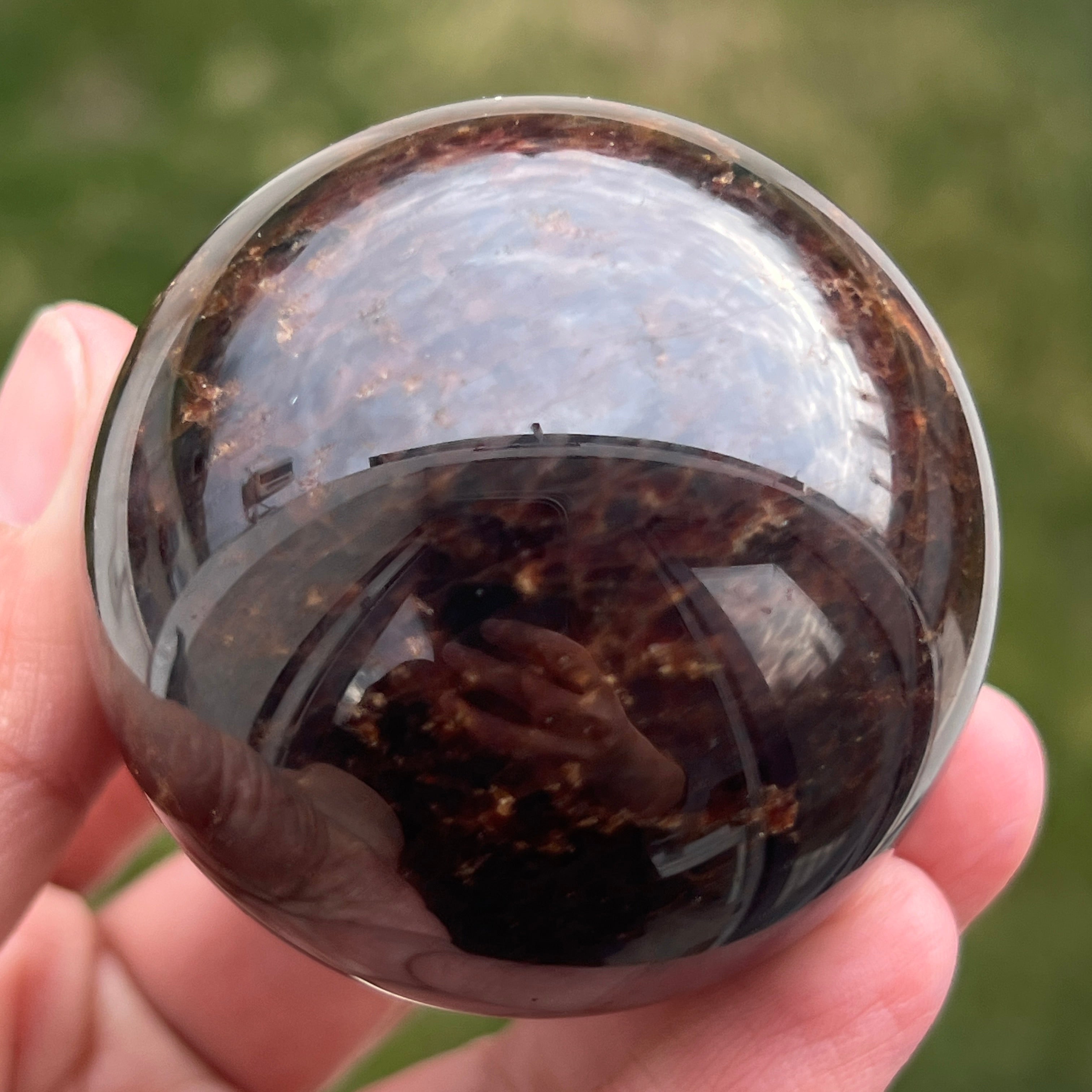 La sphère en grenat est réalisée à partir d'un minéral du groupe des silicates, connu pour sa structure cristalline compacte et pour ses nuances intenses, allant du rouge foncé à des tons profonds de cerise. En raison de sa composition, le grenat est un matériau dur et stable, ce qui le rend adapté à la transformation en formes telles que la sphère, où la texture et la couleur peuvent être observées uniformément sous tous les angles.