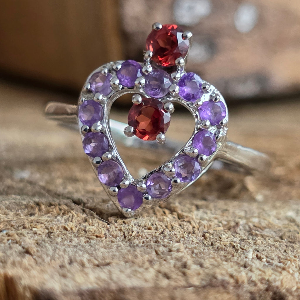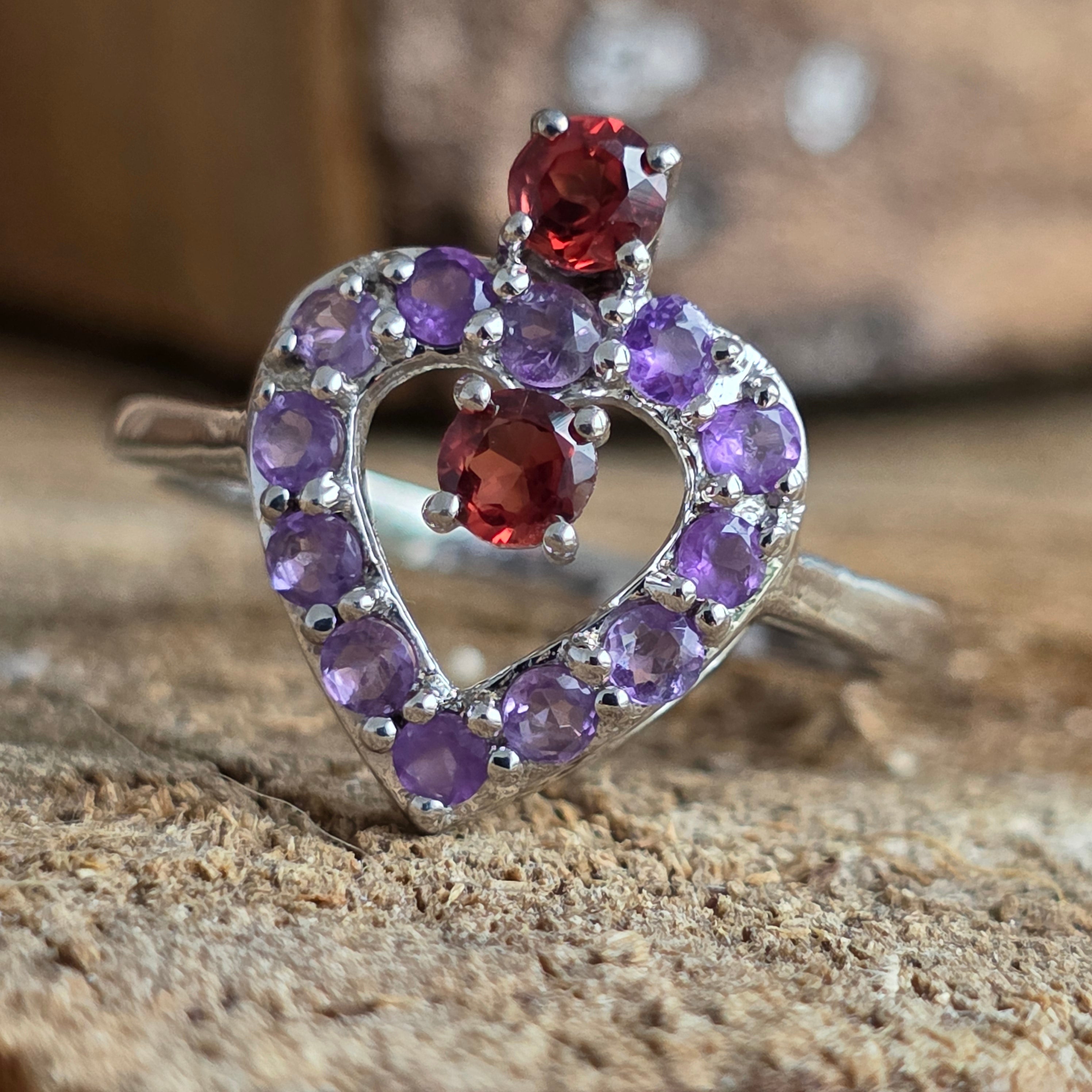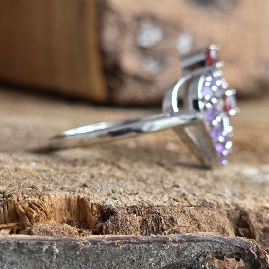 Un inel care vorbește despre iubire, echilibru și energie vie. Ametistul aduce claritate și liniște, iar Granatul aprinde pasiunea și curajul – împreună, ele creează o armonie perfectă între inimă și minte.