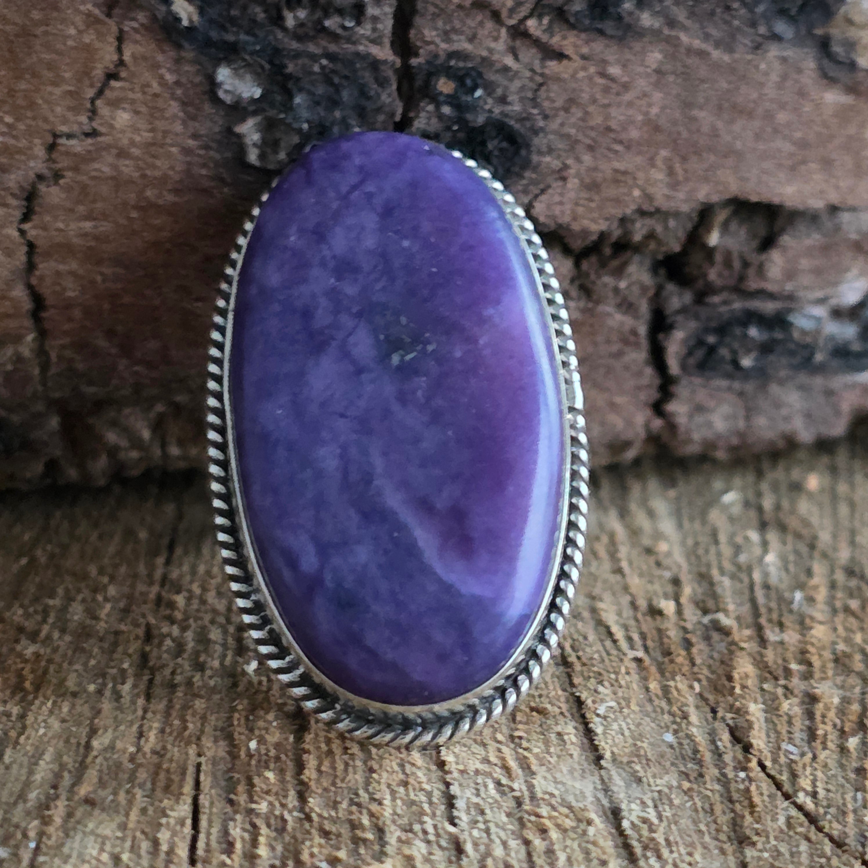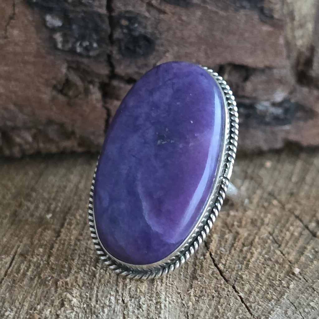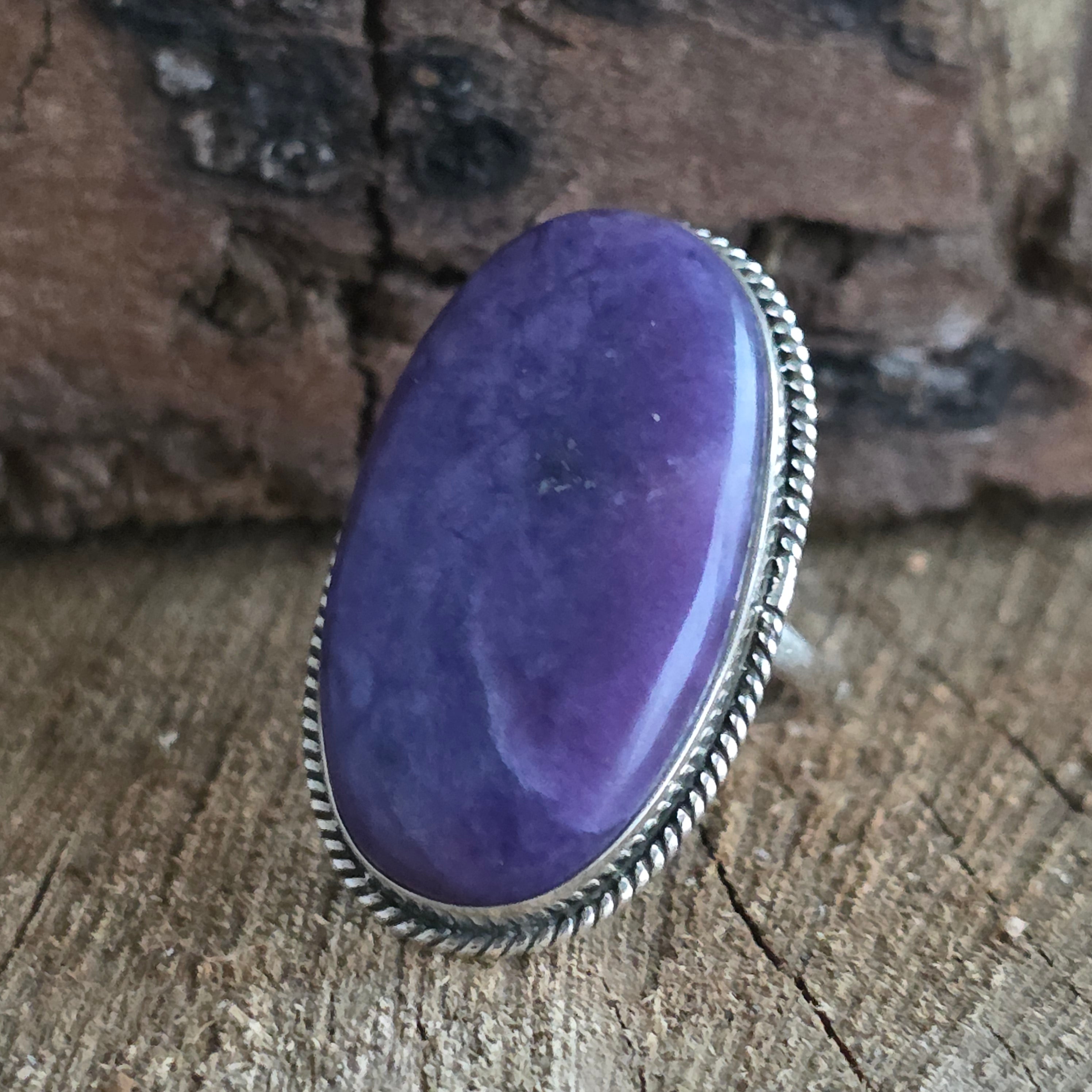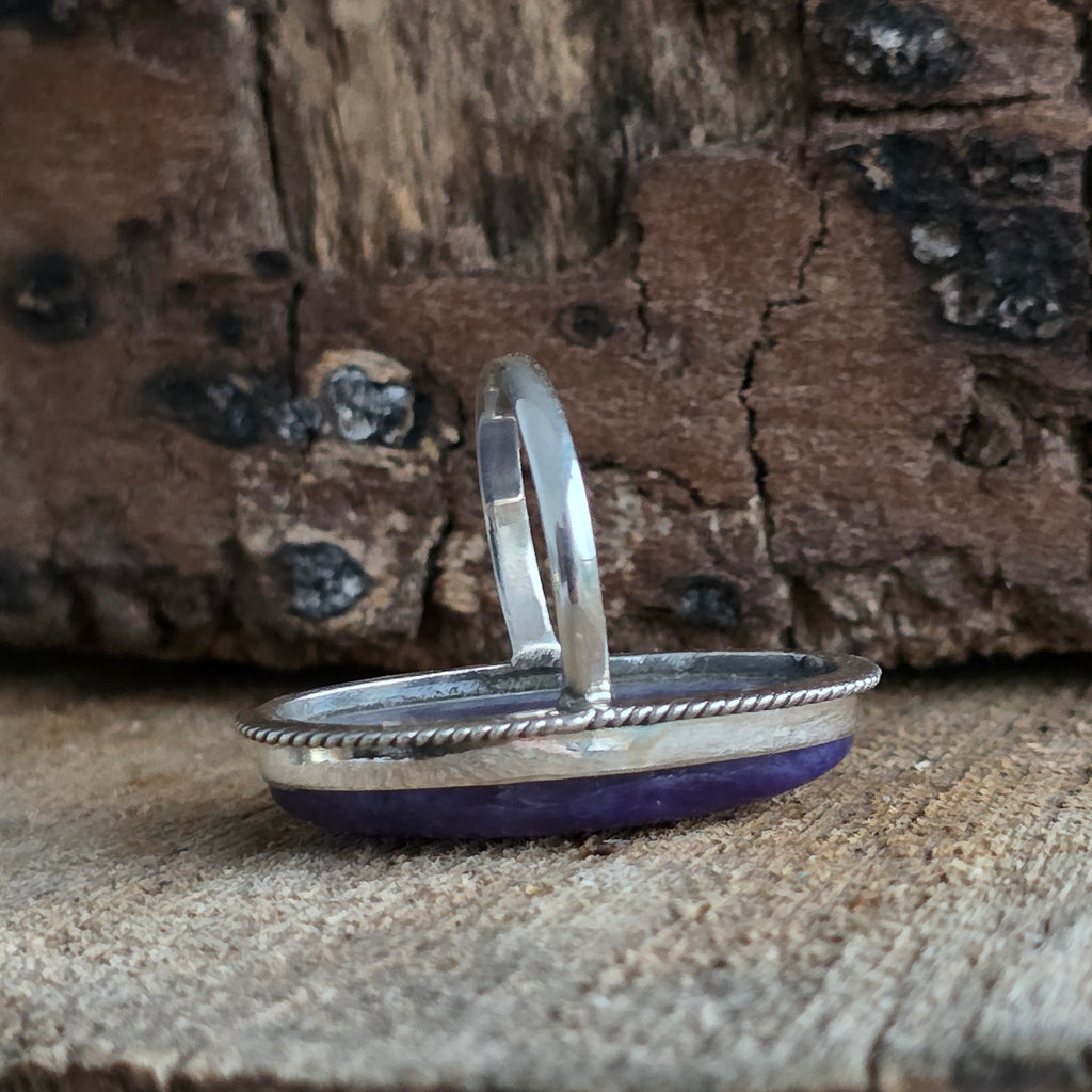 Un inel masiv, lucrat manual din argint 925, ce adăpostește o piatră naturală de Charoit, cu nuanțe vibrante de violet și reflexe mătăsoase ce amintesc de o pictură cosmică. Rama decorativă în stil twisted wire work adaugă profunzime și rafinament, echilibrând eleganța modernă cu măiestria tradițională.