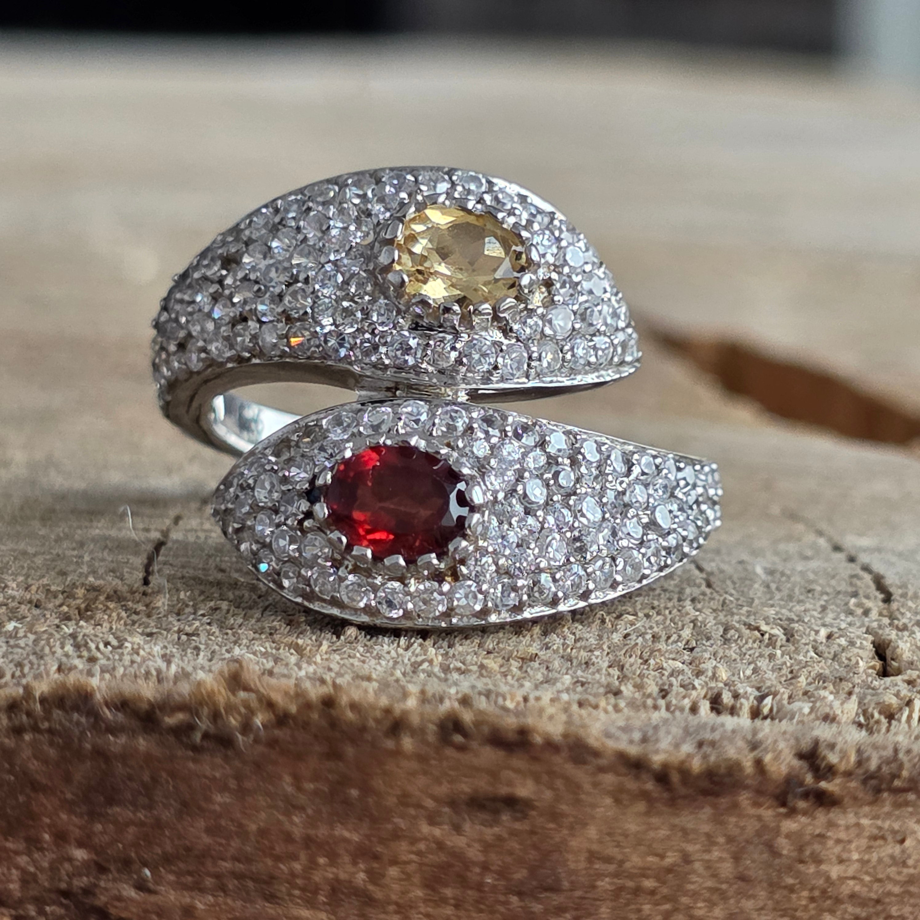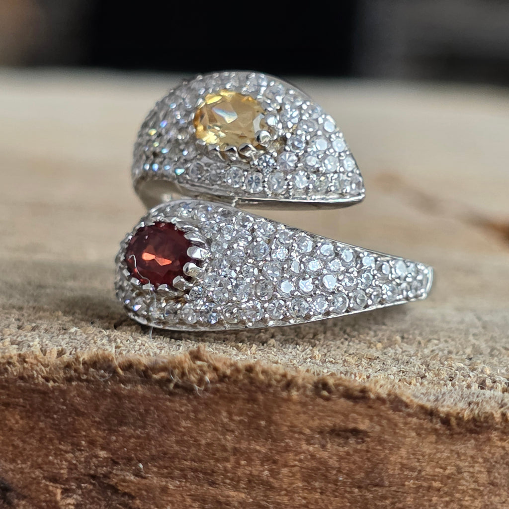 Două energii opuse se întâlnesc într-o îmbrățișare perfectă – Citrinul, cu lumina sa solară, și Granatul, cu strălucirea sa intensă, se unesc într-un dans al contrastelor și echilibrului.