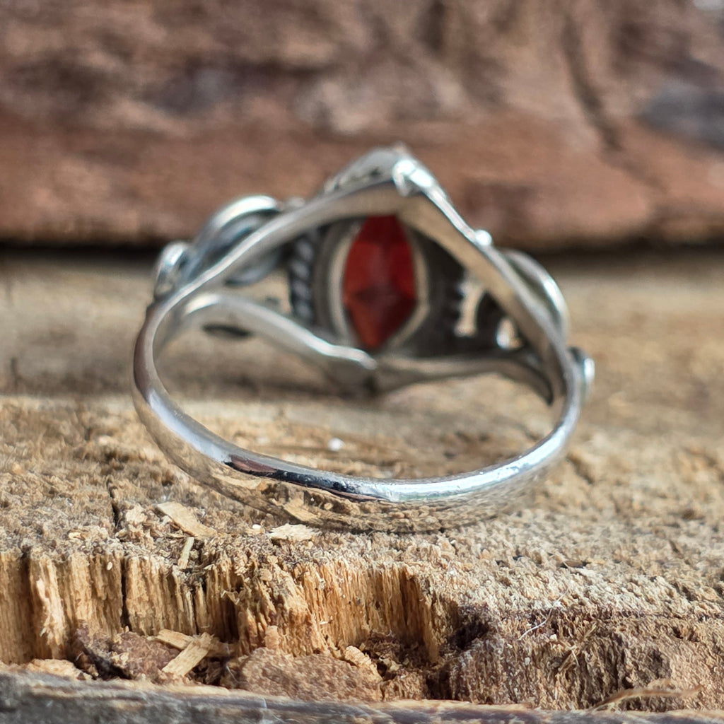 Un inel ce poartă amprenta timpului – lucrat manual din argint 925, cu detalii în fir răsucit și spirale fine ce încadrează intensitatea granatului natural.