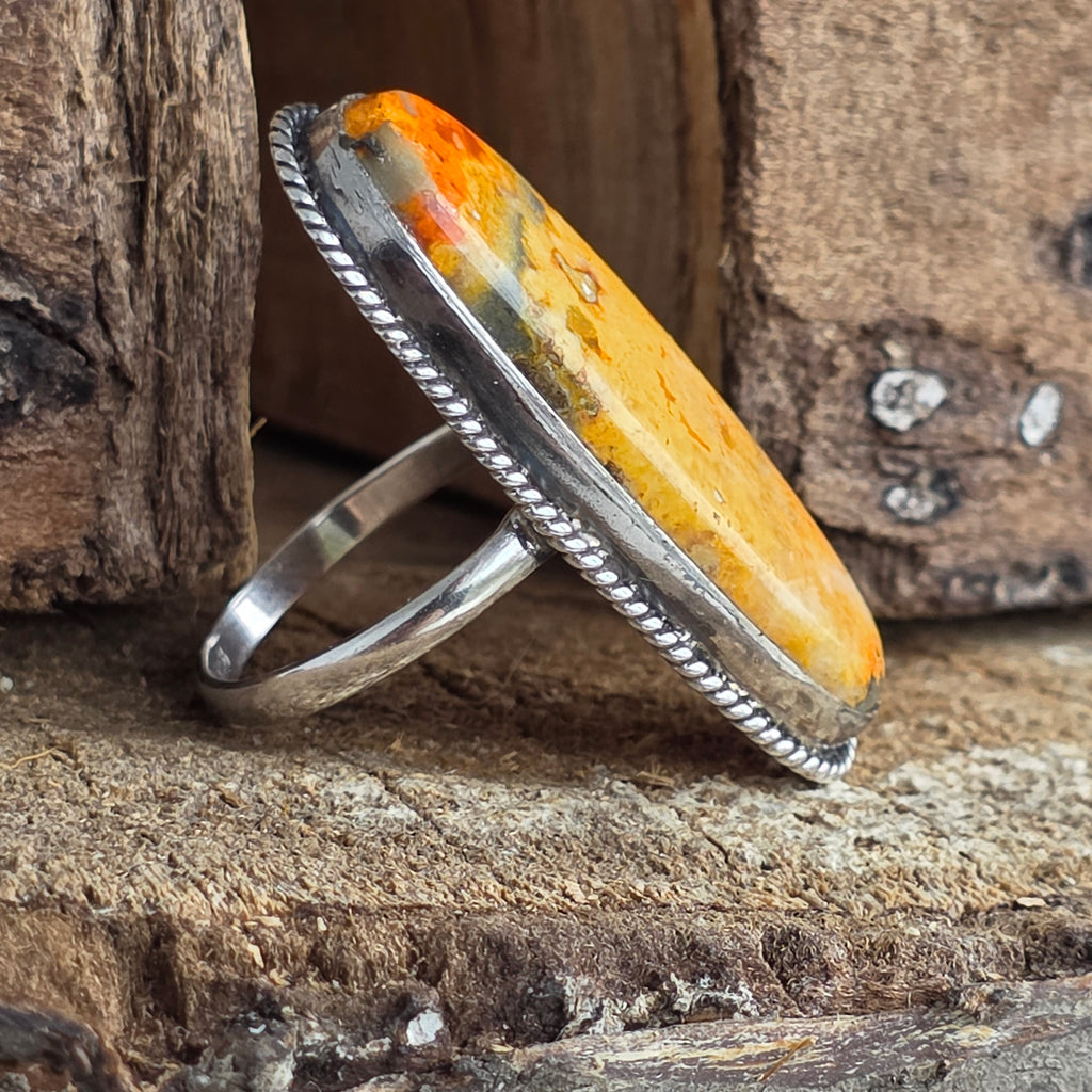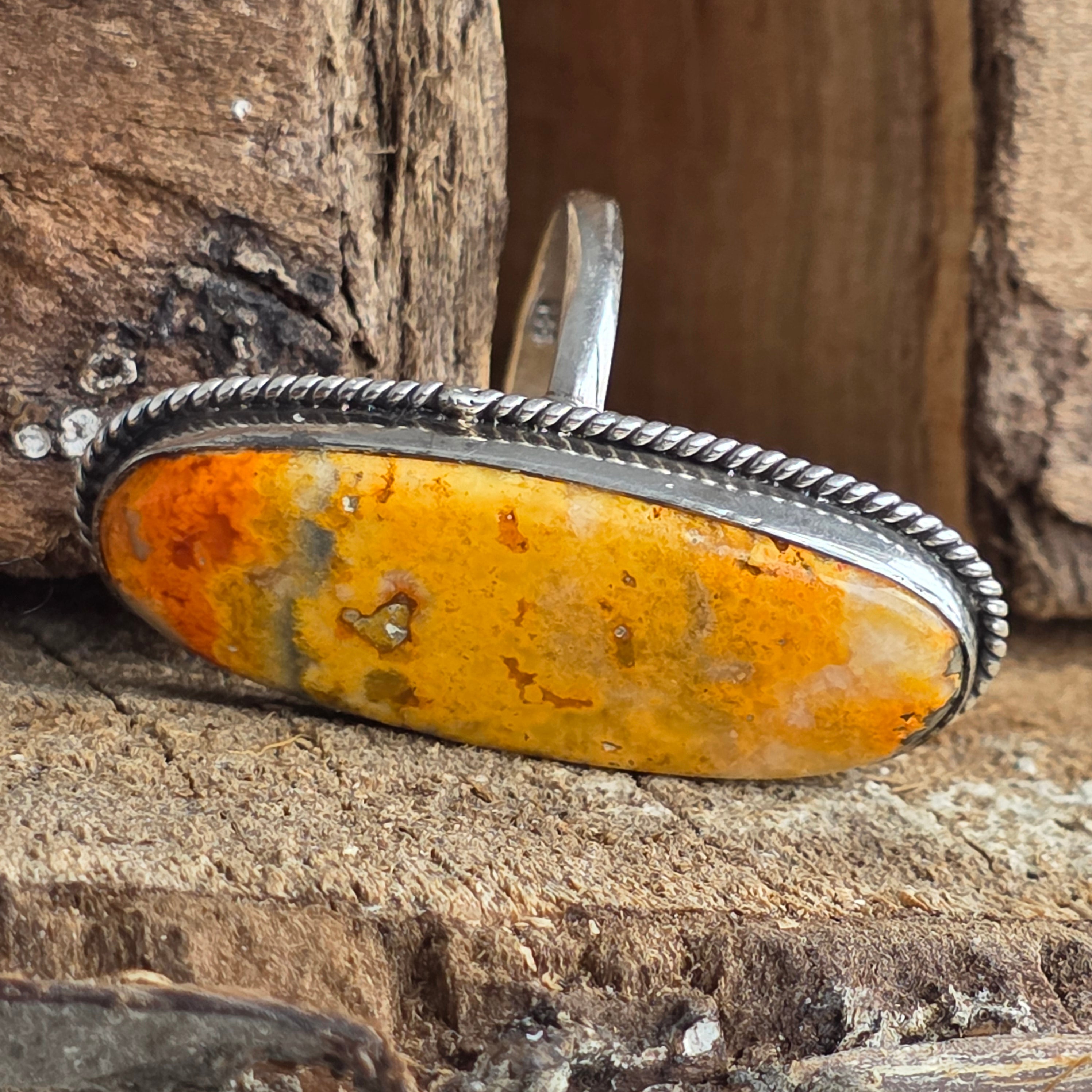 Un inel spectaculos, realizat din argint 925, cu o piatră impresionantă de Bumblebee Jasper, cunoscută pentru amestecul vibrant de tonuri galbene, portocalii și gri-aurii. Modelul wire work lucrat manual încadrează piatra cu finețe, accentuându-i nuanțele calde și textura naturală.