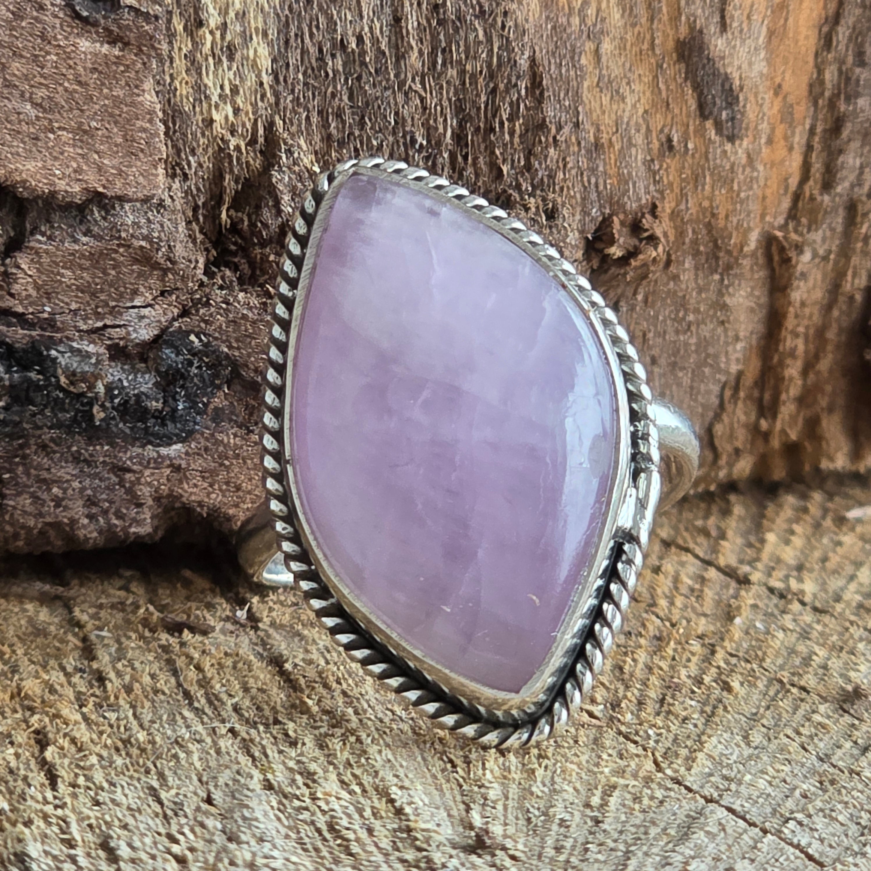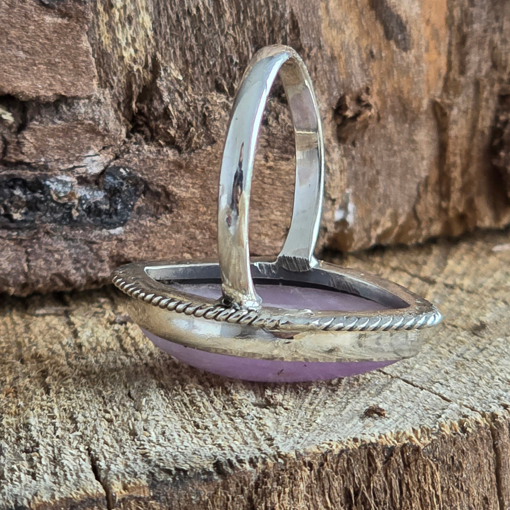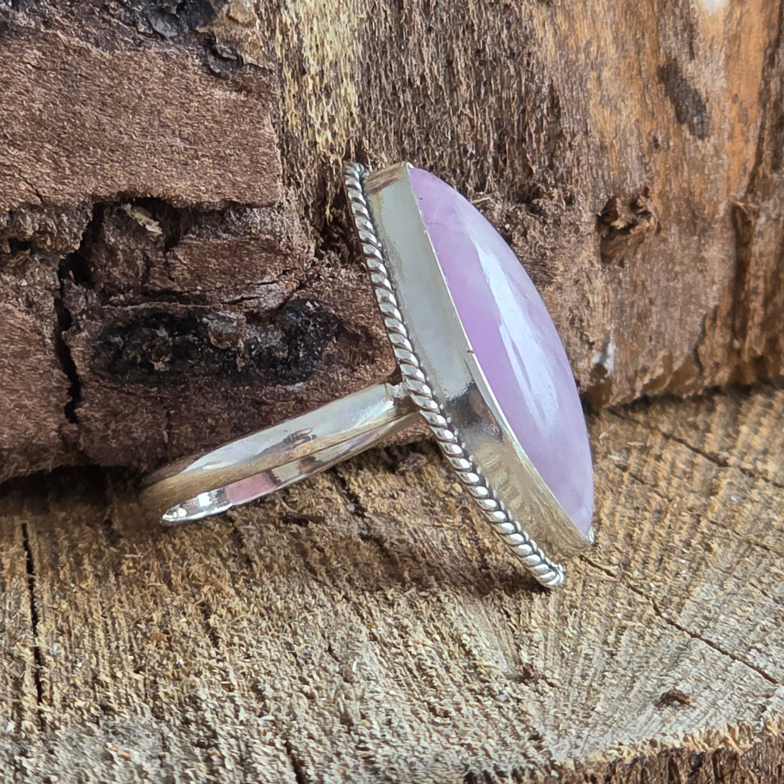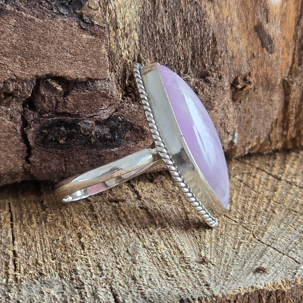 Un inel rafinat din argint 925, care poartă în centrul său delicatețea unei pietre de kunzit natural – cu tonuri fine de roz pal și reflexe translucide ce par să respire lumină.