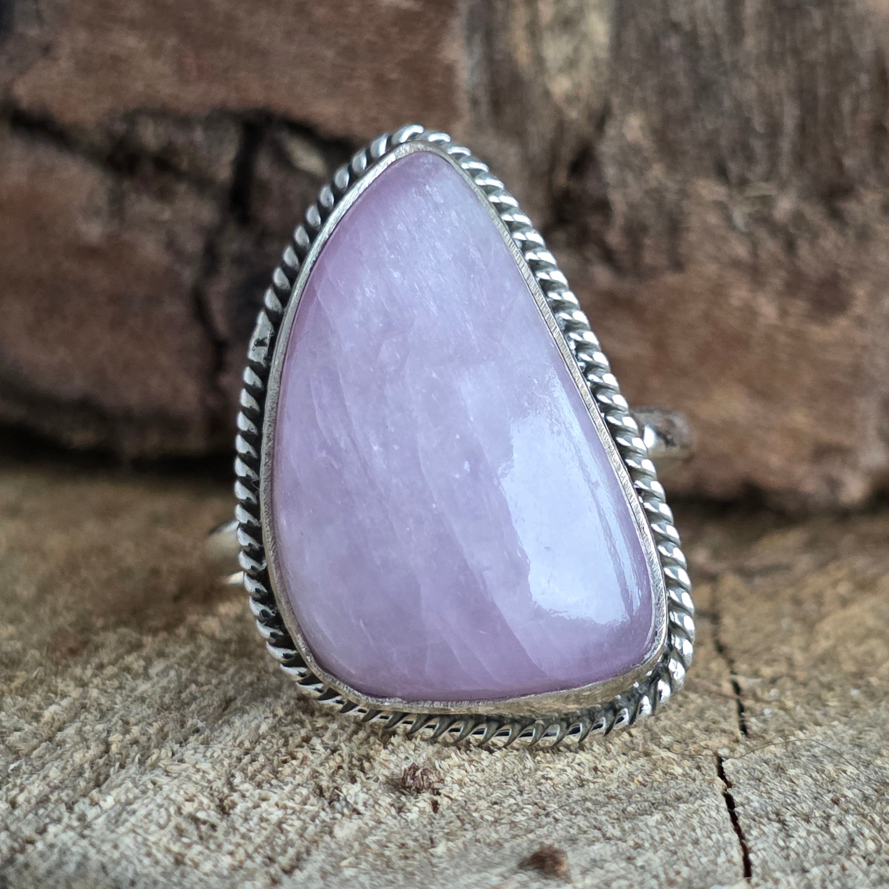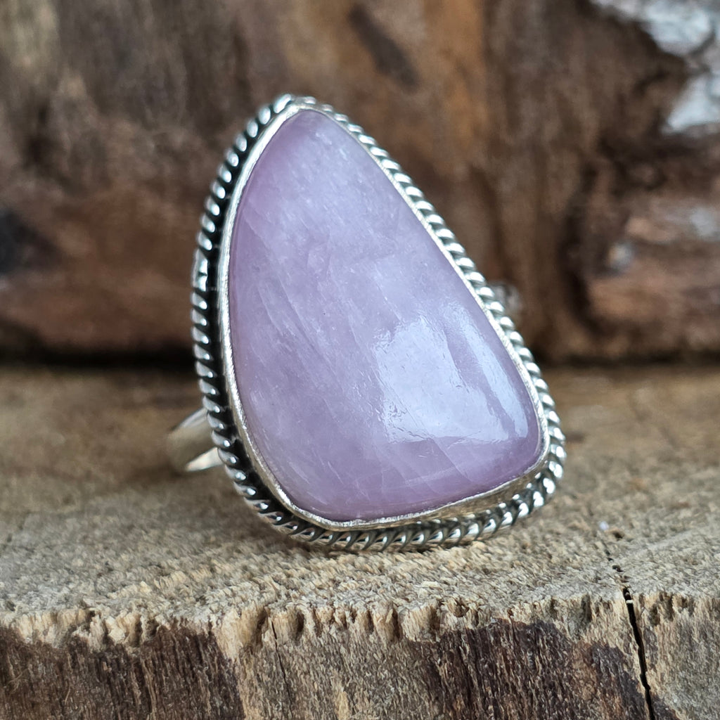 Un inel rafinat din argint 925, care poartă în centrul său delicatețea unei pietre de kunzit natural – cu tonuri fine de roz pal și reflexe translucide ce par să respire lumină.