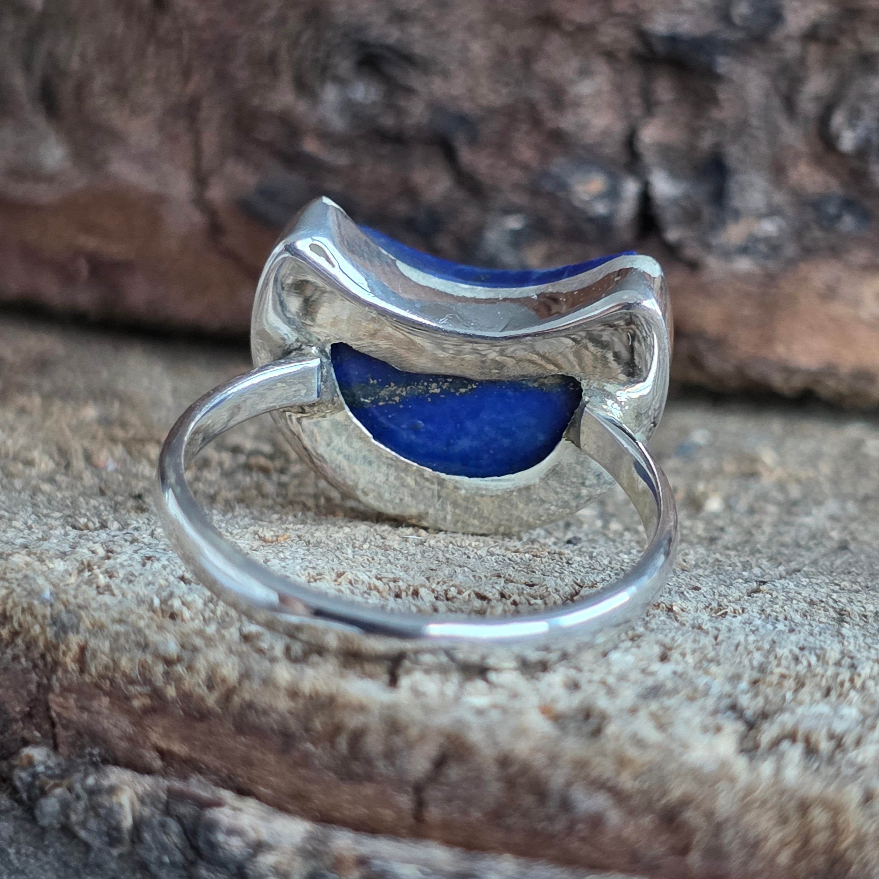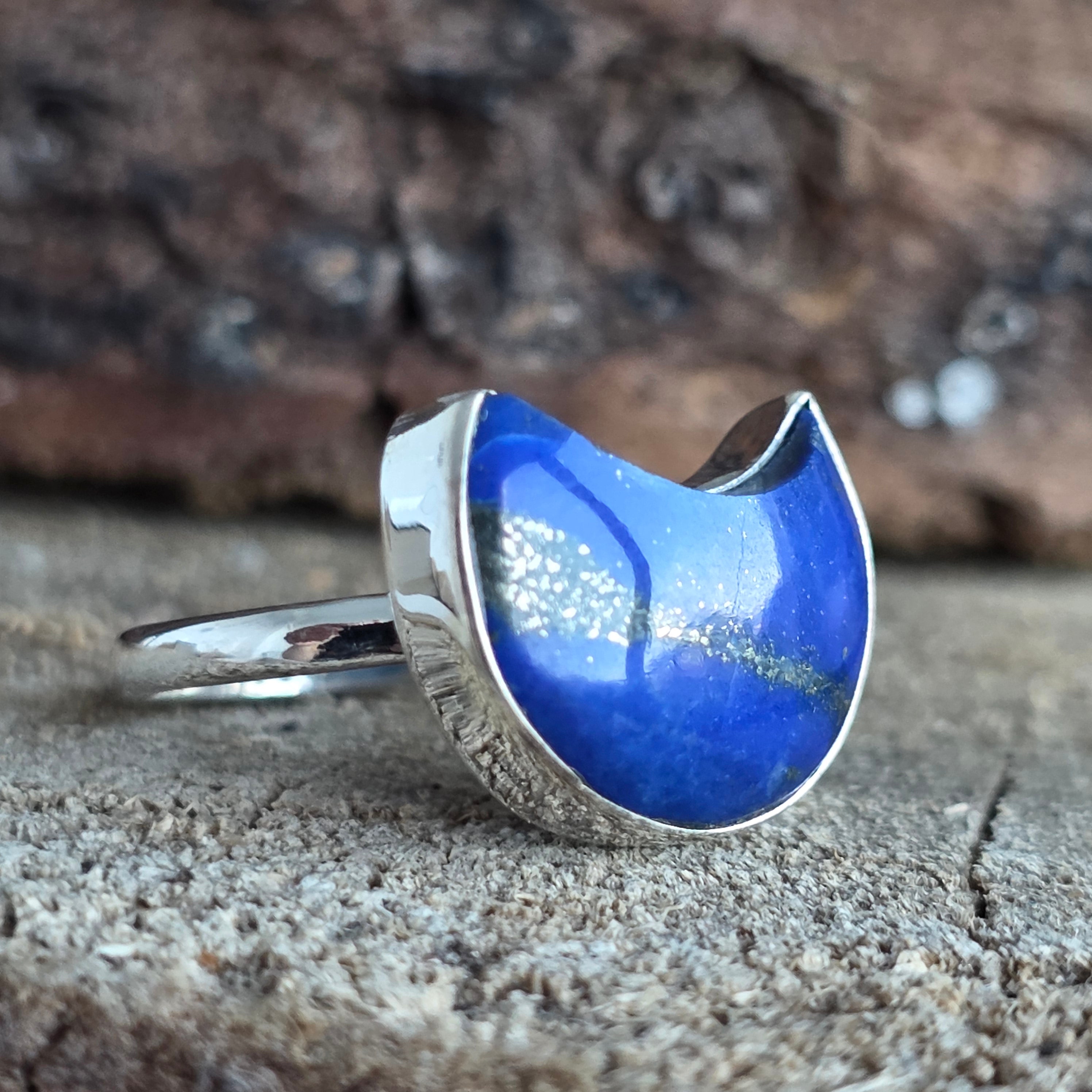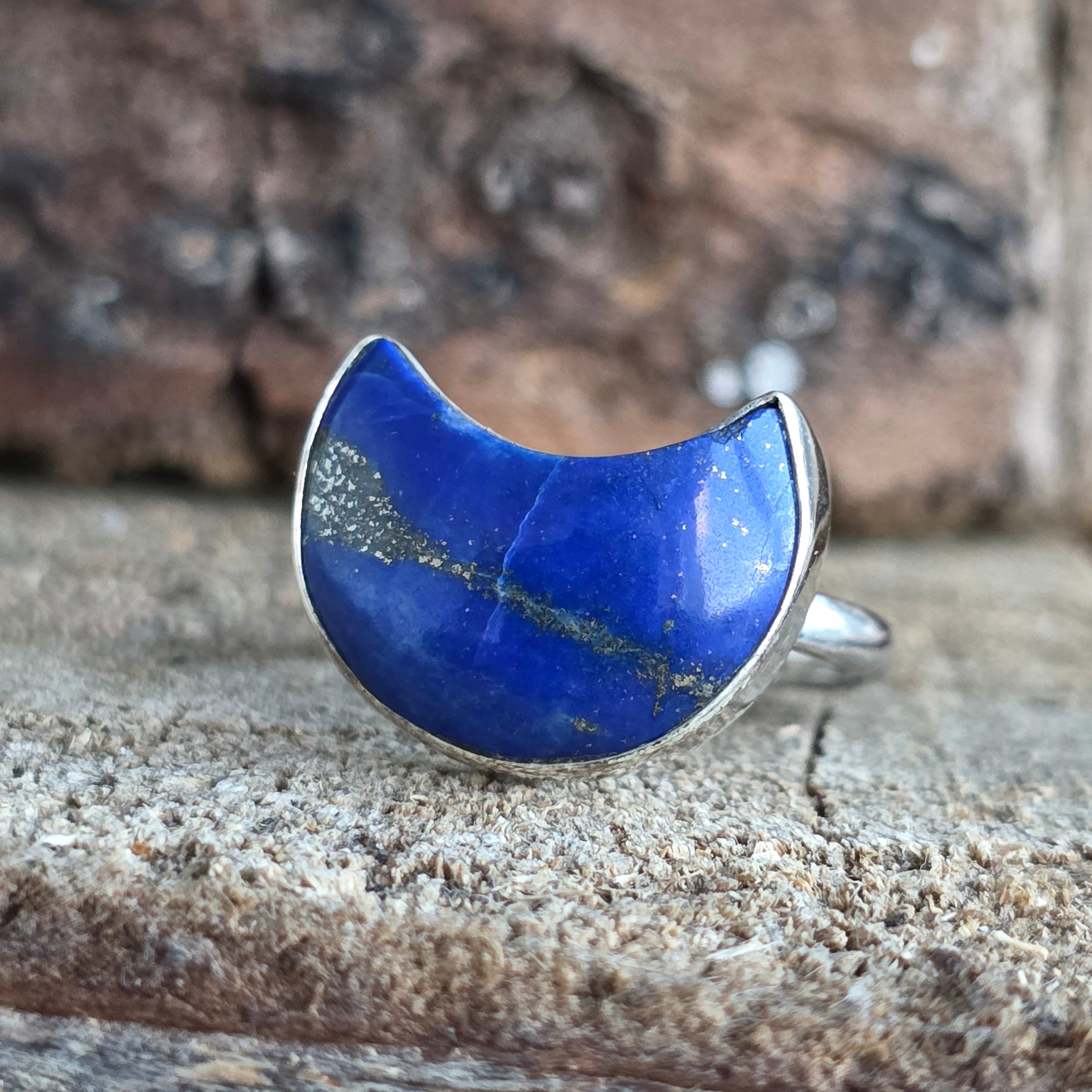 Un inel cu o formă inedită, inspirată de energia lunii – simbol al intuiției și transformării. Piatra naturală de lapis lazuli, cu reflexe aurii de pirită și tonuri adânci de albastru regal, evocă cerul nopții presărat cu stele.