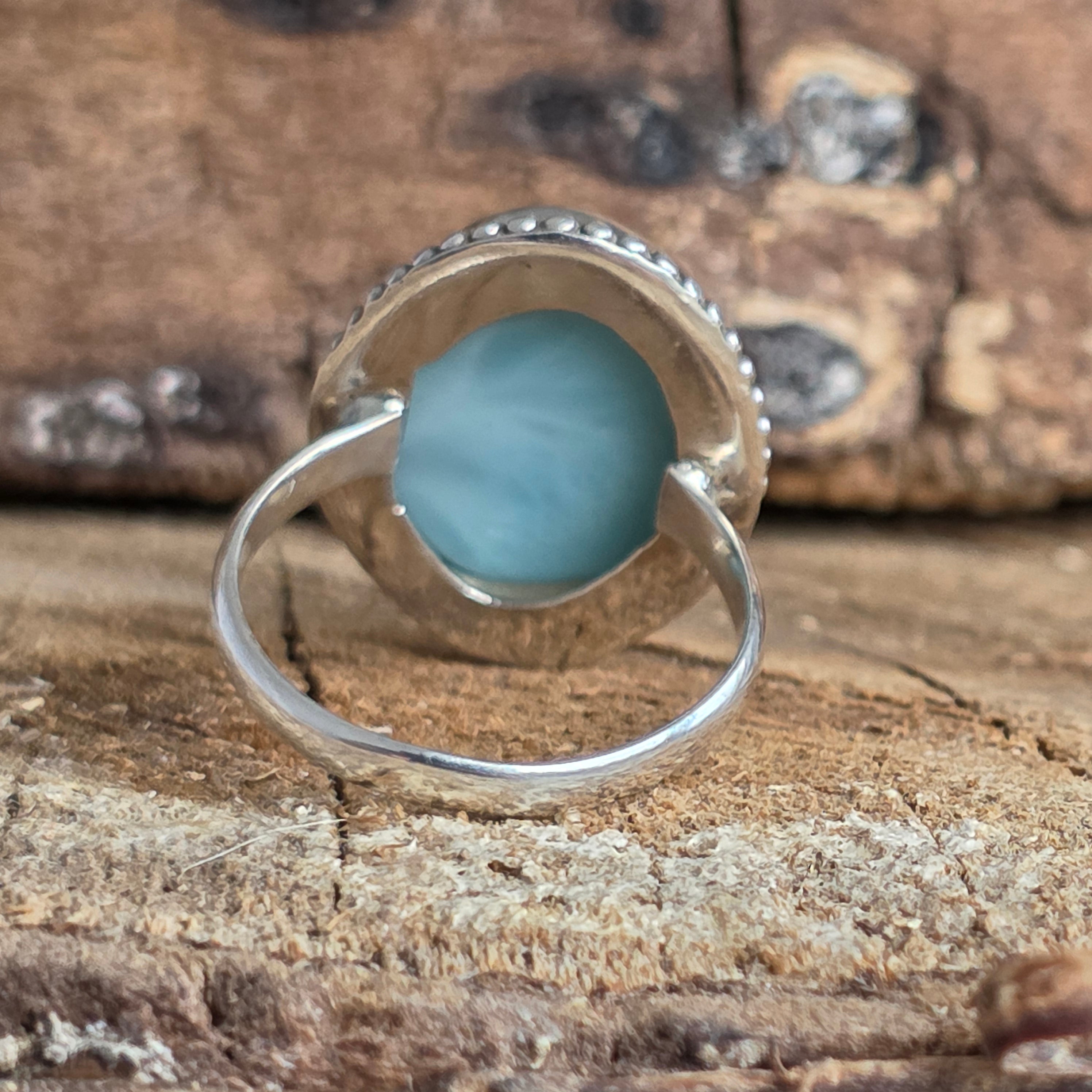 Un inel elegant din argint 925 cu larimar natural, în tonuri de albastru marin ce evocă apele Caraibelor. Detaliile rawa work lucrate manual adaugă profunzime și rafinament acestei bijuterii autentice.