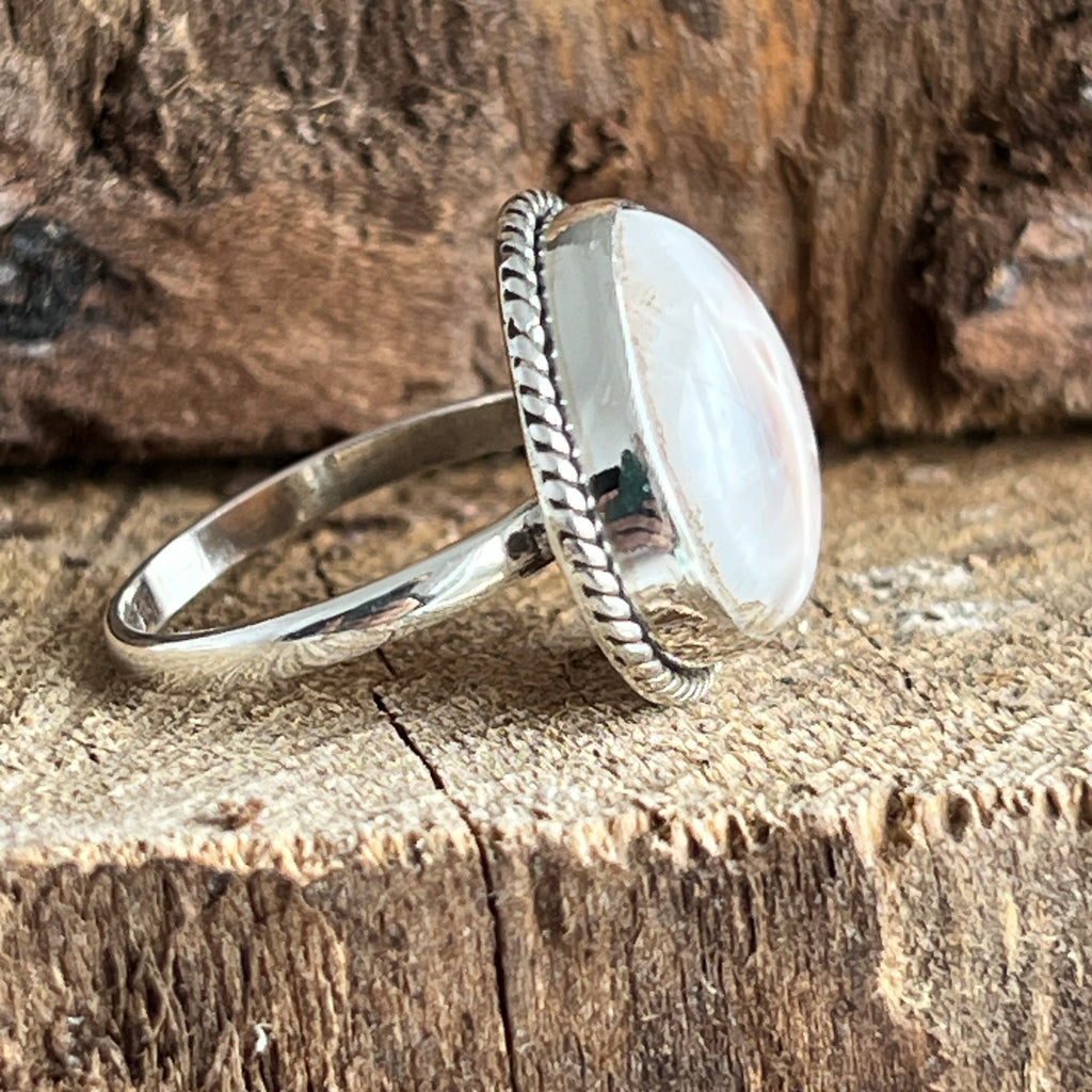 Acest inel din argint 925 emană o frumusețe delicată și calmă, grație pietrei de Pink Larimar, o varietate rară și rafinată, cu tonuri catifelate de roz pudrat și reflexe lăptoase.