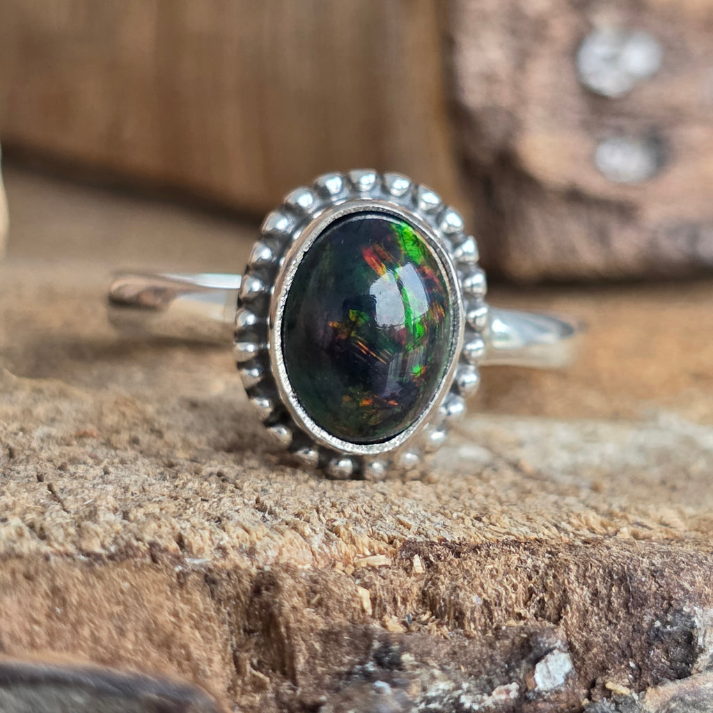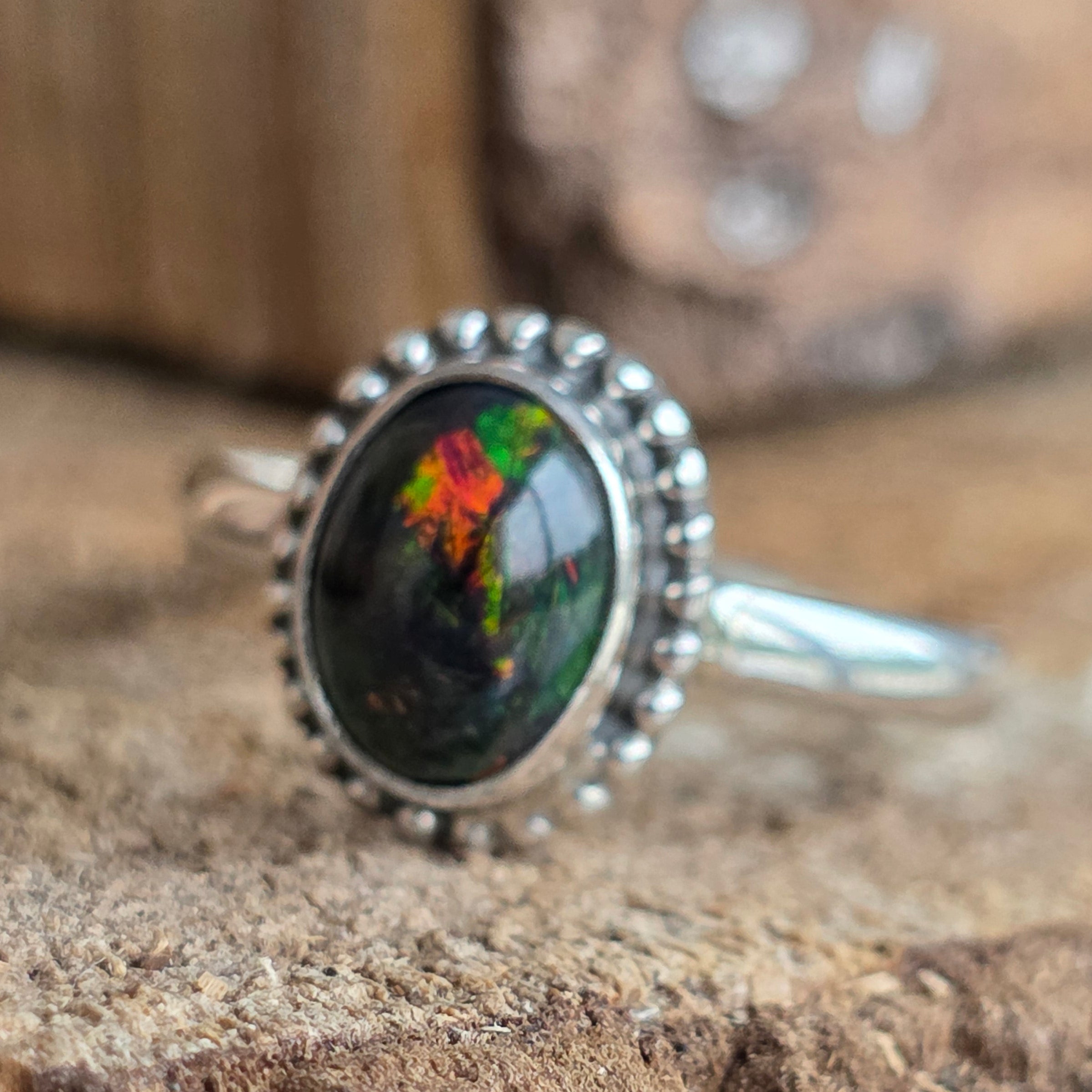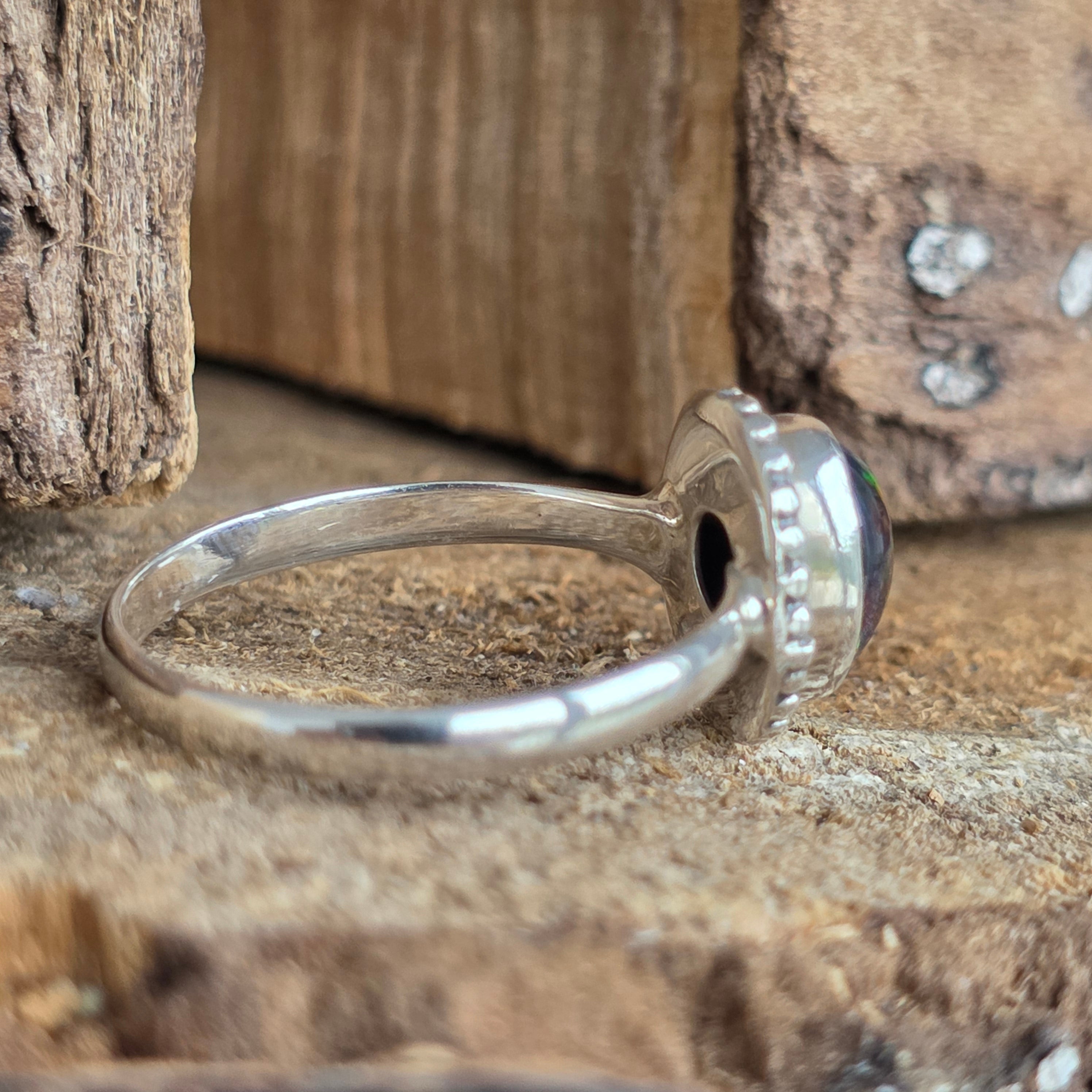 Un inel elegant și rafinat, realizat din argint 925, cu o piatră naturală de opal etiopian, cunoscută pentru reflexele sale irizante în nuanțe de verde, roșu și albastru. Designul minimalist plain wire setting permite pietrei să fie în centrul atenției, captând lumina din orice unghi.