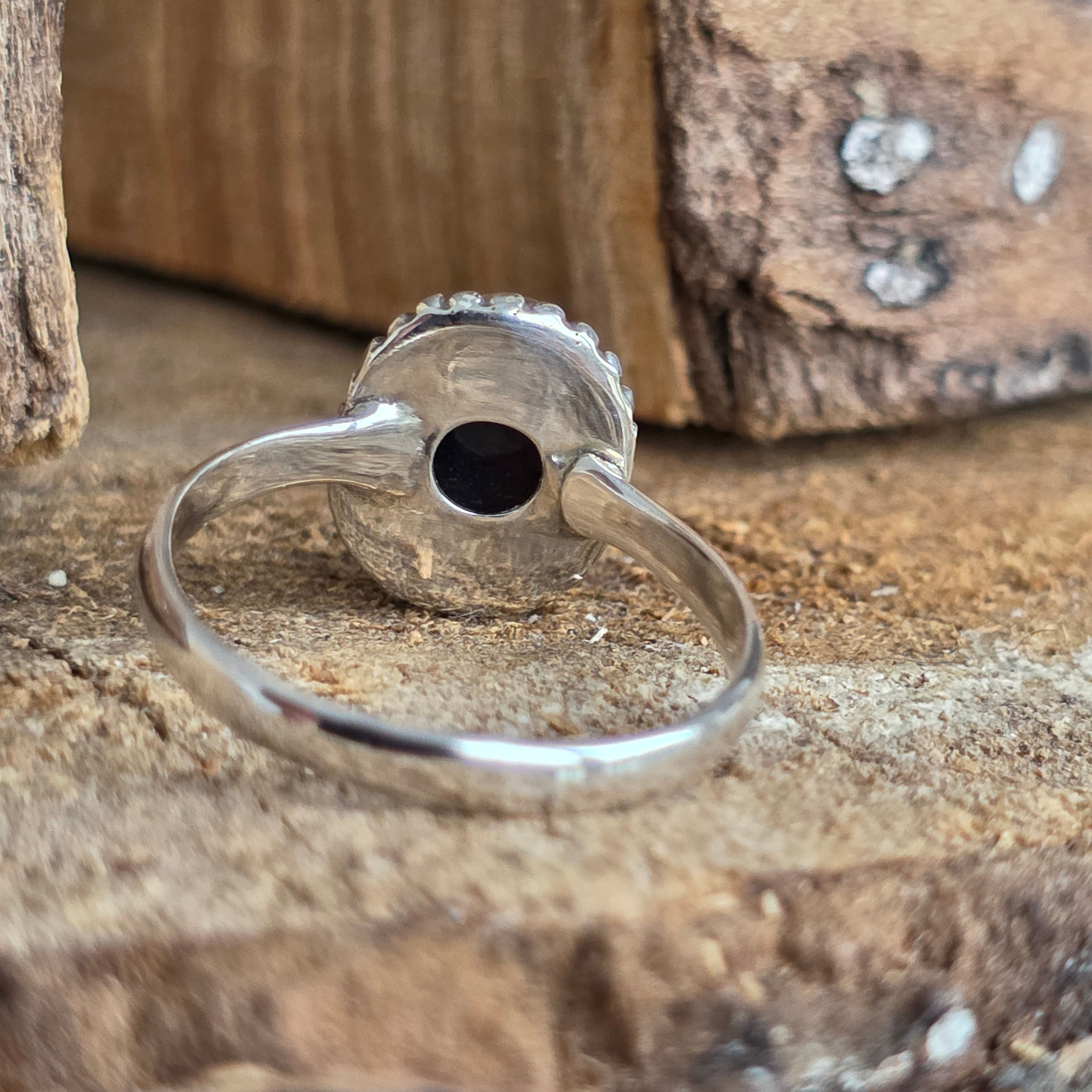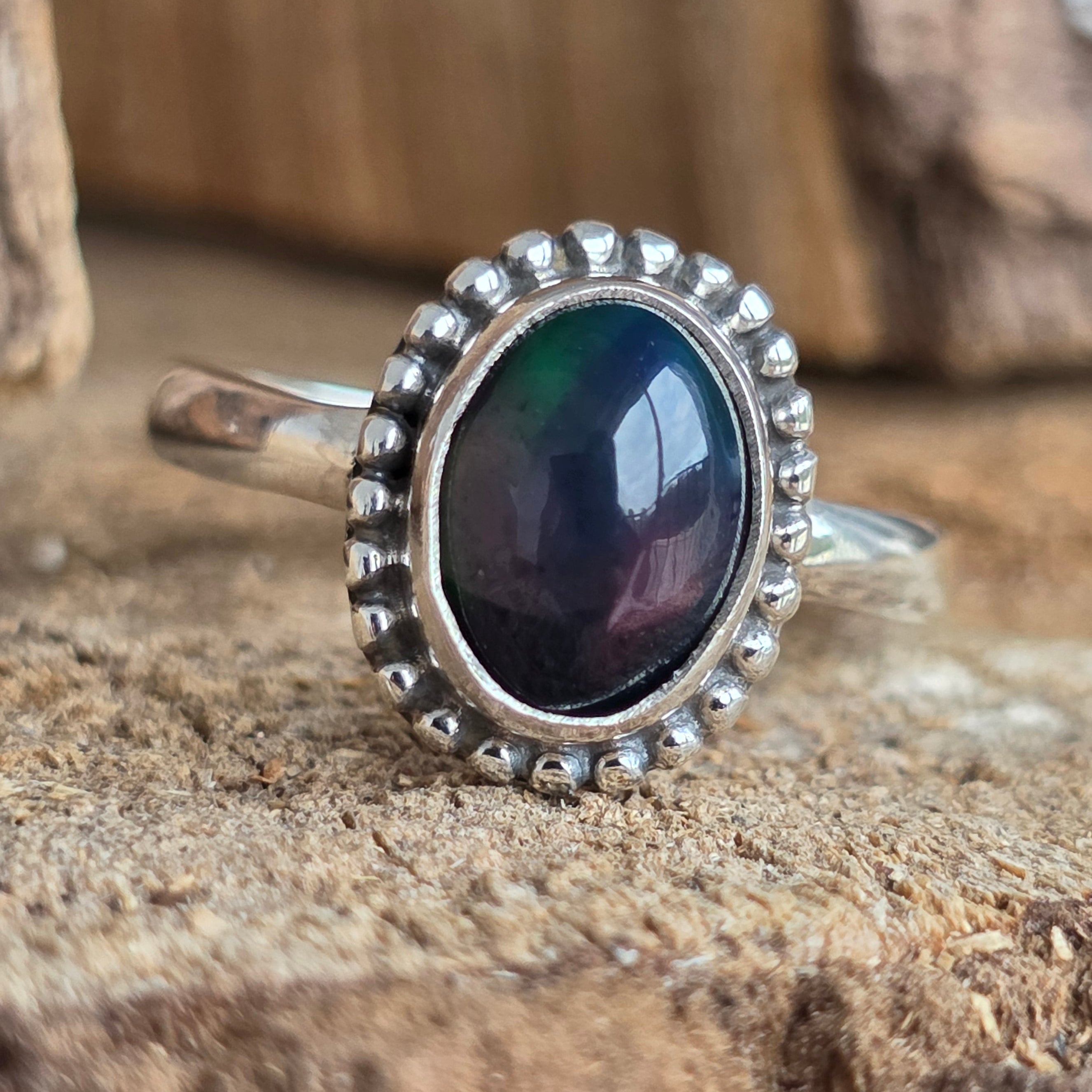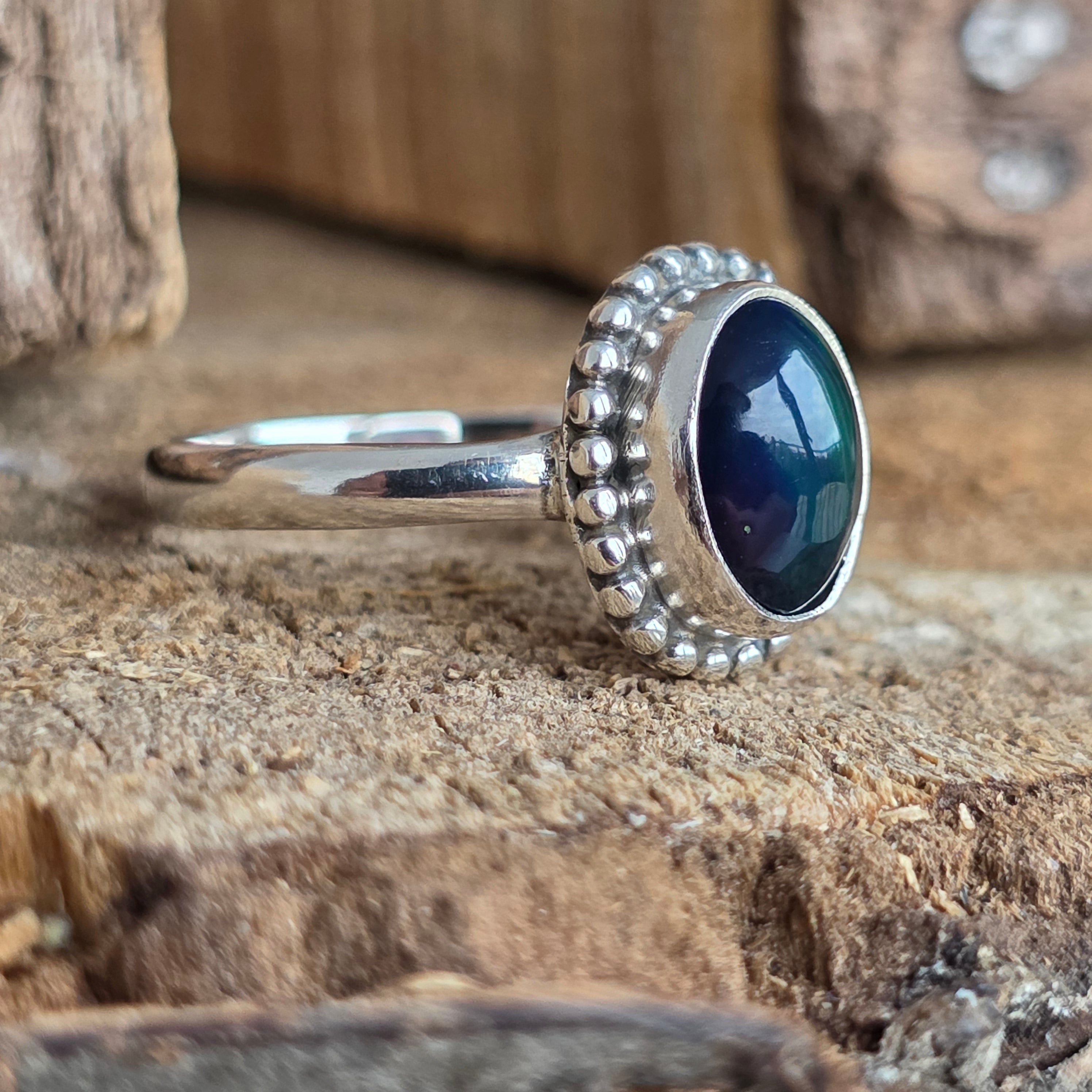 Un inel elegant și rafinat, realizat din argint 925, cu o piatră naturală de opal etiopian, cunoscută pentru reflexele sale irizante în nuanțe de verde, roșu și albastru. Designul minimalist plain wire setting permite pietrei să fie în centrul atenției, captând lumina din orice unghi.