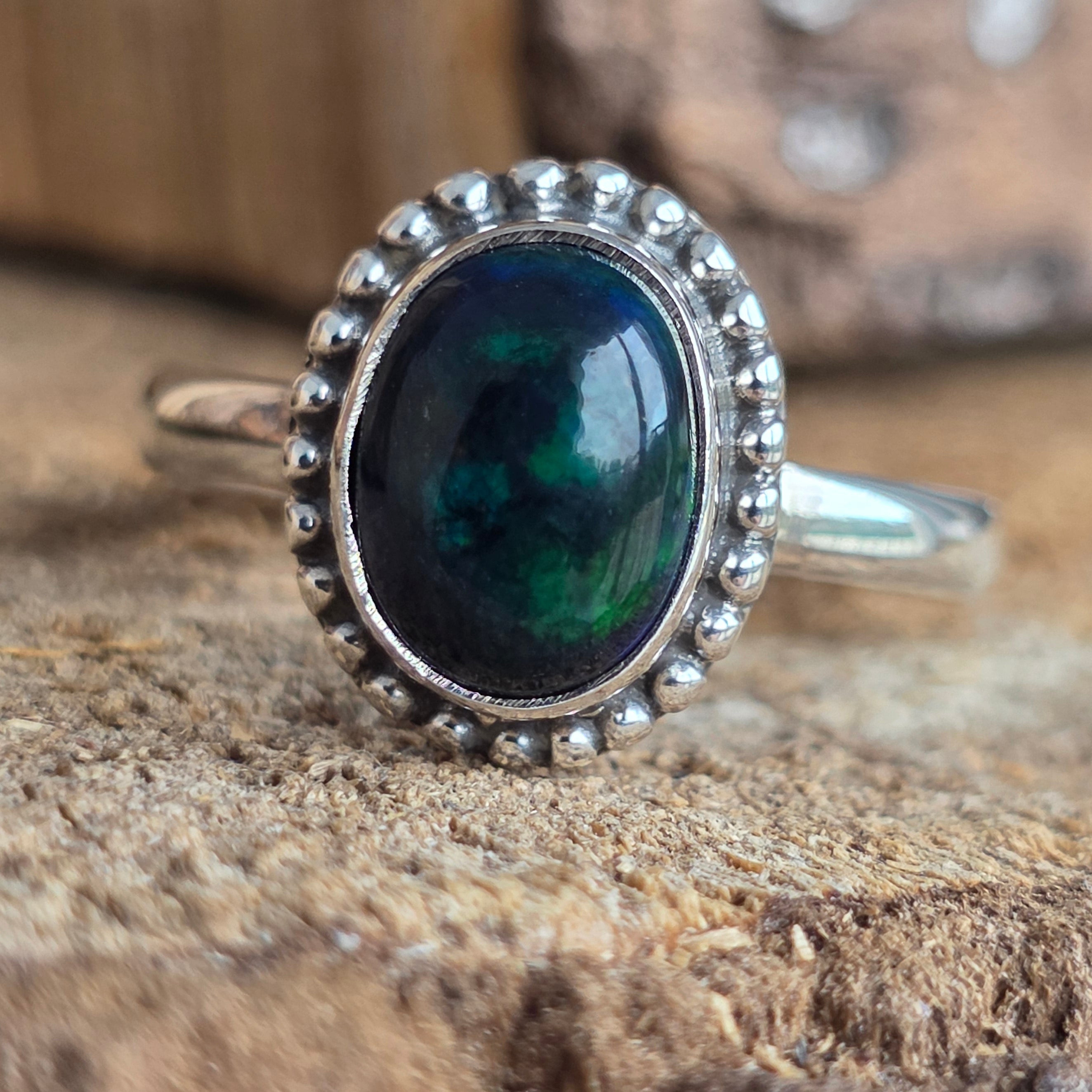 Un inel elegant și rafinat, realizat din argint 925, cu o piatră naturală de opal etiopian, cunoscută pentru reflexele sale irizante în nuanțe de verde, roșu și albastru. Designul minimalist plain wire setting permite pietrei să fie în centrul atenției, captând lumina din orice unghi.