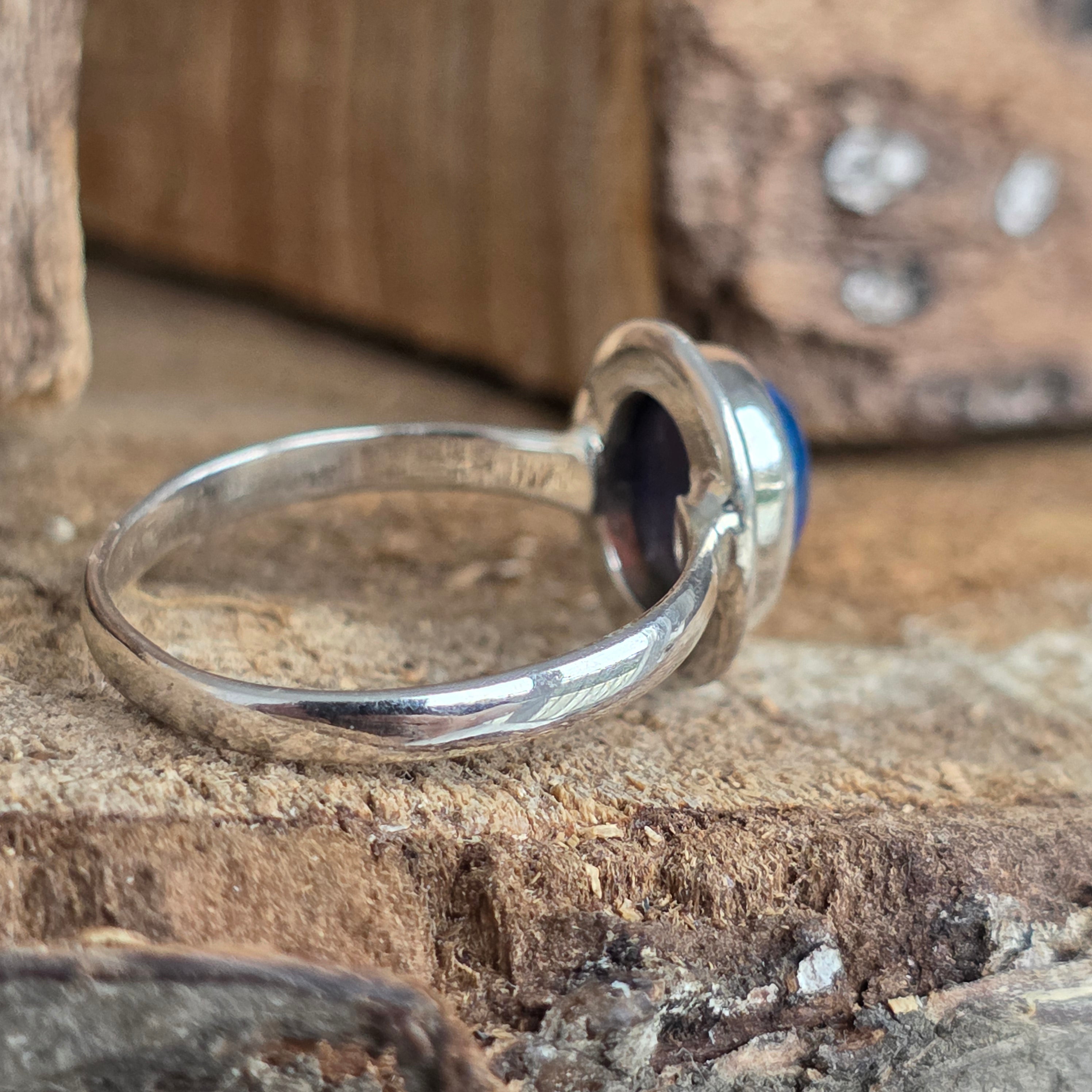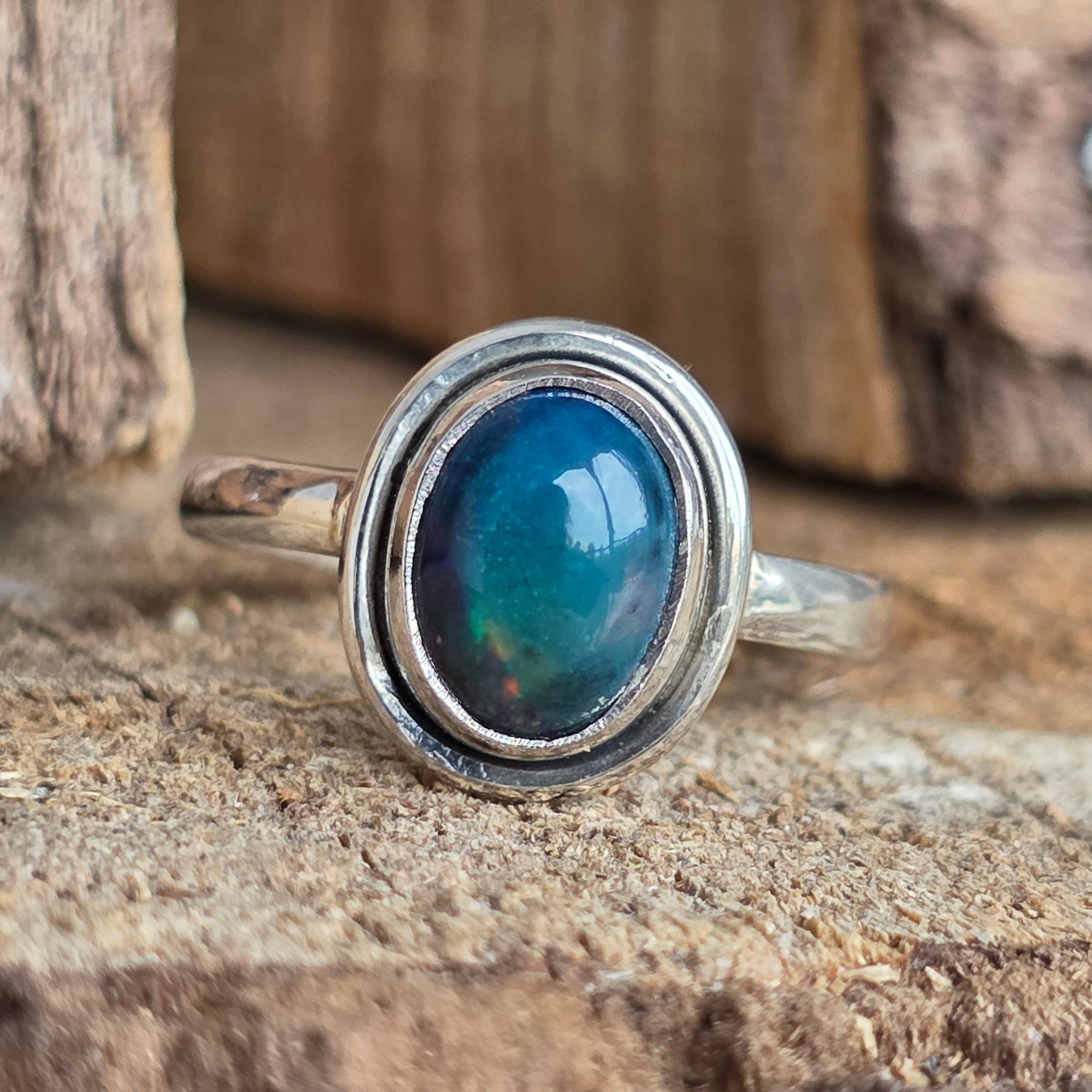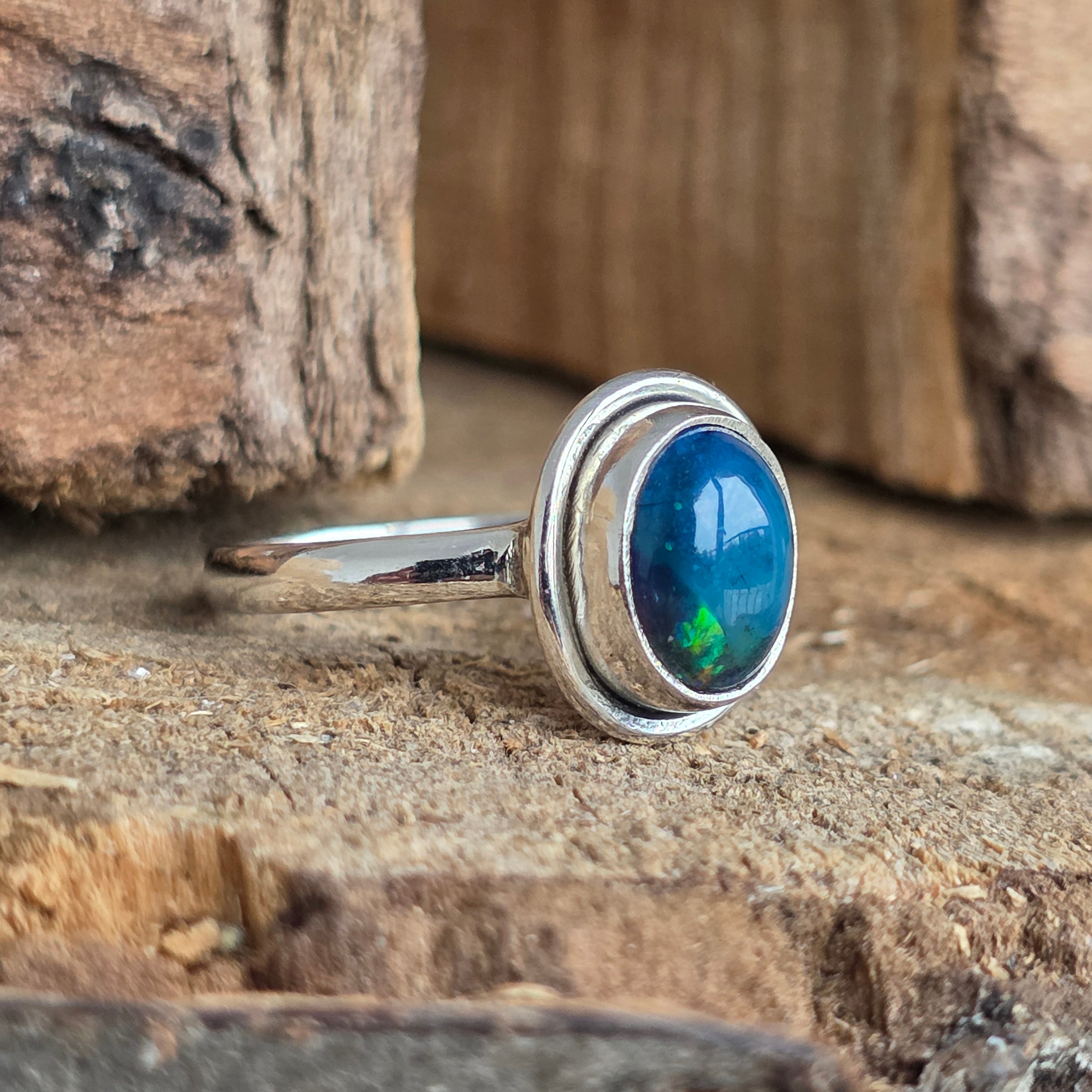Un inel elegant și rafinat, realizat din argint 925, cu o piatră naturală de opal etiopian, cunoscută pentru reflexele sale irizante în nuanțe de verde, roșu și albastru. Designul minimalist plain wire setting permite pietrei să fie în centrul atenției, captând lumina din orice unghi.