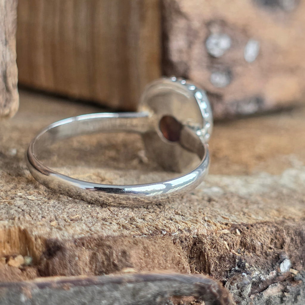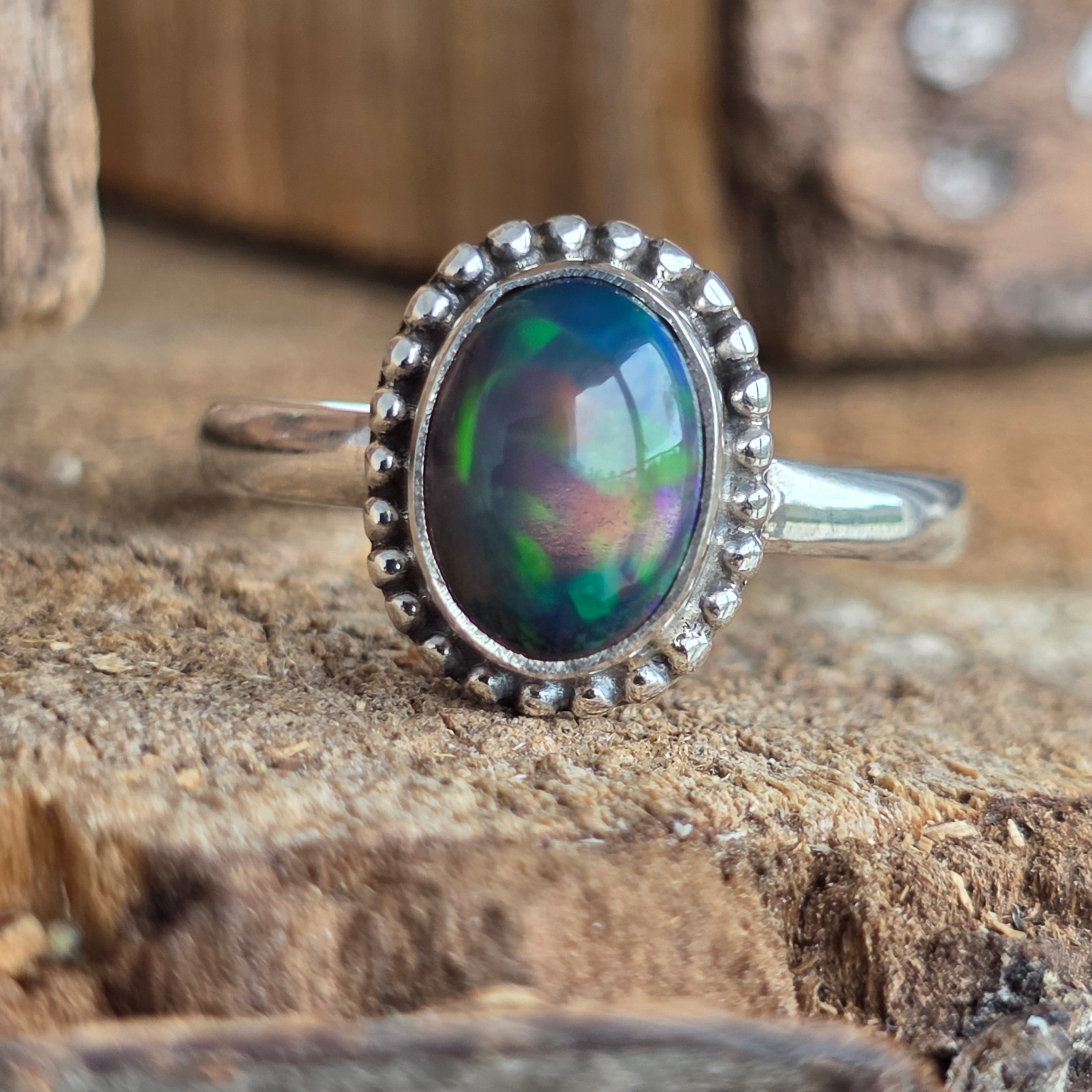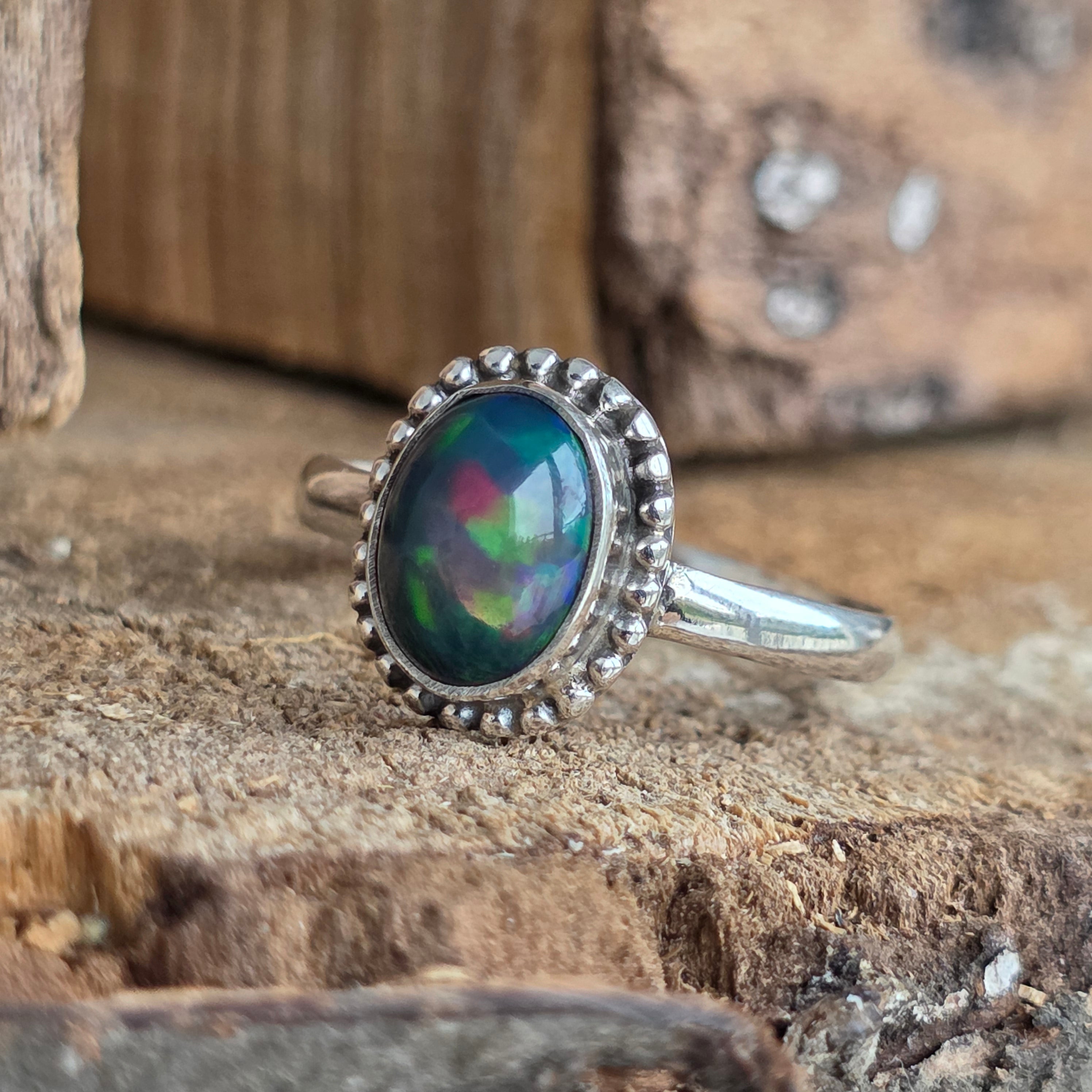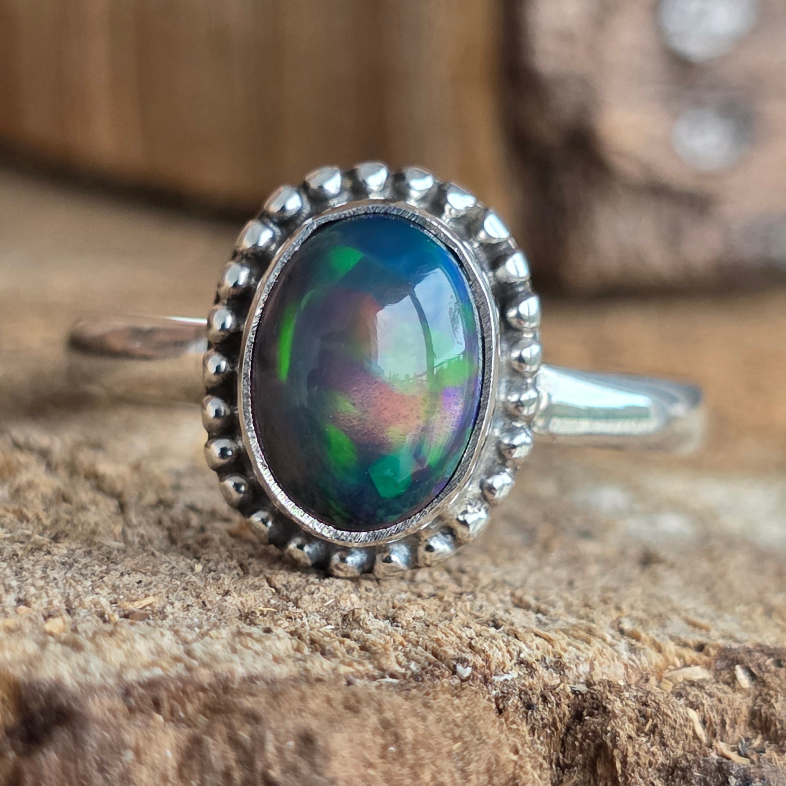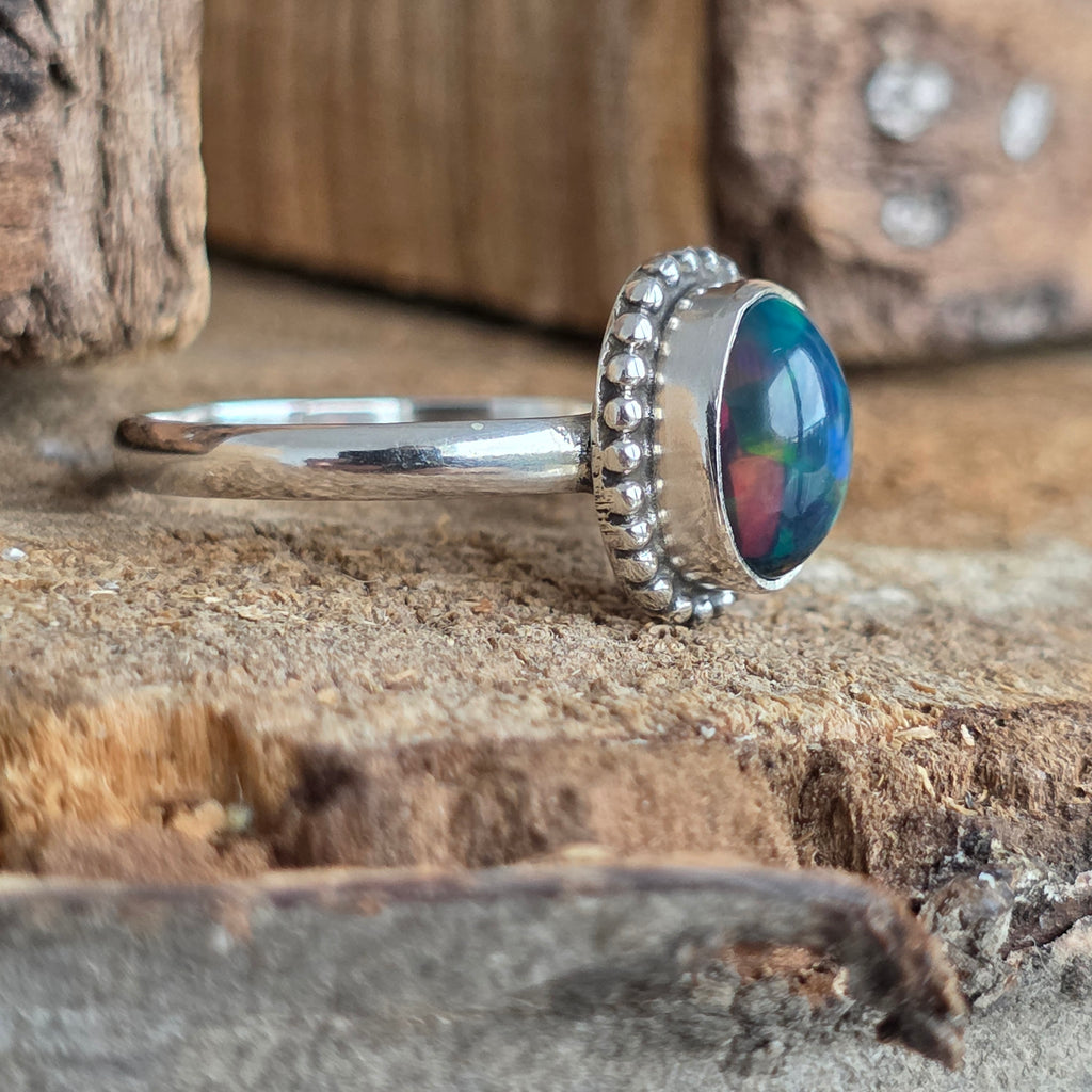 Un inel elegant și rafinat, realizat din argint 925, cu o piatră naturală de opal etiopian, cunoscută pentru reflexele sale irizante în nuanțe de verde, roșu și albastru. Designul minimalist plain wire setting permite pietrei să fie în centrul atenției, captând lumina din orice unghi.